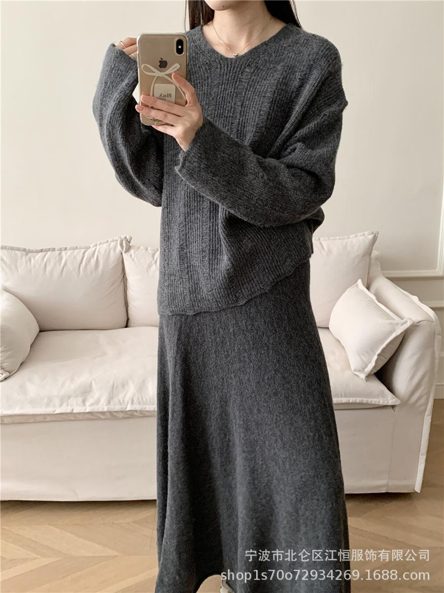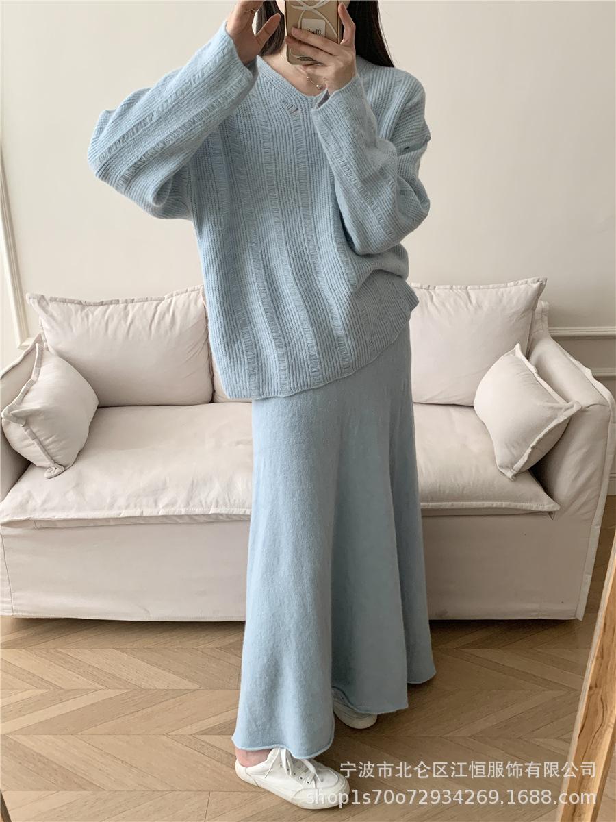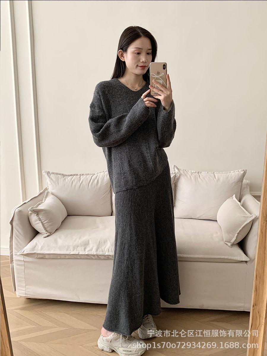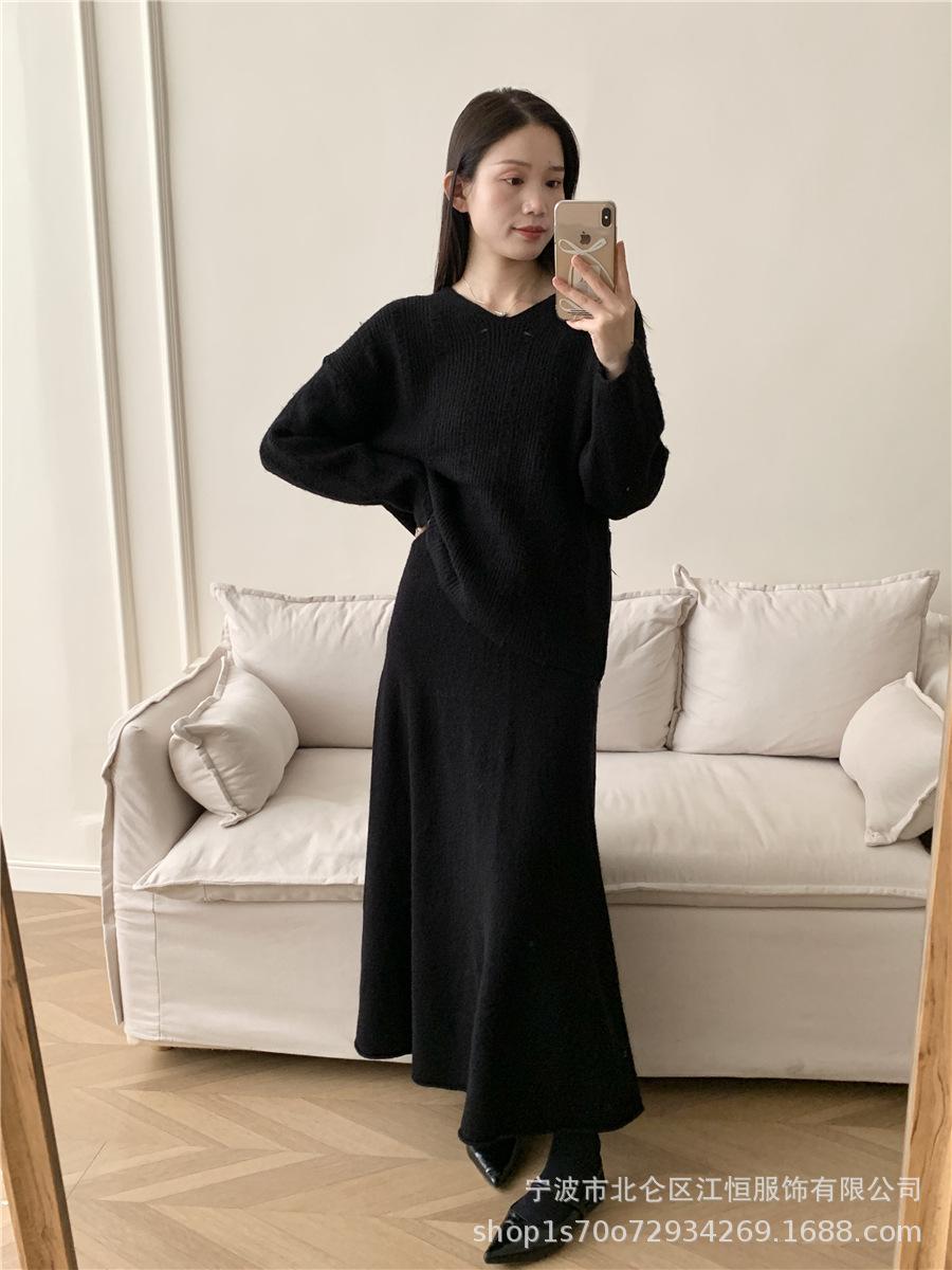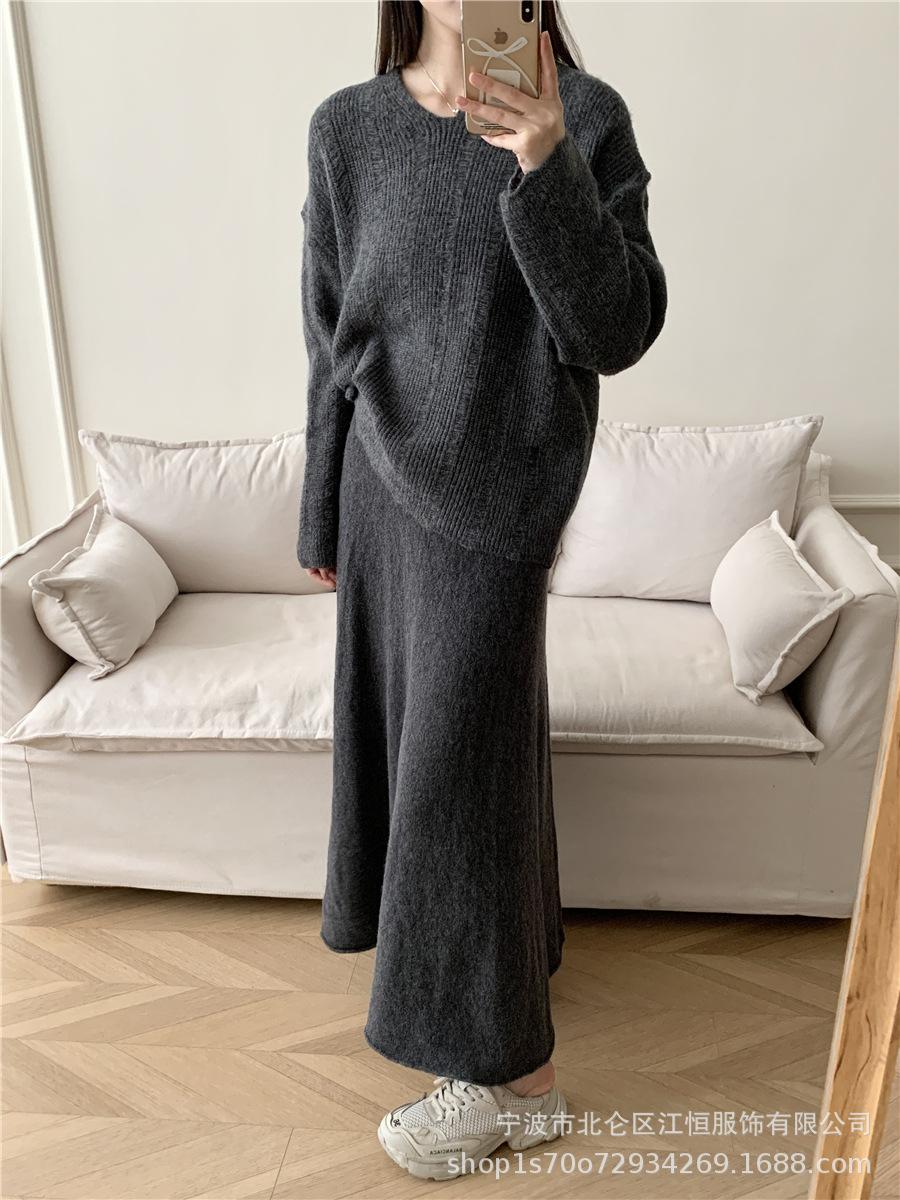 Traje de Suéter Tejido Estilo Europeo y Americano para Mujer 2025 Otoño e Invierno Nuevo Top de Lana Cuello Redondo Falda Cola de Pescado Venta Caliente Transfronteriza