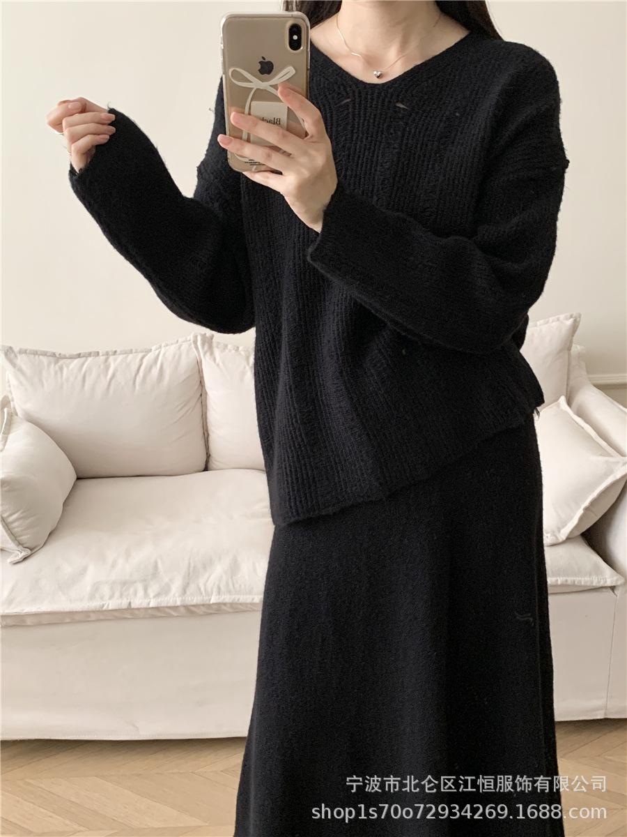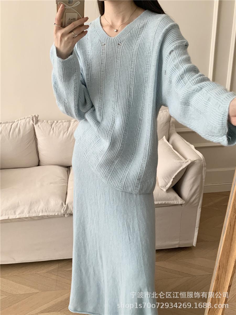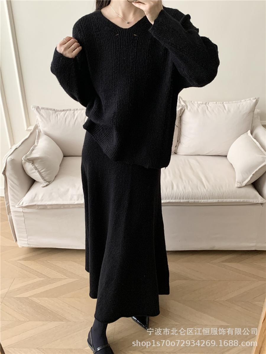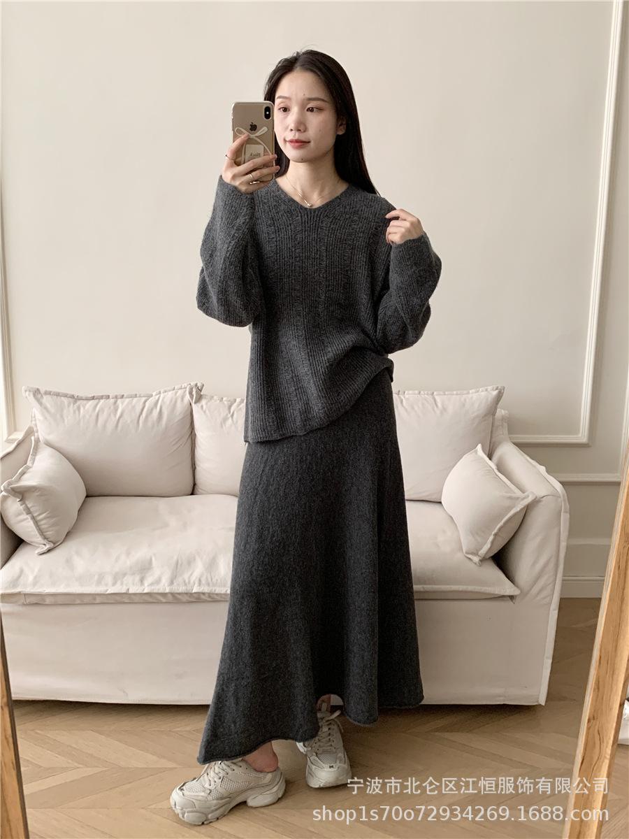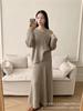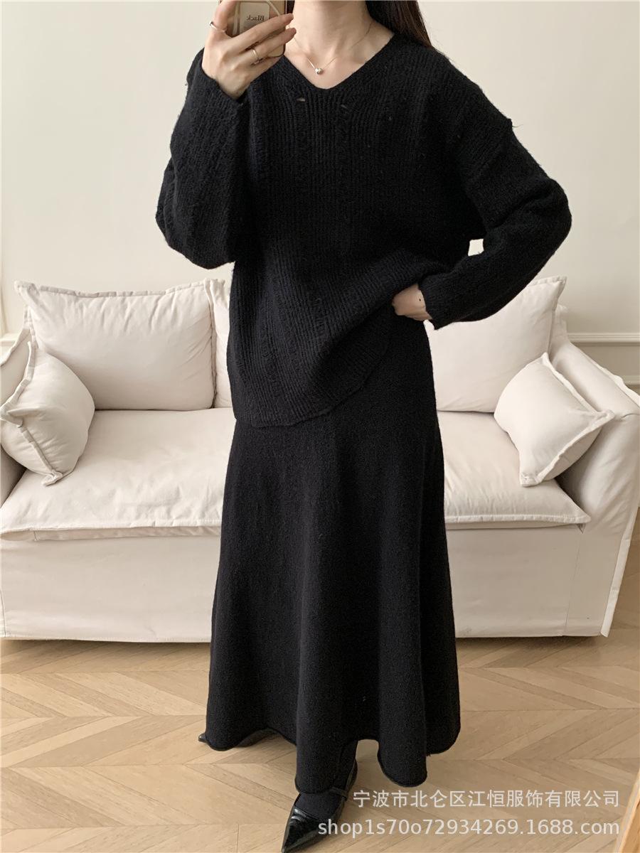 Traje de Suéter Tejido Estilo Europeo y Americano para Mujer 2025 Otoño e Invierno Nuevo Top de Lana Cuello Redondo Falda Cola de Pescado Venta Caliente Transfronteriza