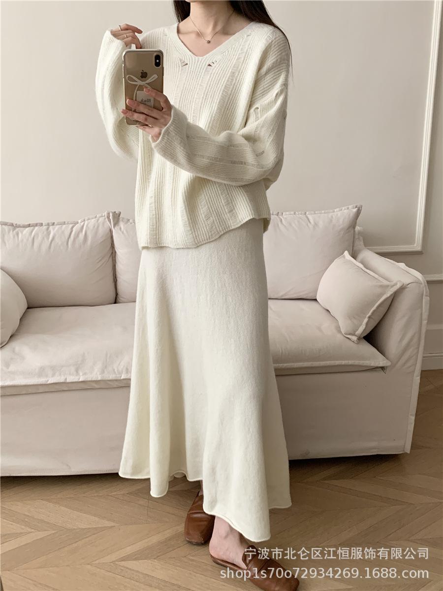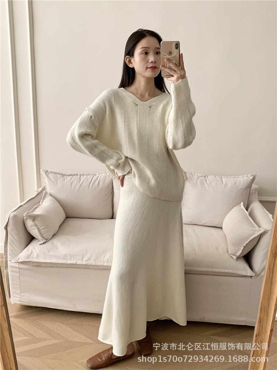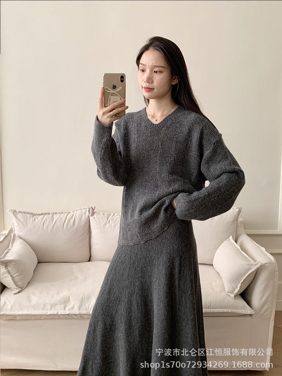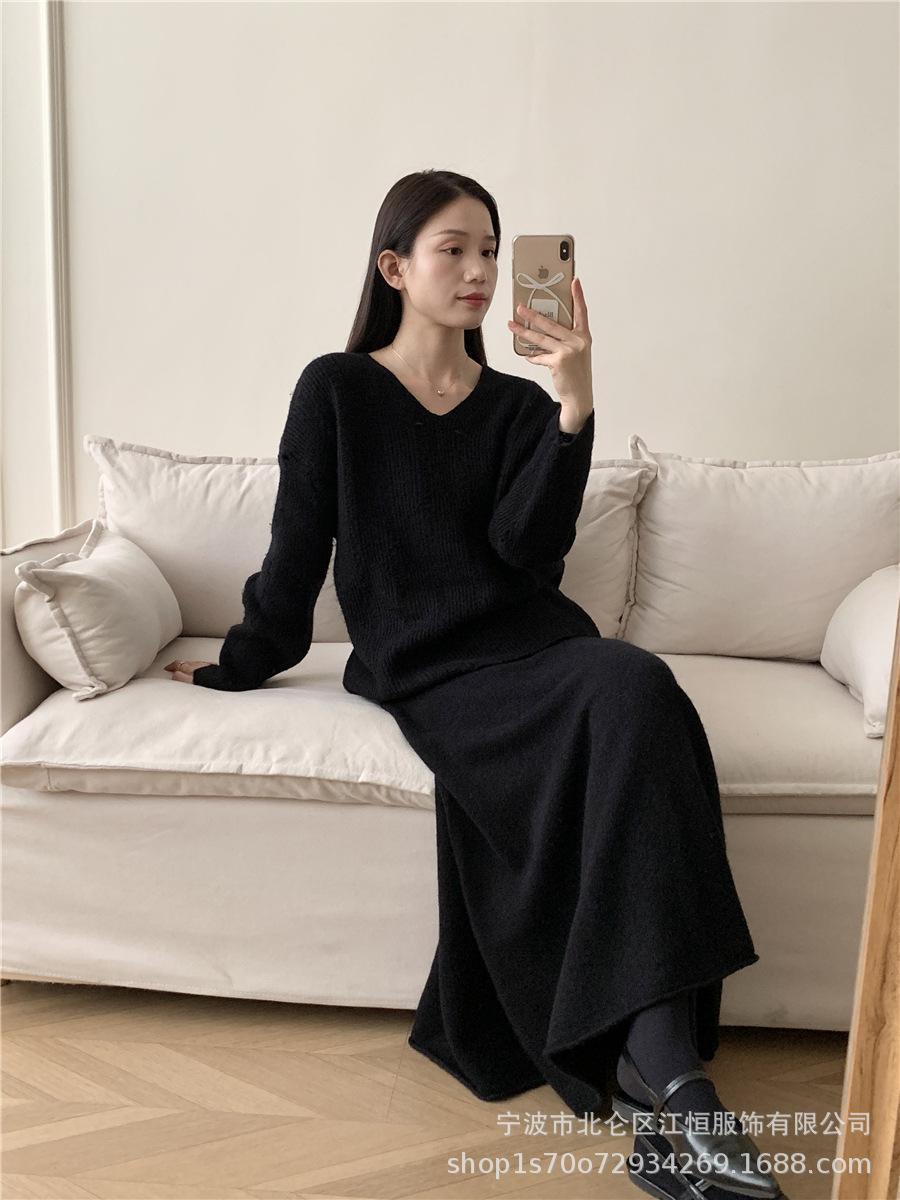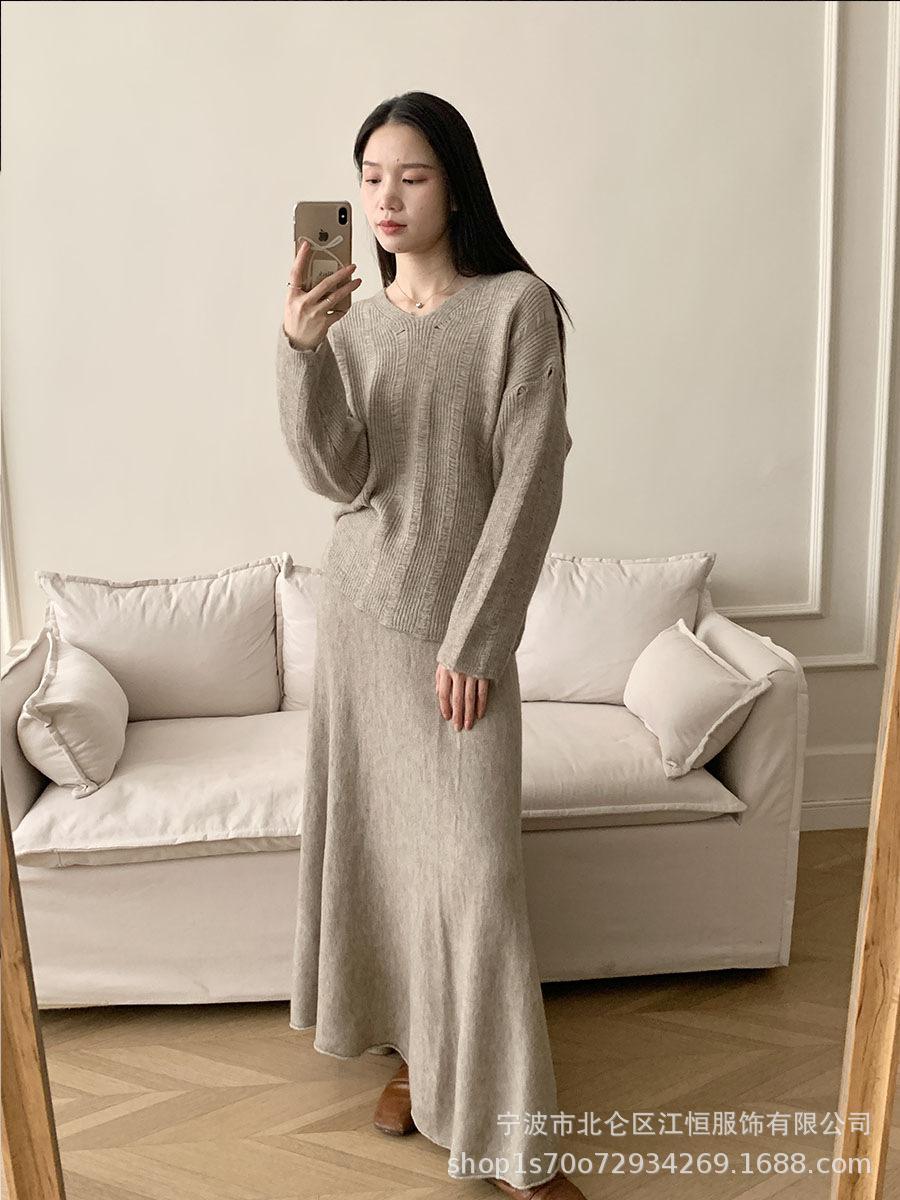 Traje de Suéter Tejido Estilo Europeo y Americano para Mujer 2025 Otoño e Invierno Nuevo Top de Lana Cuello Redondo Falda Cola de Pescado Venta Caliente Transfronteriza
