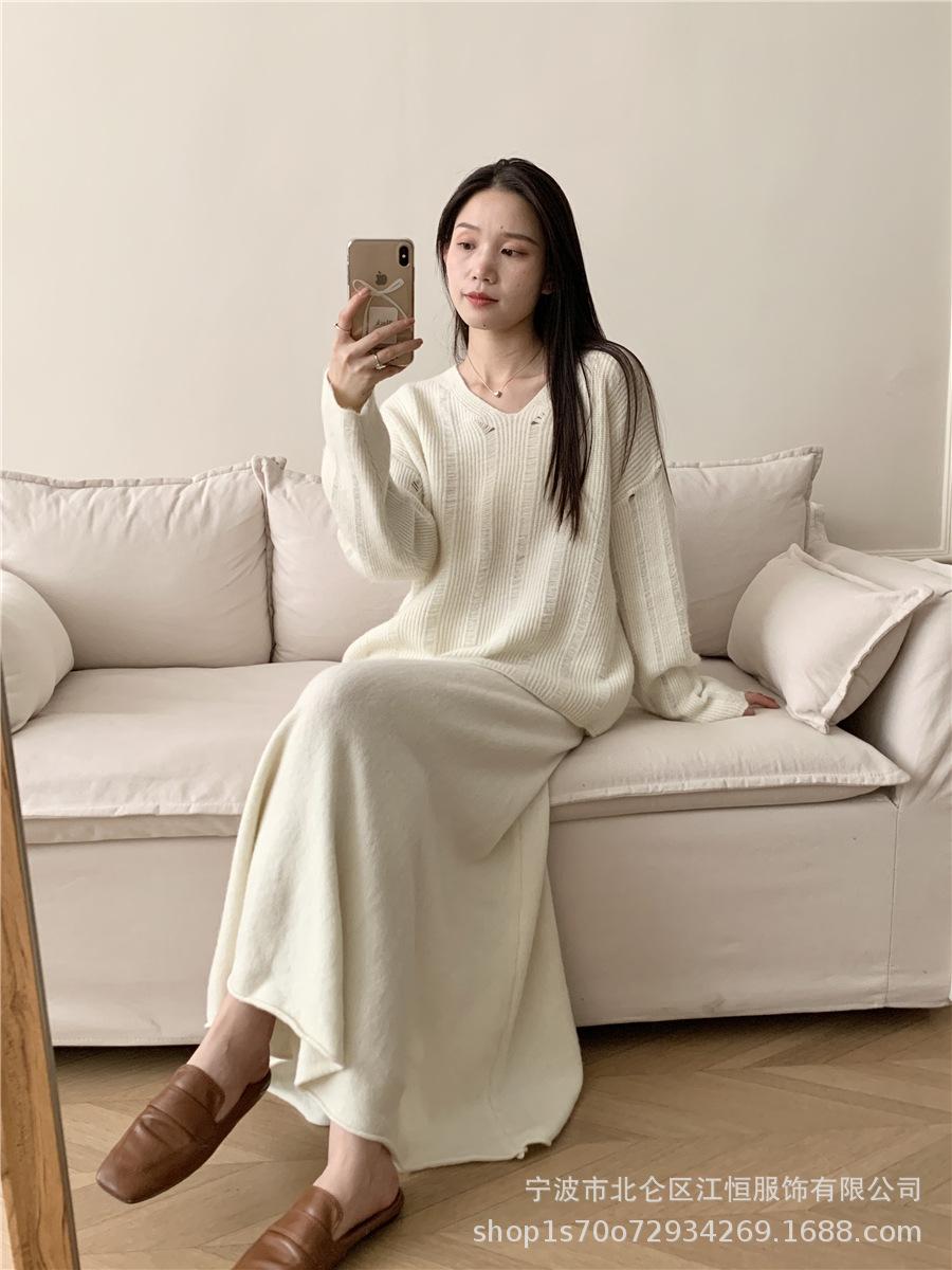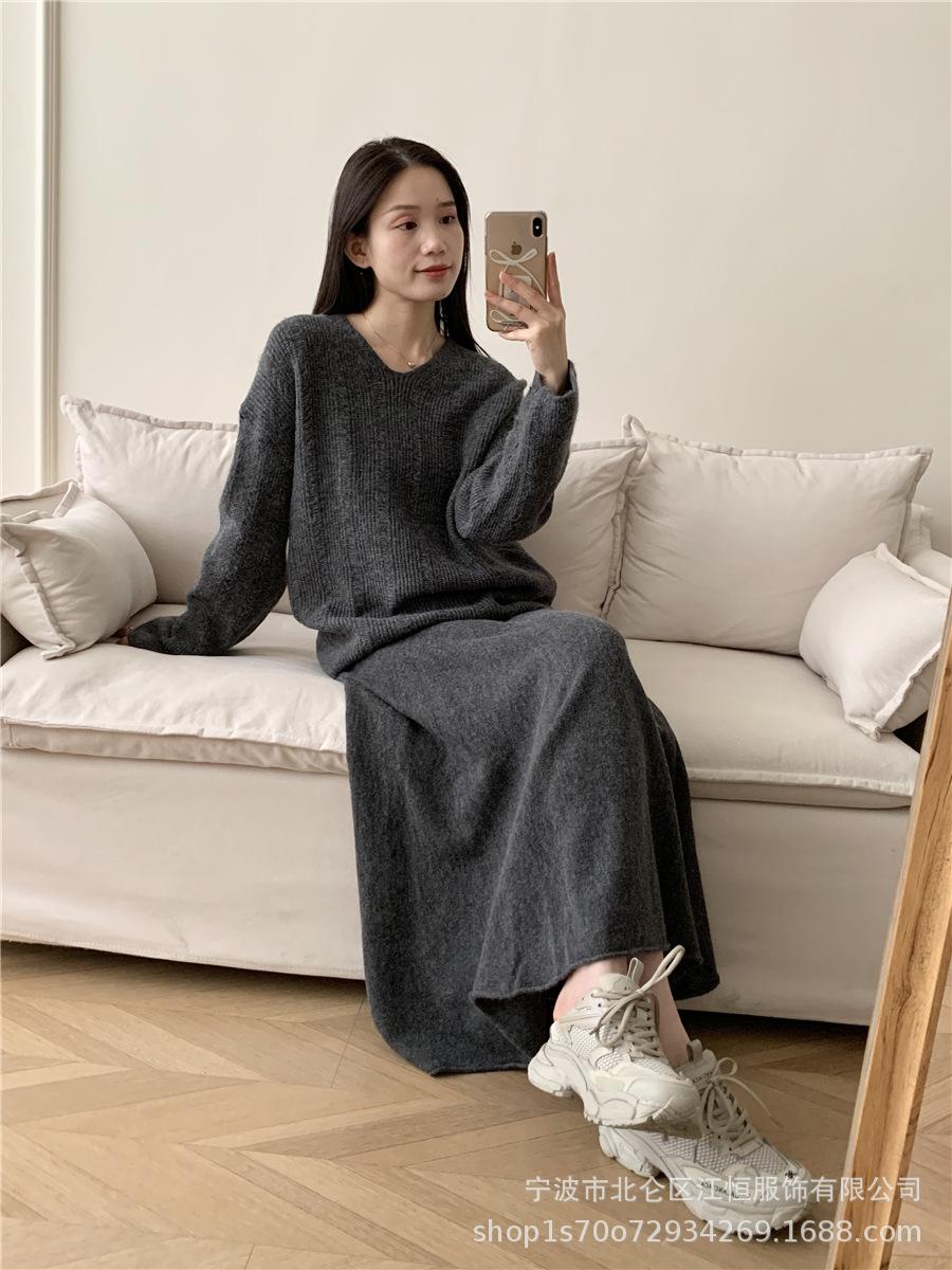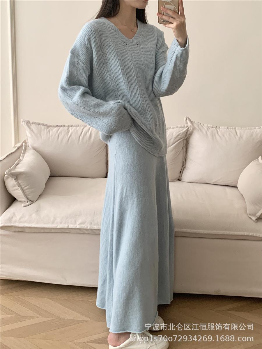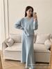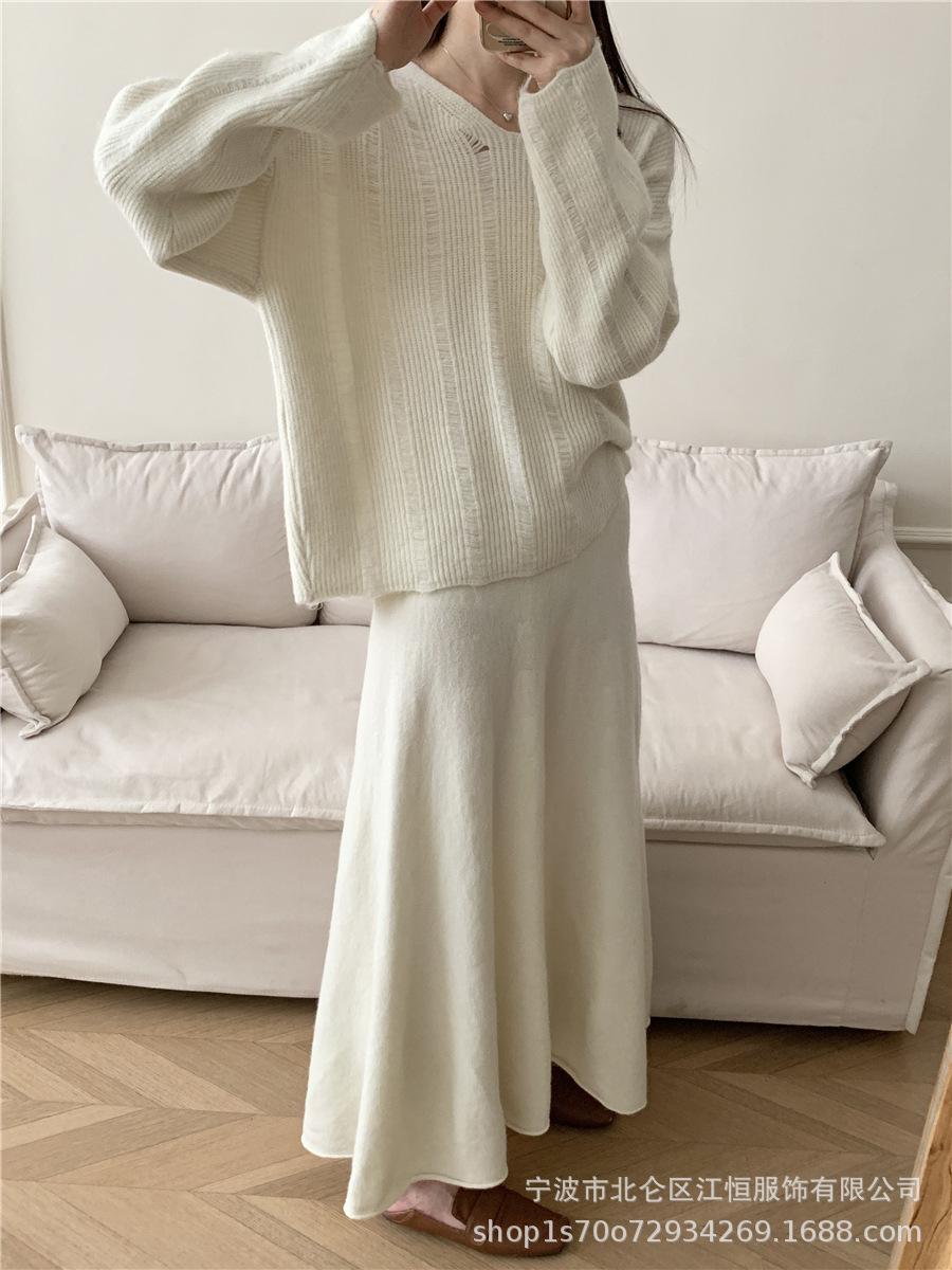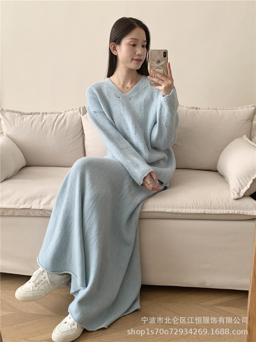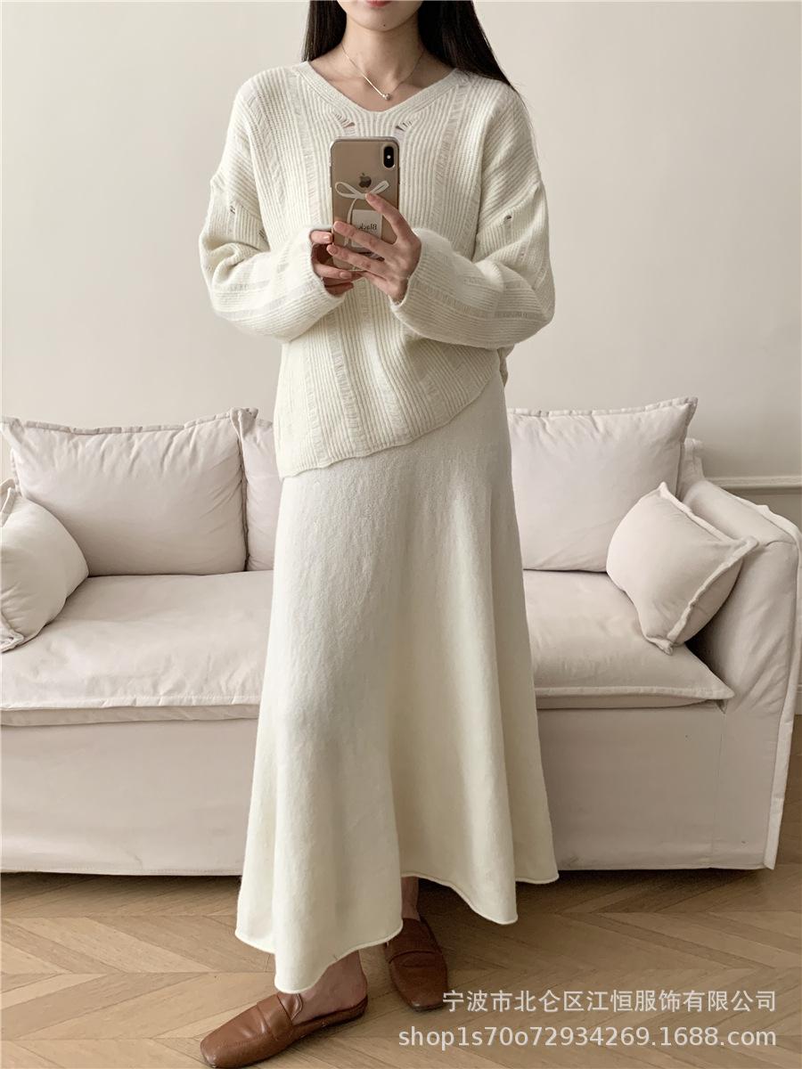 Traje de Suéter Tejido Estilo Europeo y Americano para Mujer 2025 Otoño e Invierno Nuevo Top de Lana Cuello Redondo Falda Cola de Pescado Venta Caliente Transfronteriza