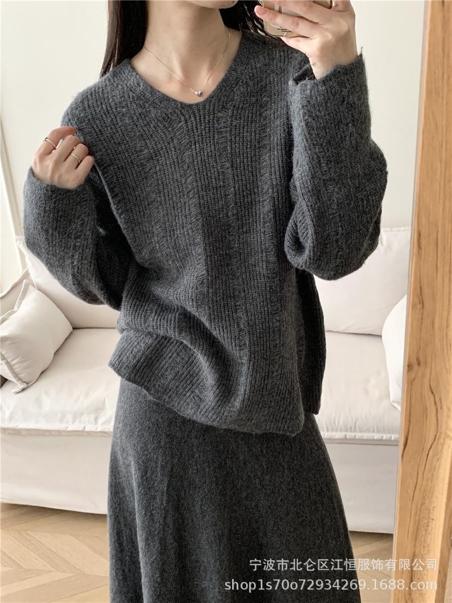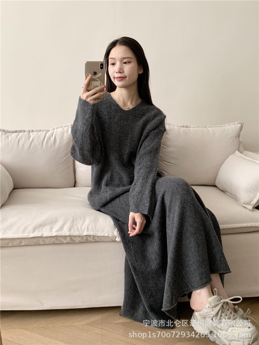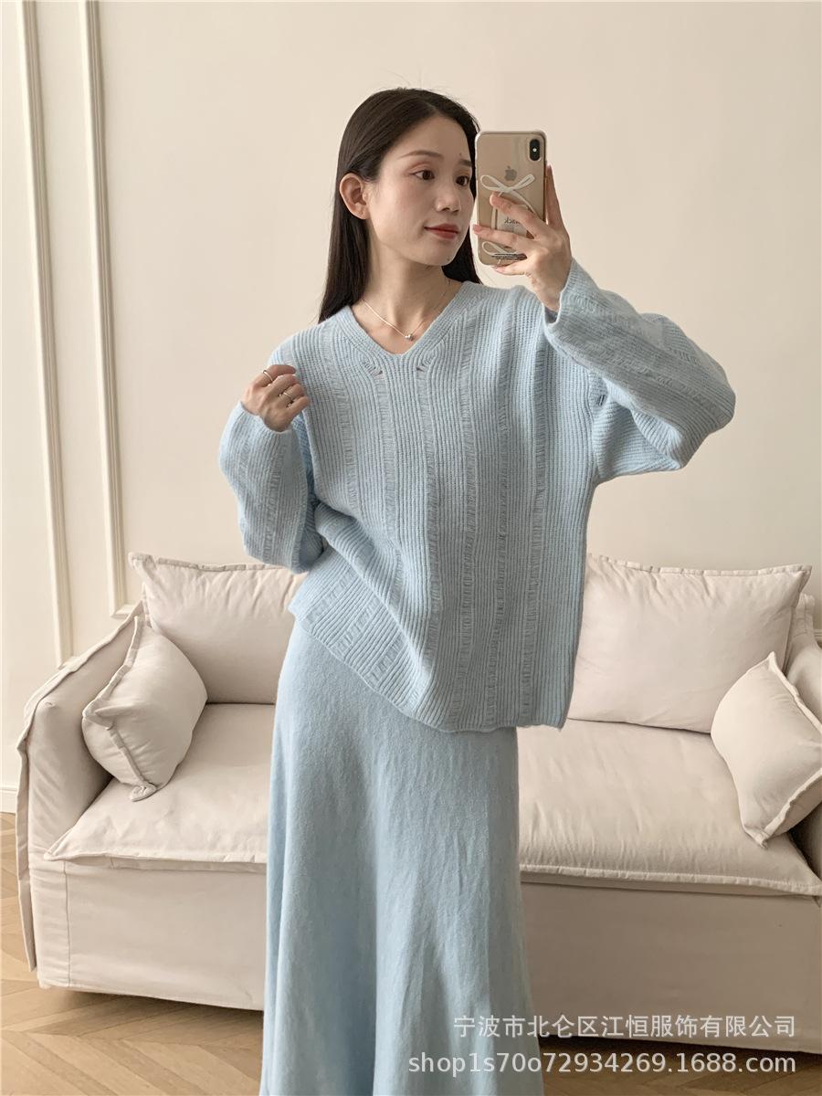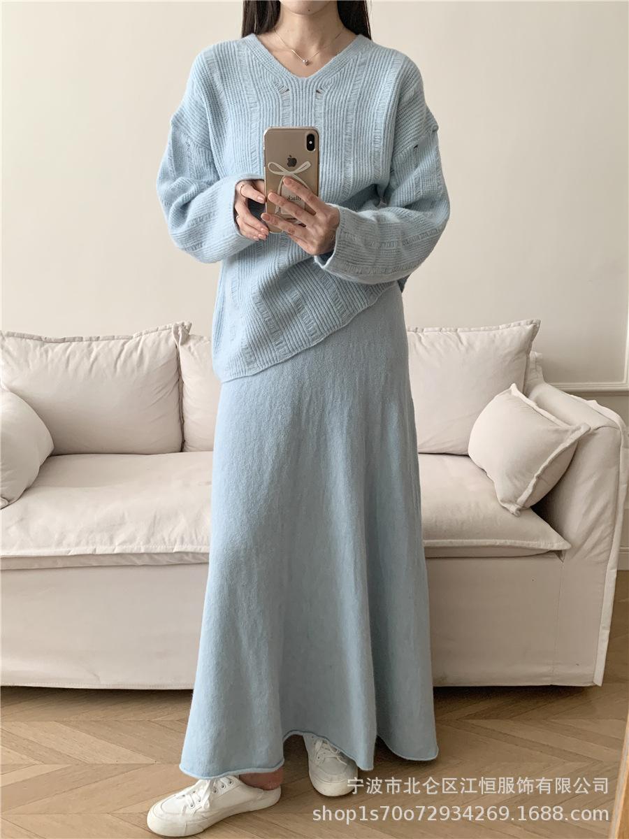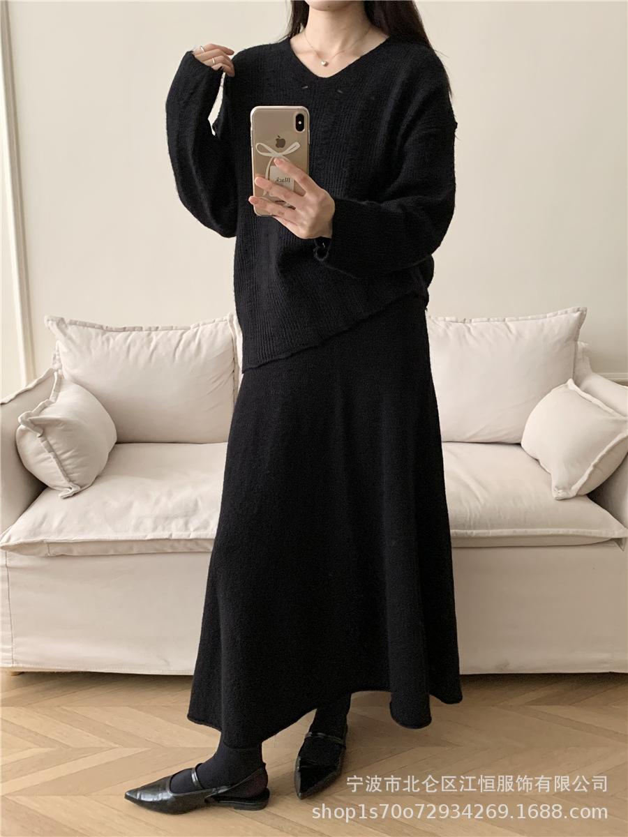 Traje de Suéter Tejido Estilo Europeo y Americano para Mujer 2025 Otoño e Invierno Nuevo Top de Lana Cuello Redondo Falda Cola de Pescado Venta Caliente Transfronteriza