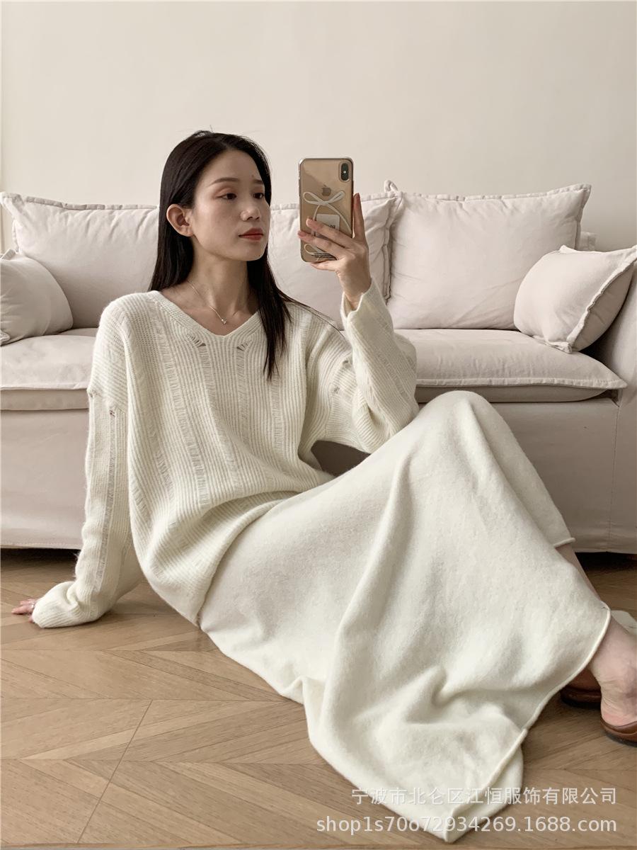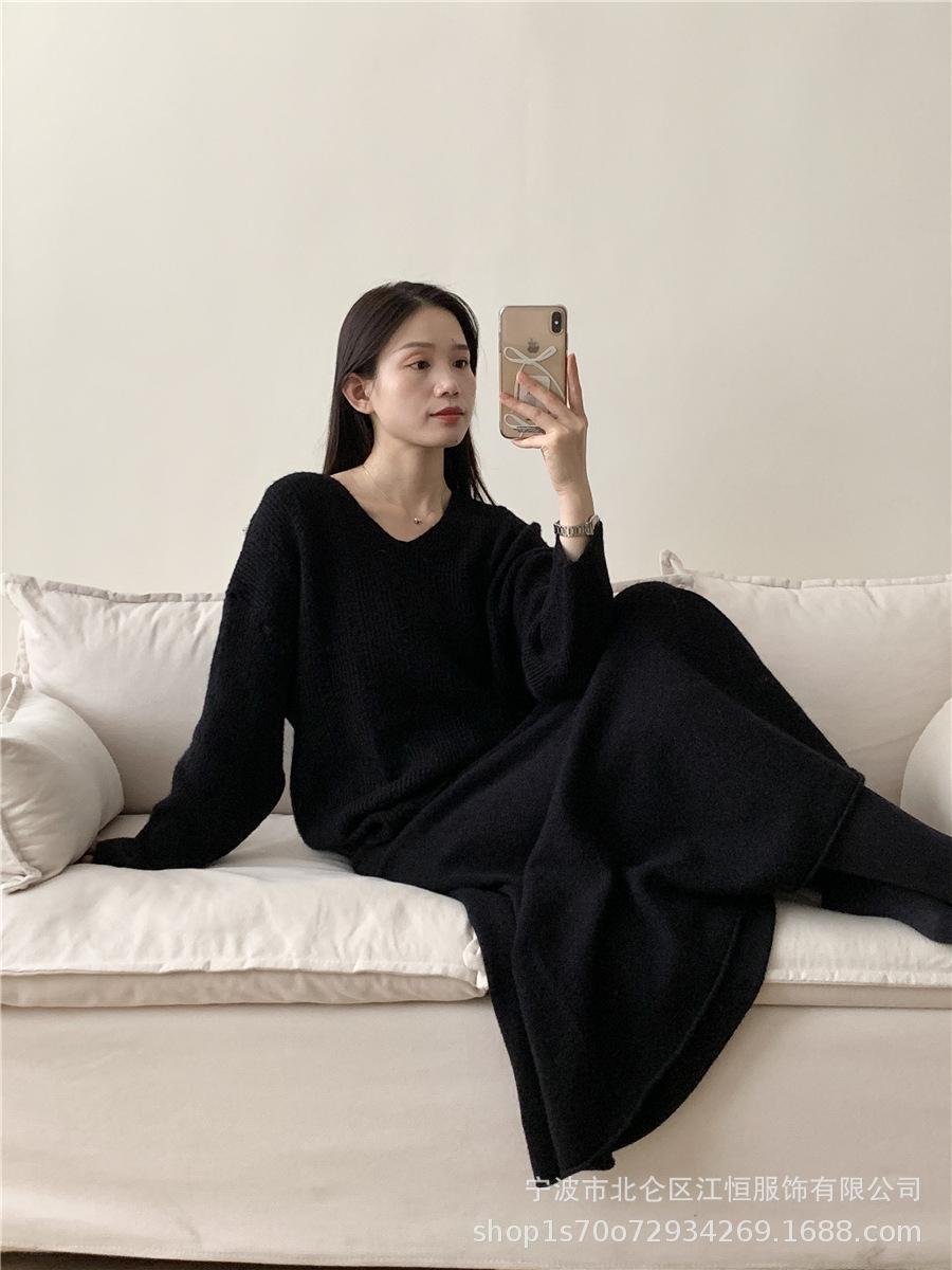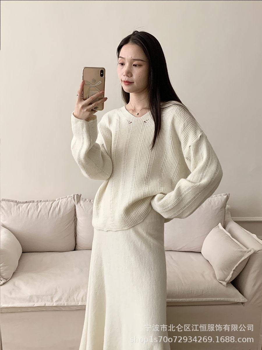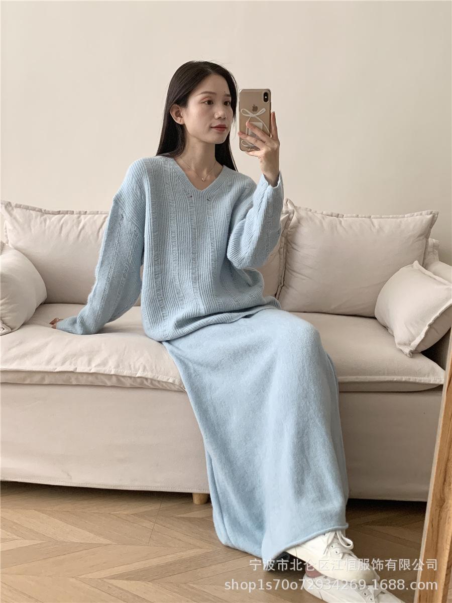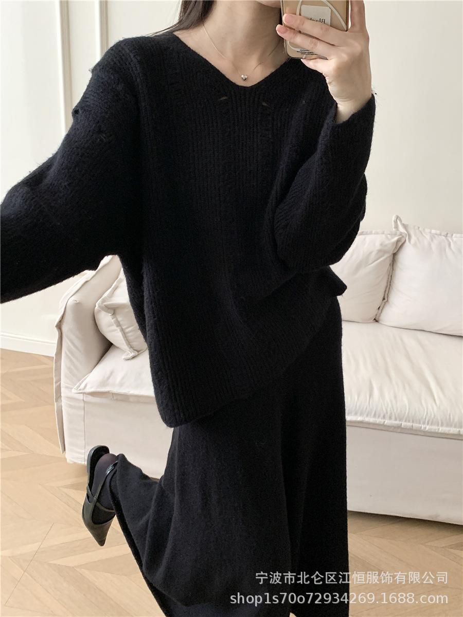 Traje de Suéter Tejido Estilo Europeo y Americano para Mujer 2025 Otoño e Invierno Nuevo Top de Lana Cuello Redondo Falda Cola de Pescado Venta Caliente Transfronteriza