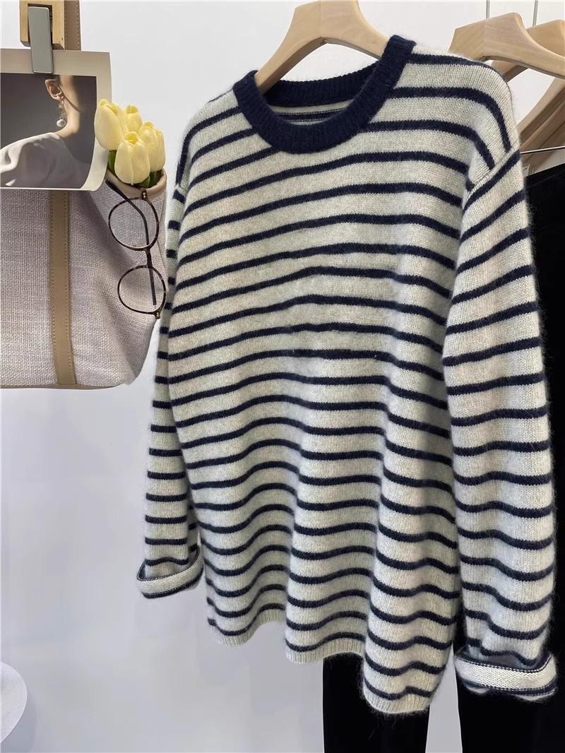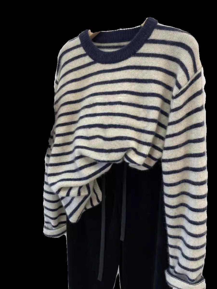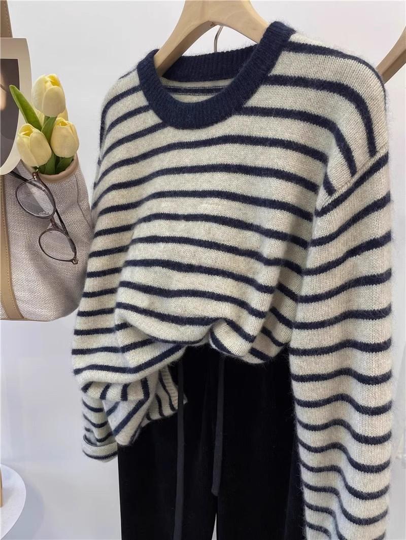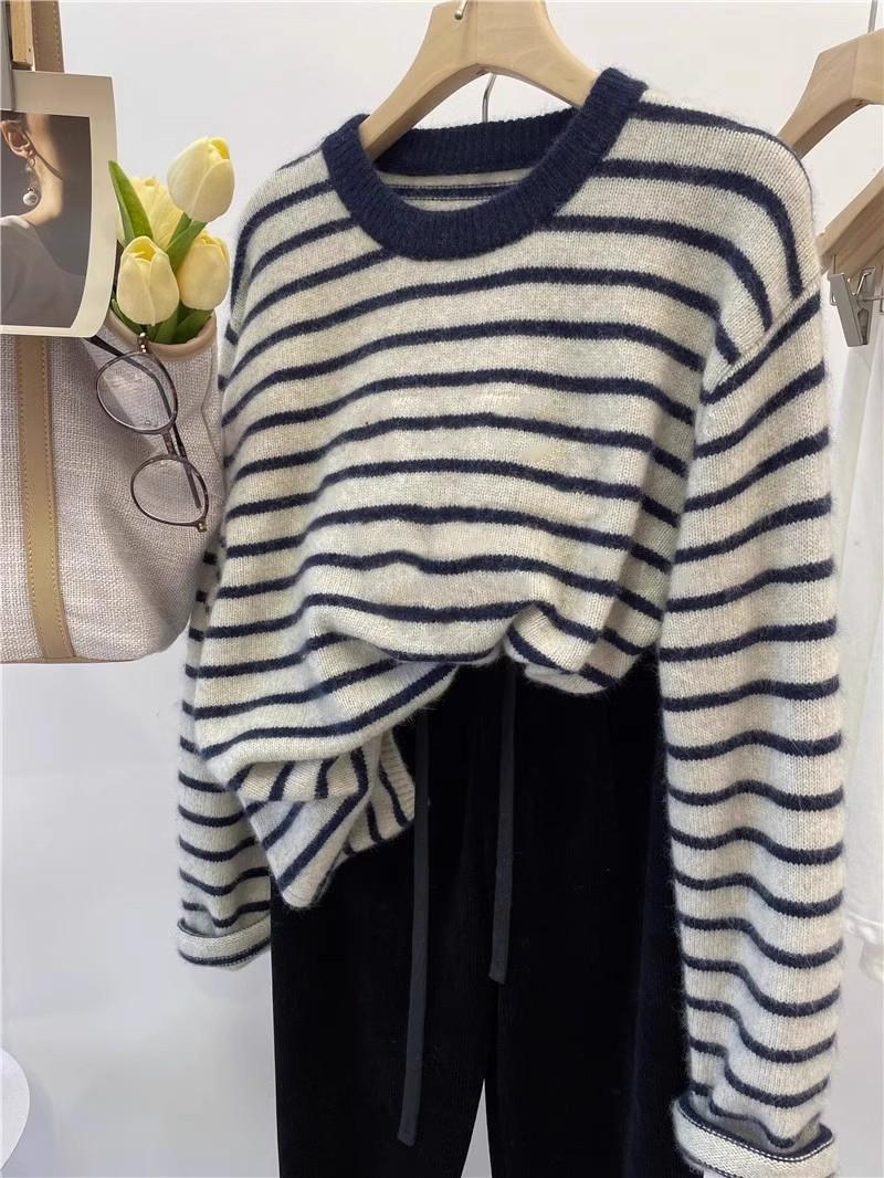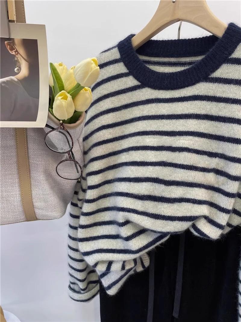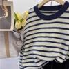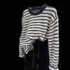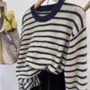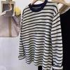Camiseta de manga larga de punto a rayas de color contrastante de estilo coreano para mujer, suéter holgado de cuello redondo fino de principios de otoño 2024