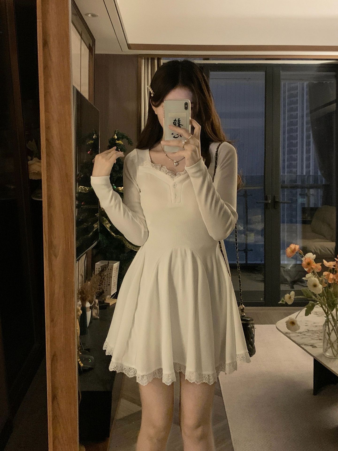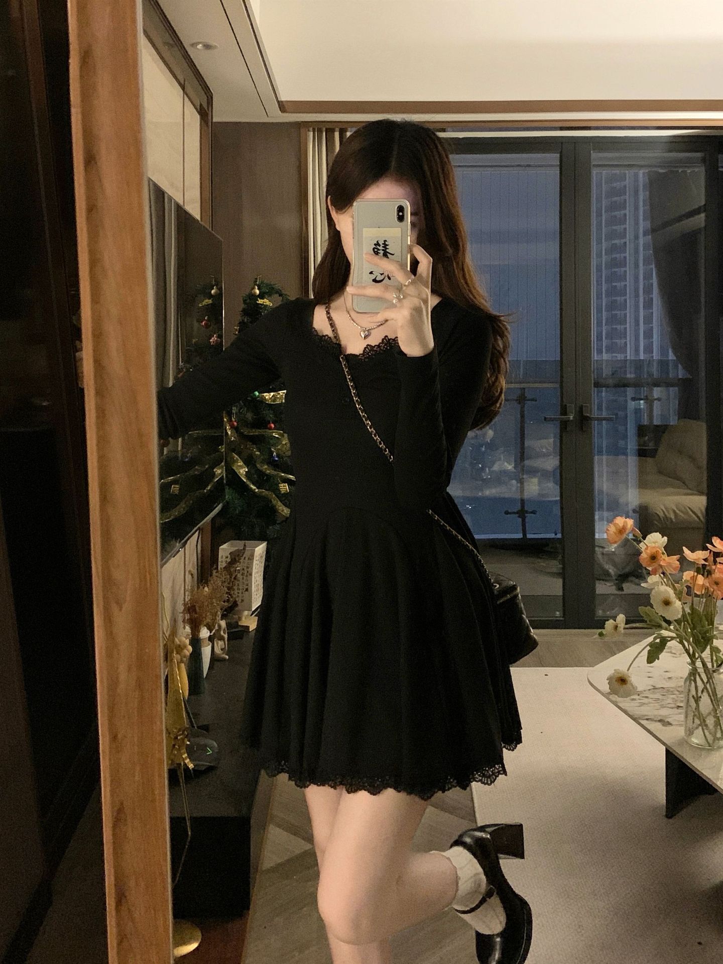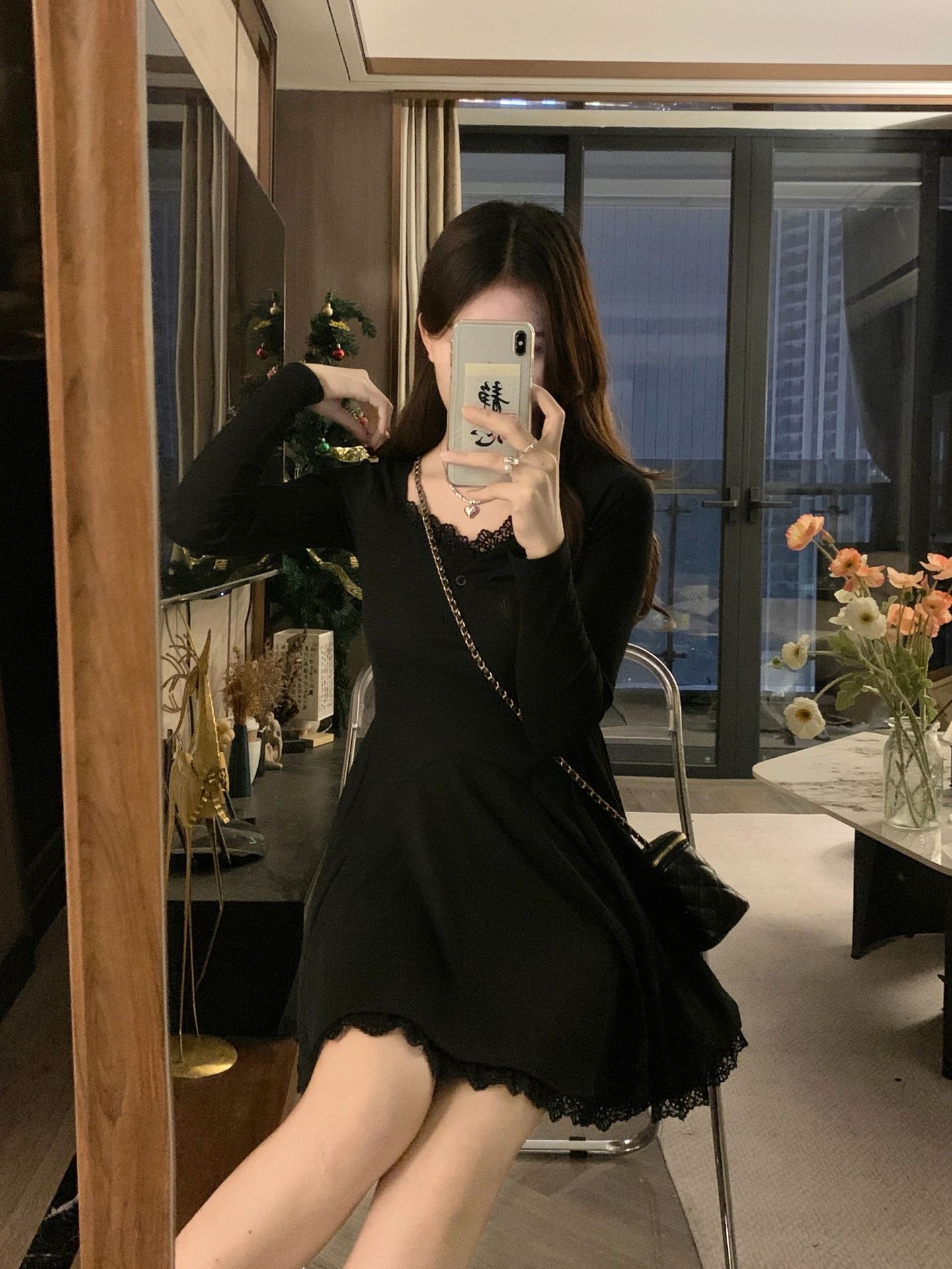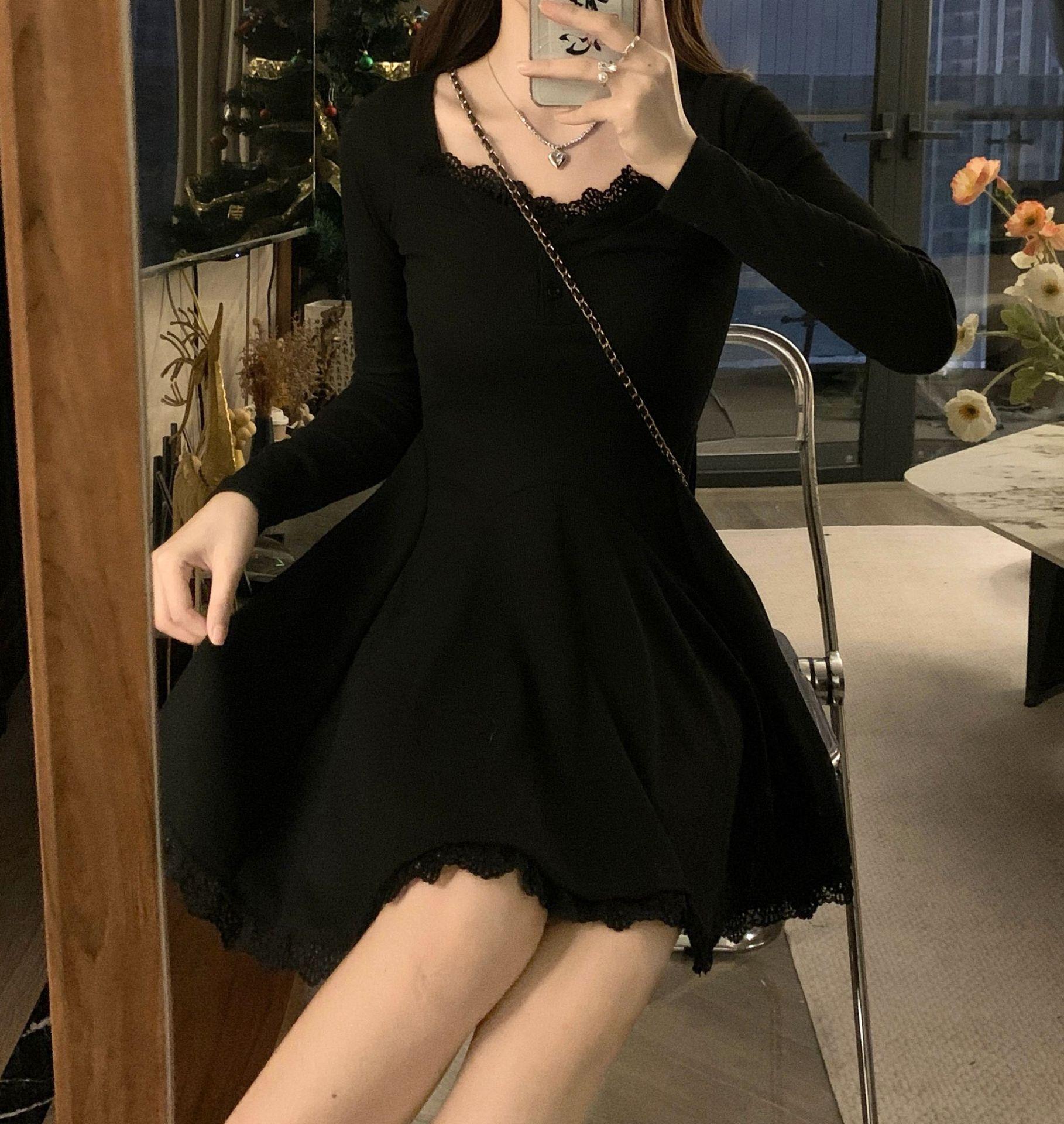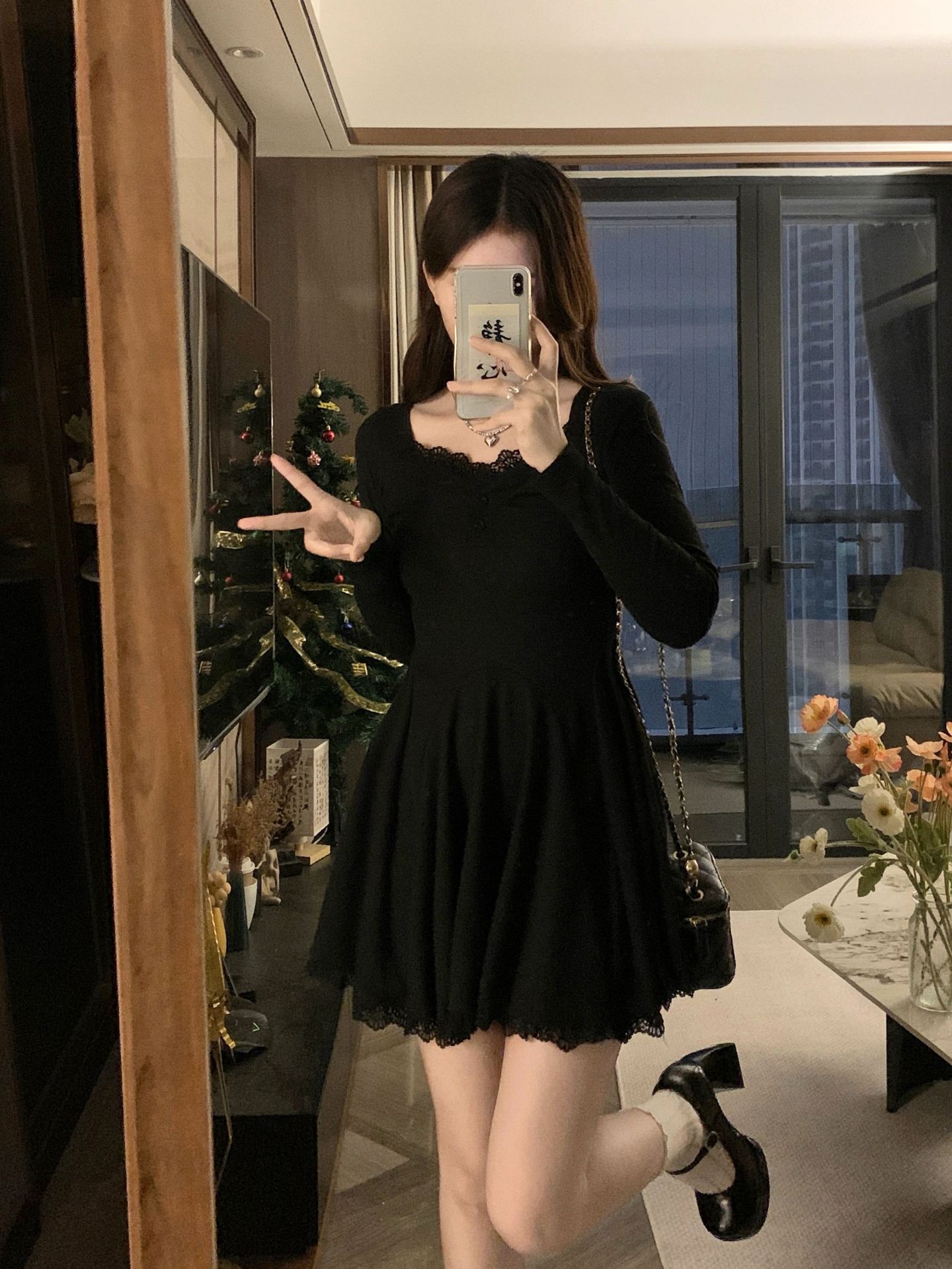 Vestido de Encaje Sexy de Deseo Puro para Mujer 2024 Nuevo Otoño Manga Larga Entallado Spice Girl Falda Tutú Falda Corta