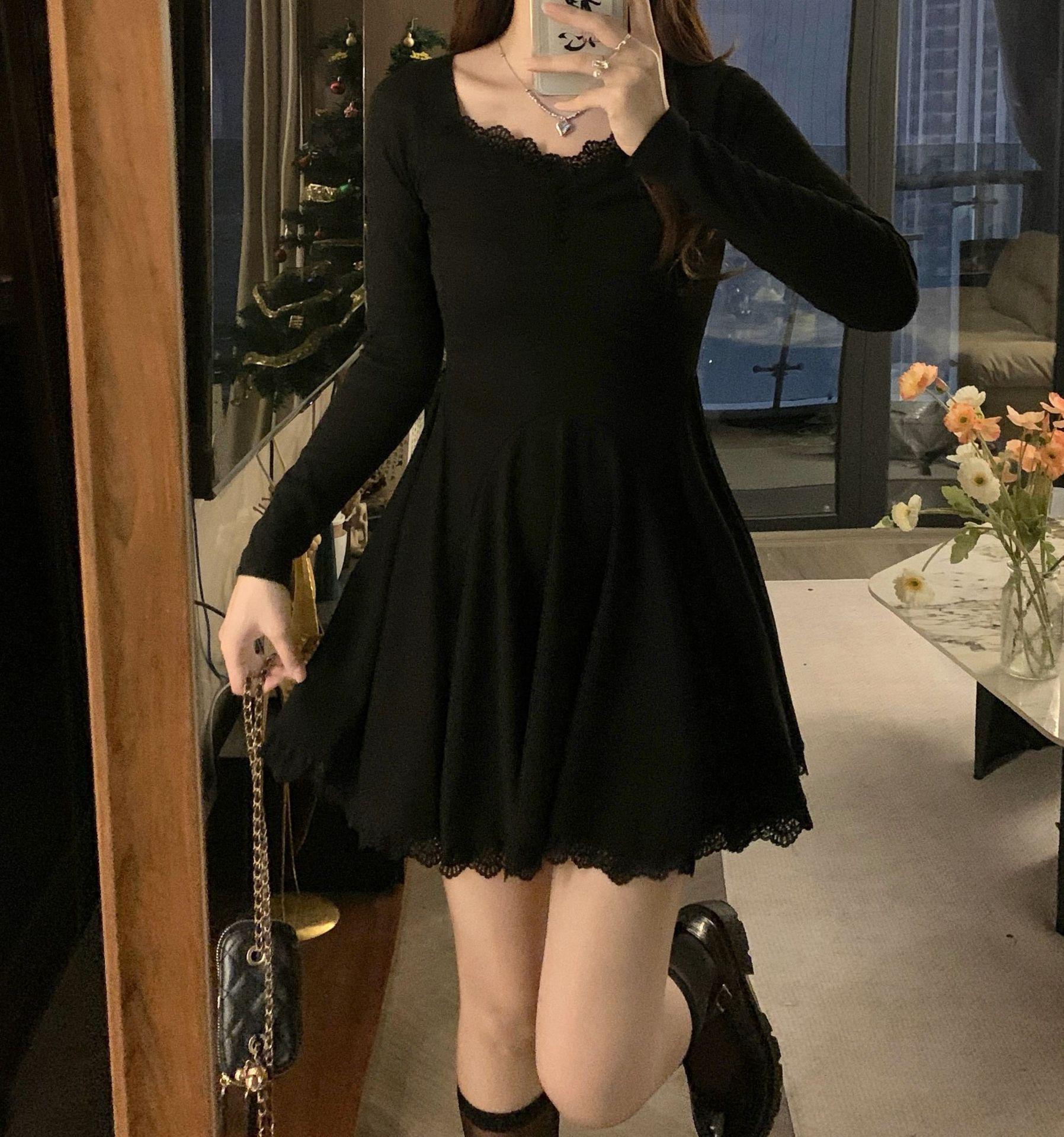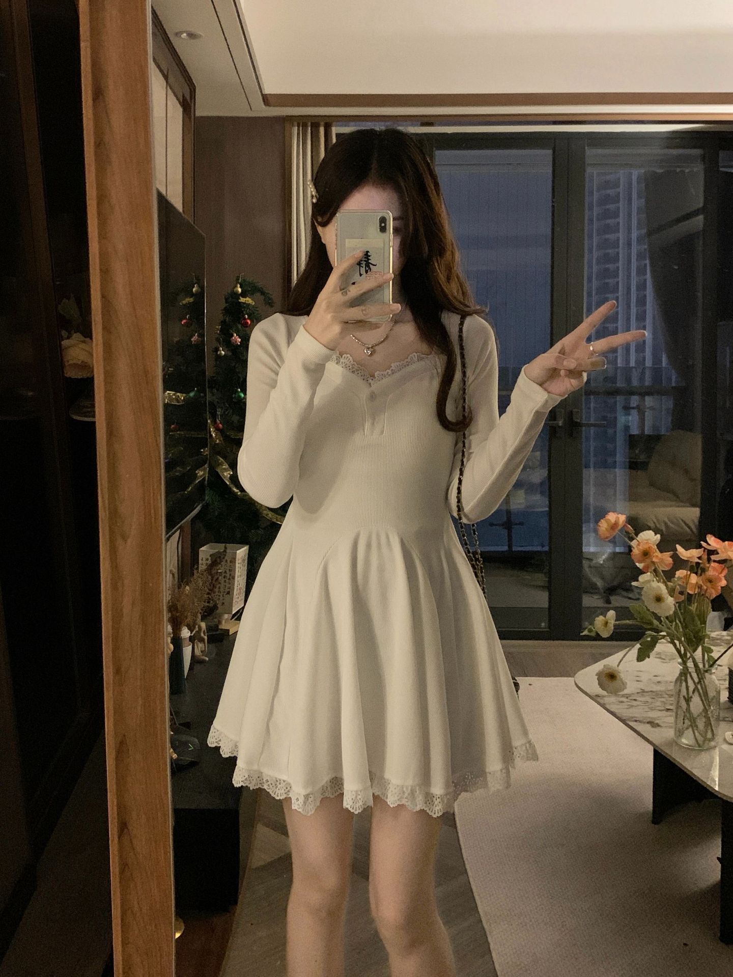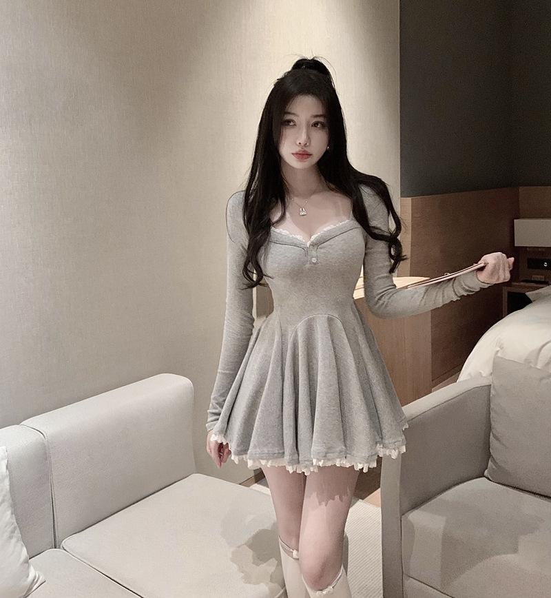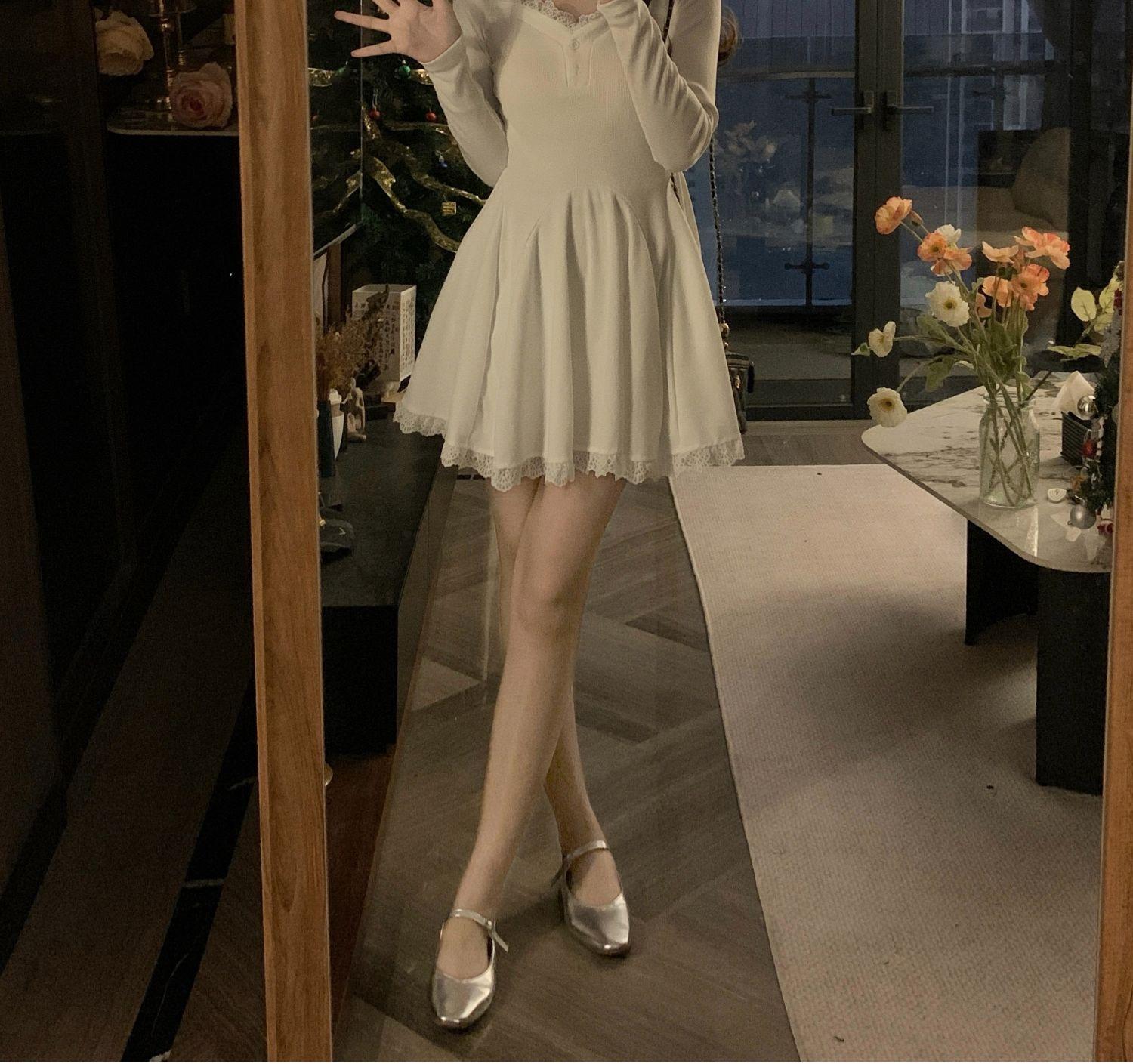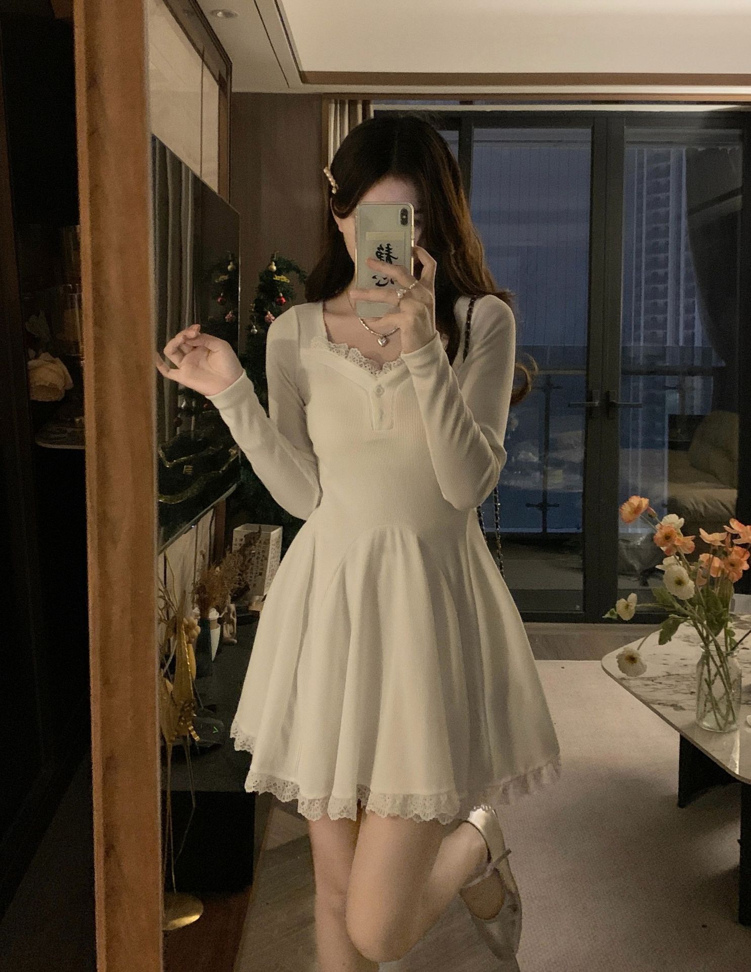 Vestido de Encaje Sexy de Deseo Puro para Mujer 2024 Nuevo Otoño Manga Larga Entallado Spice Girl Falda Tutú Falda Corta
