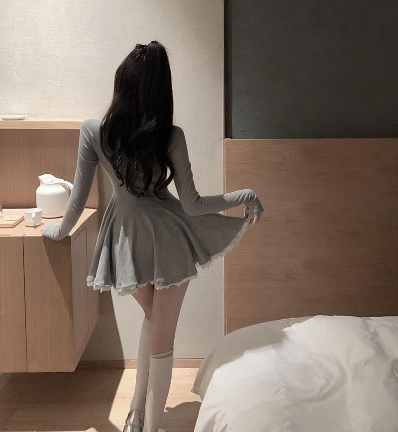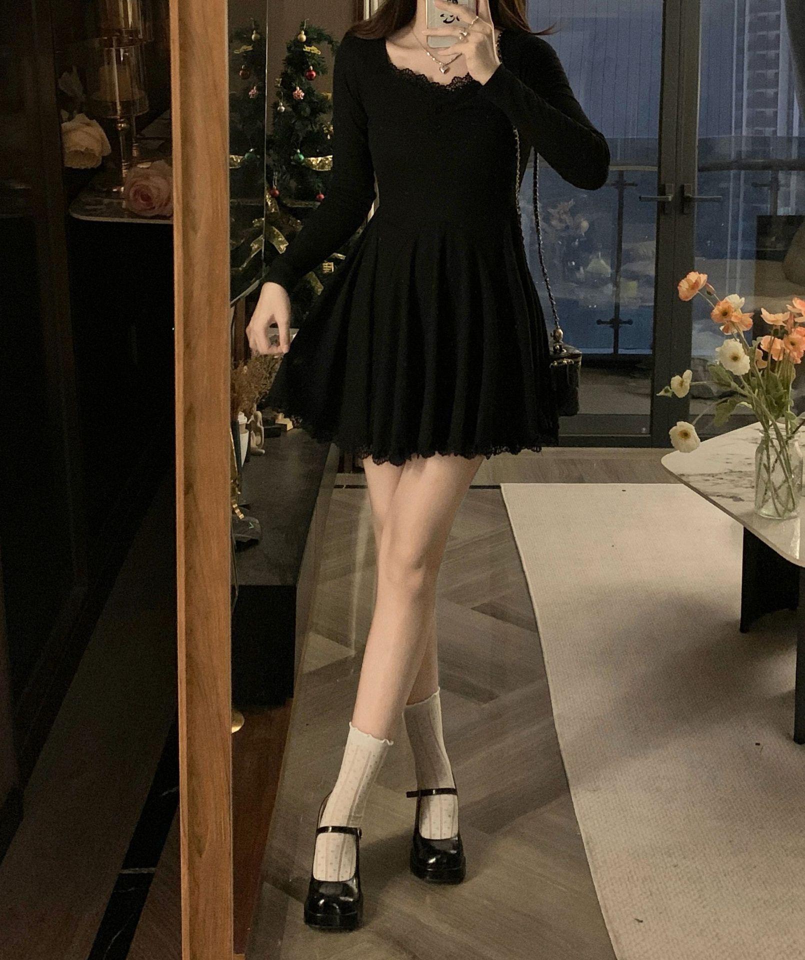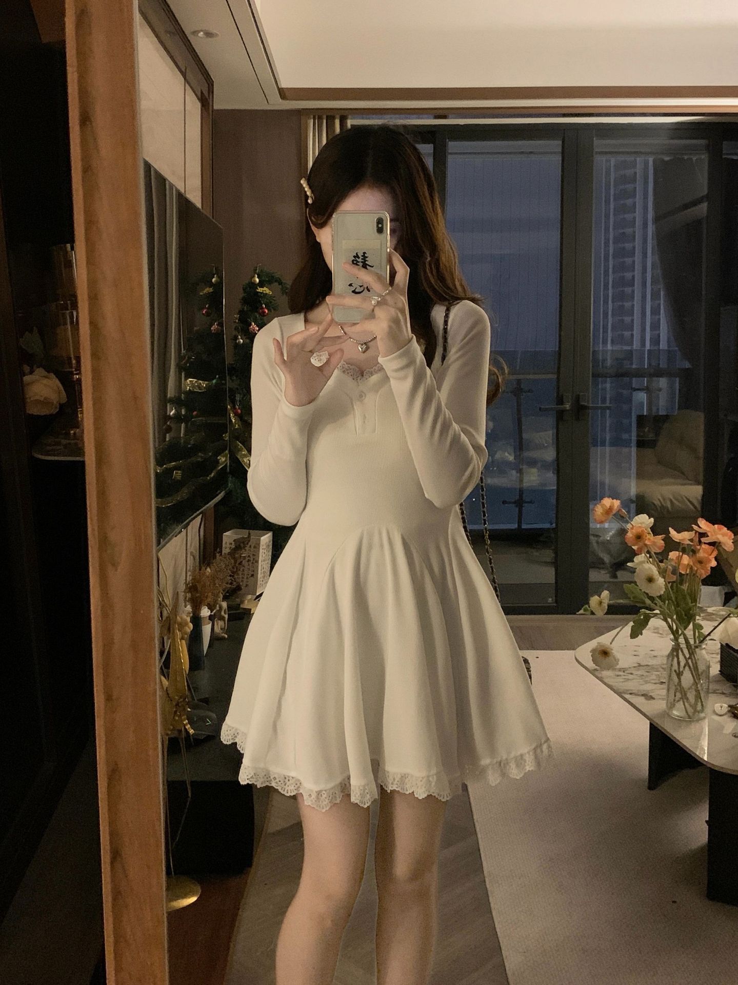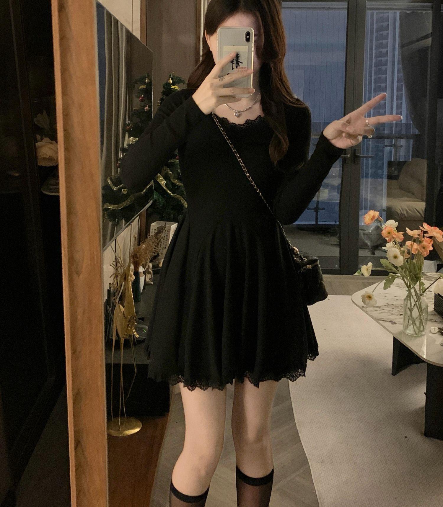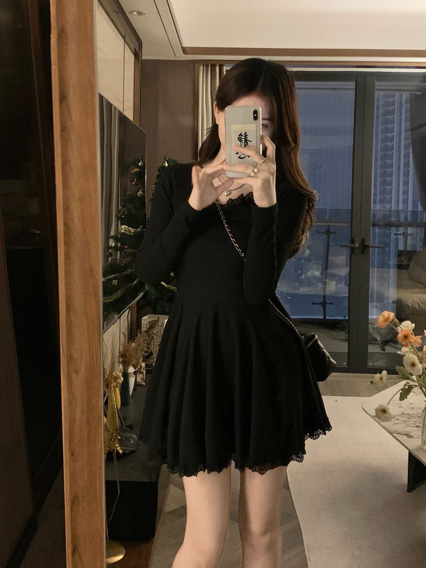 Vestido de Encaje Sexy de Deseo Puro para Mujer 2024 Nuevo Otoño Manga Larga Entallado Spice Girl Falda Tutú Falda Corta
