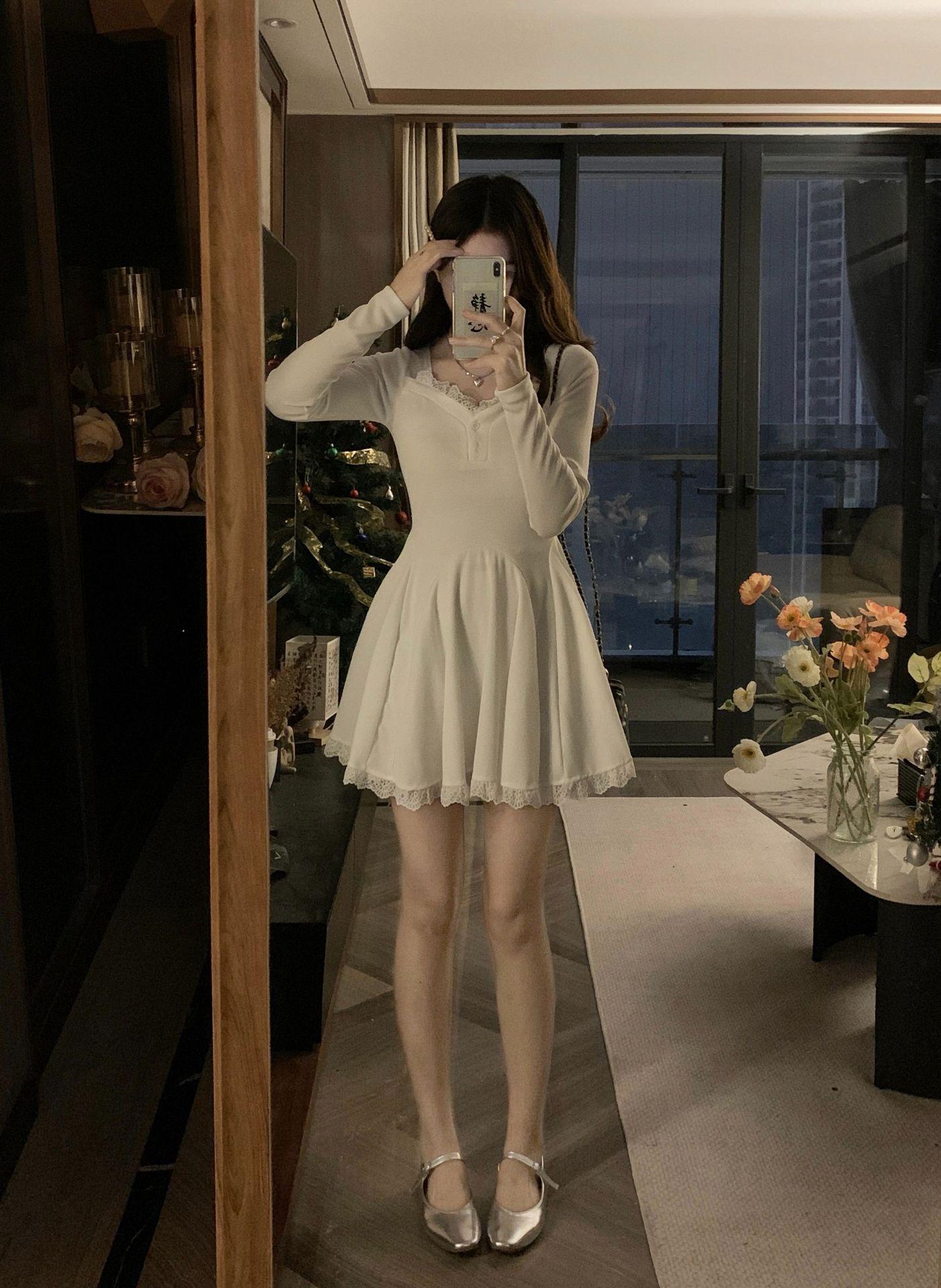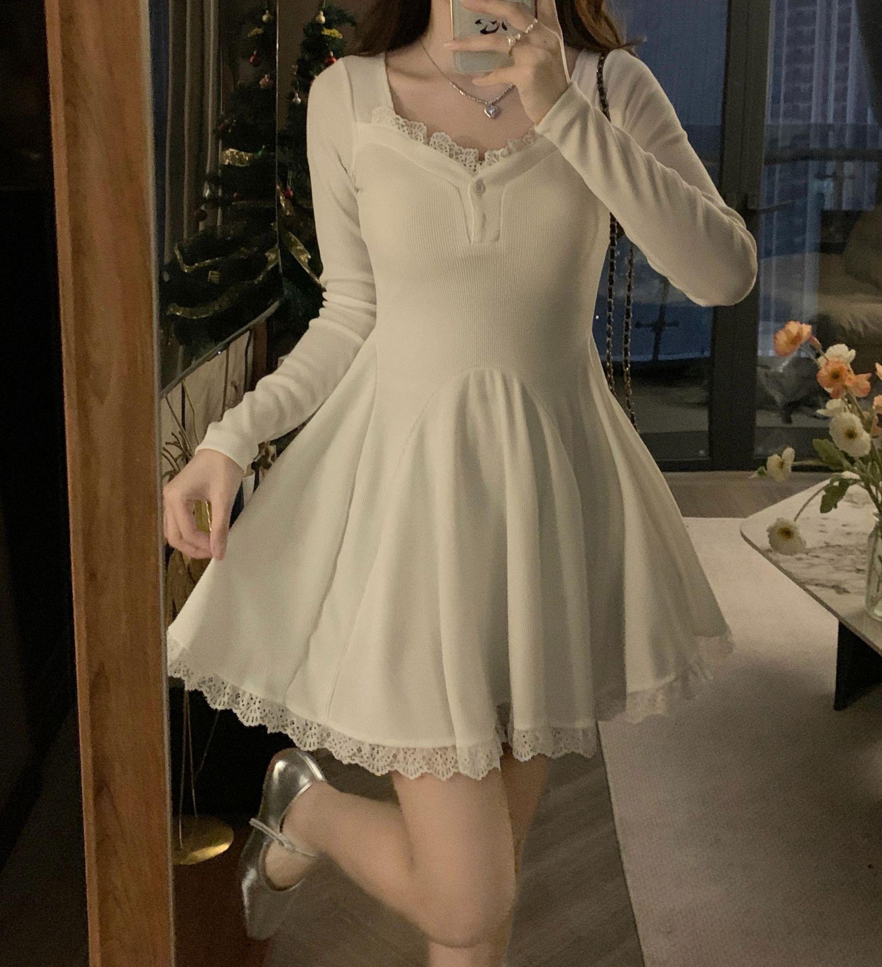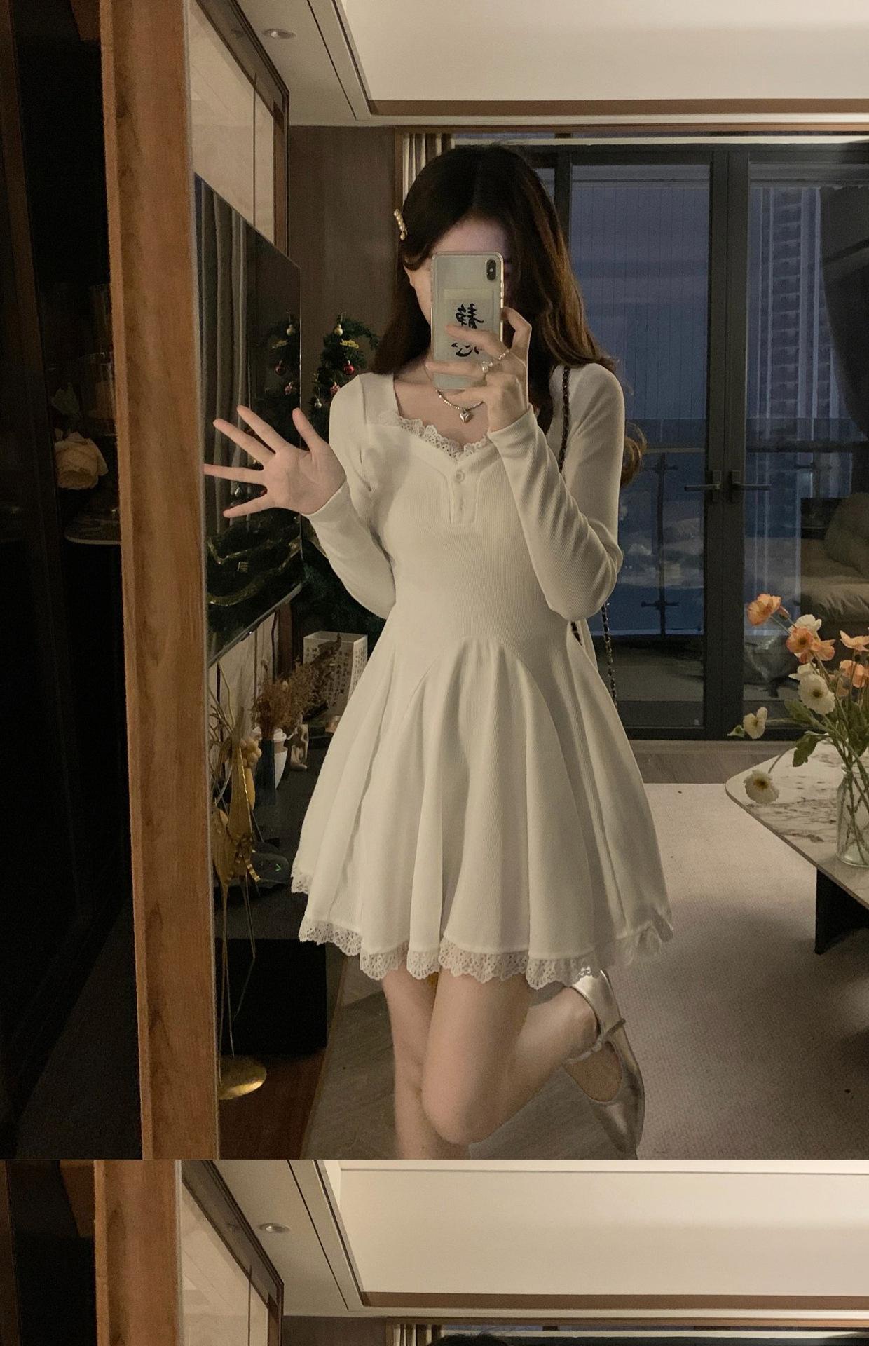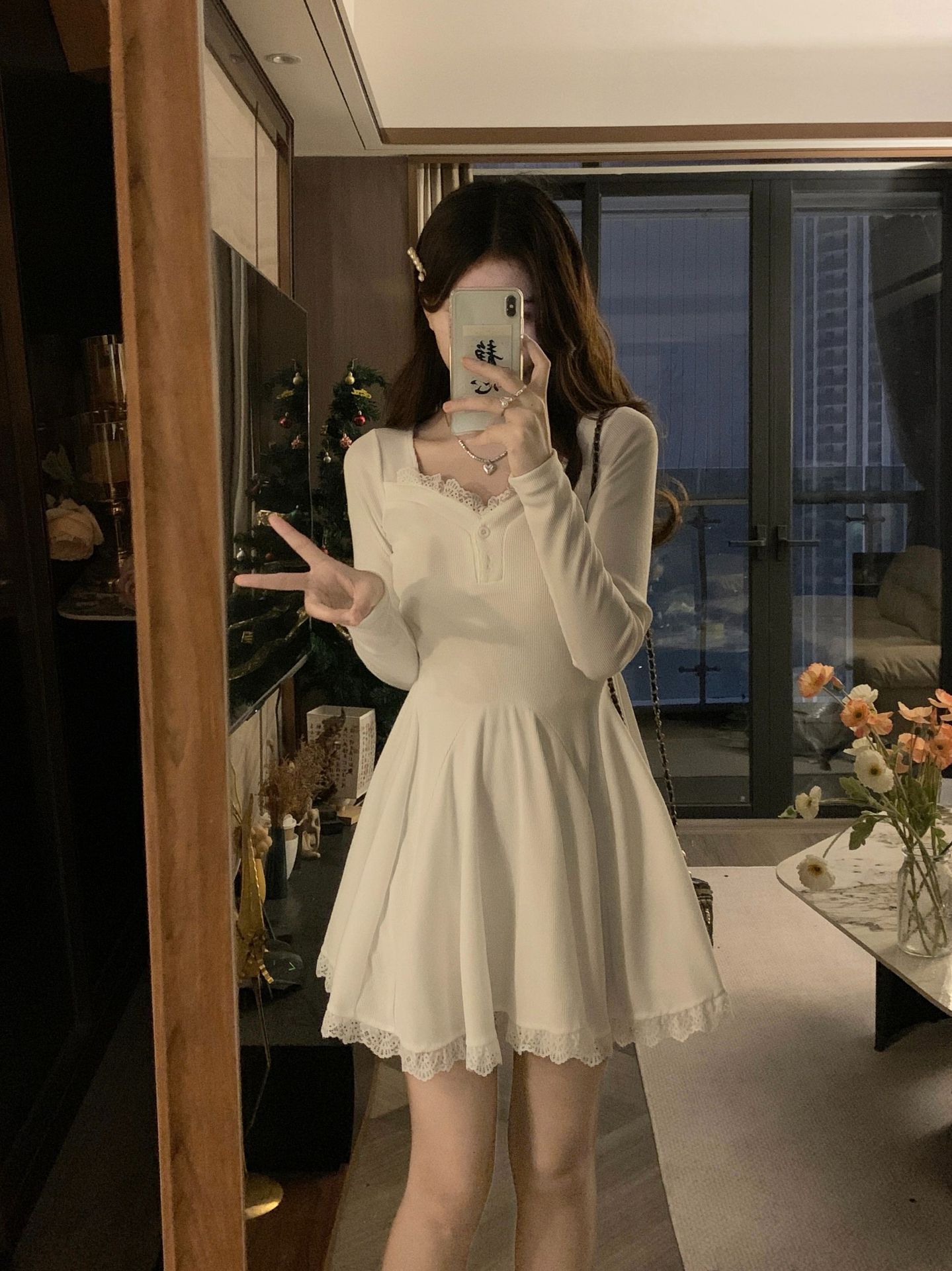 Vestido de Encaje Sexy de Deseo Puro para Mujer 2024 Nuevo Otoño Manga Larga Entallado Spice Girl Falda Tutú Falda Corta