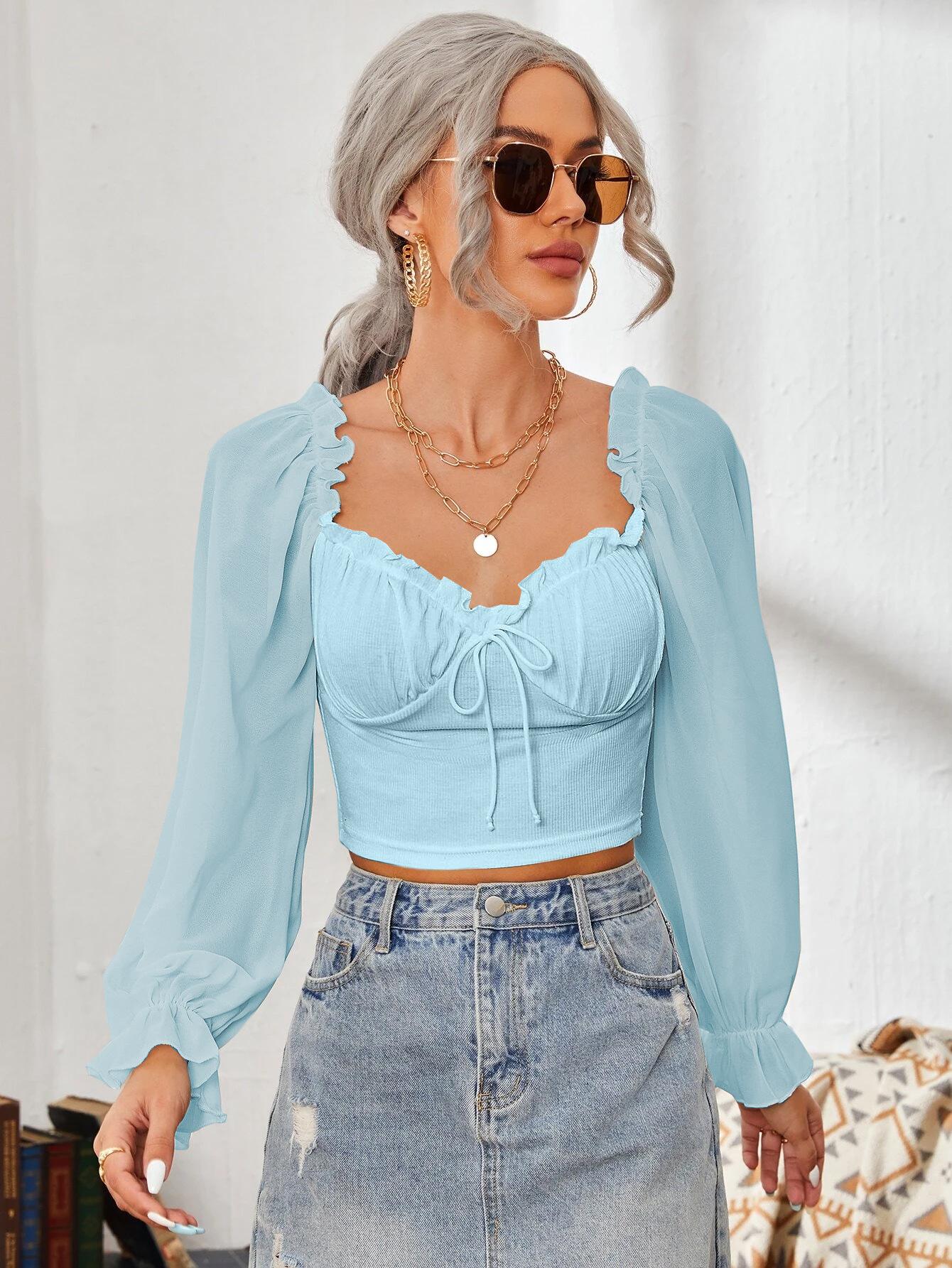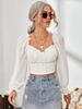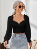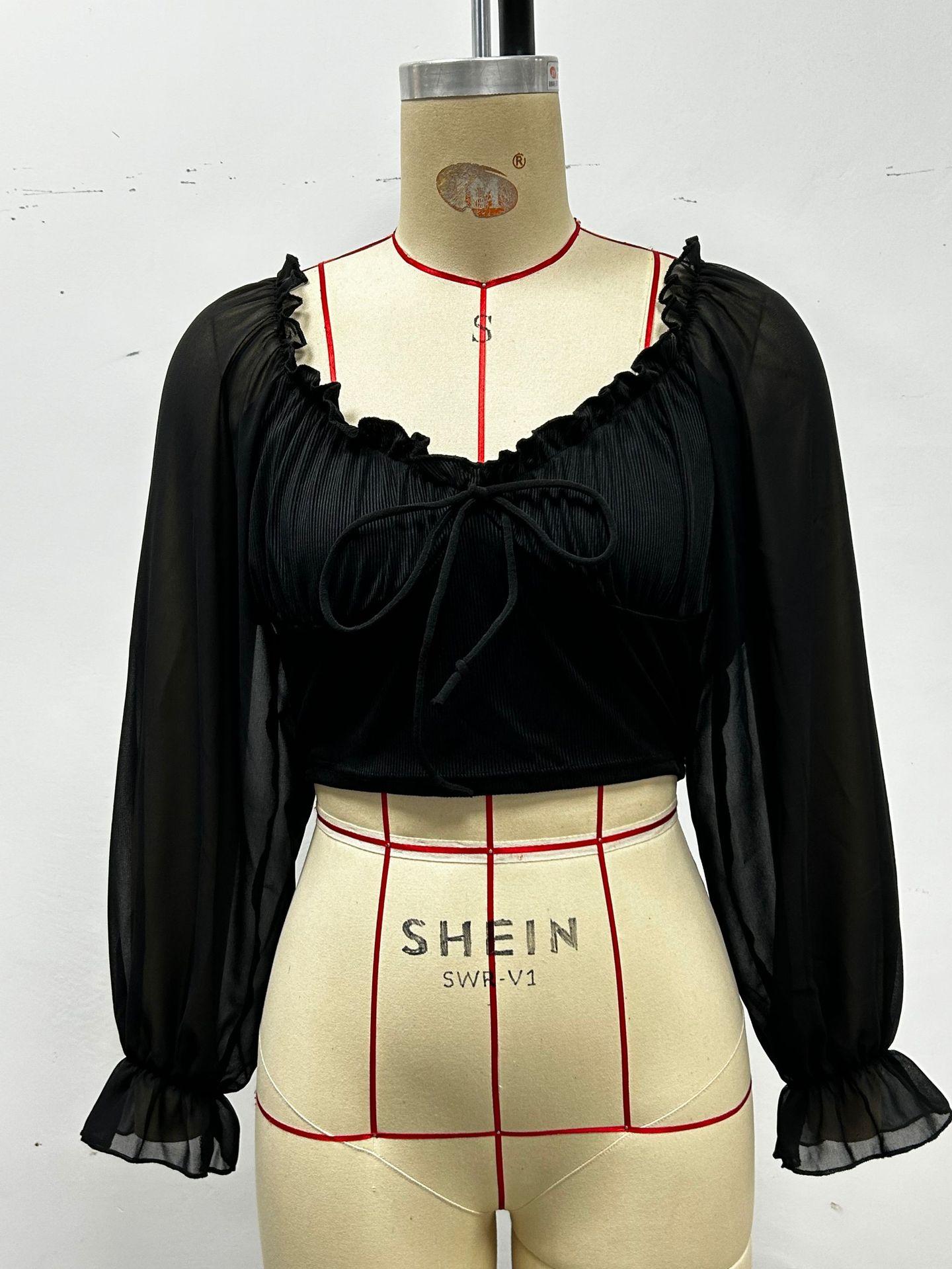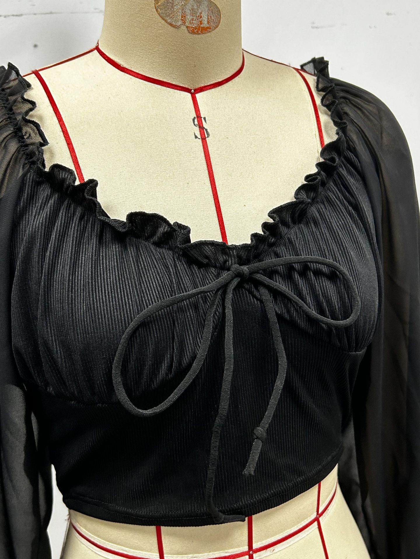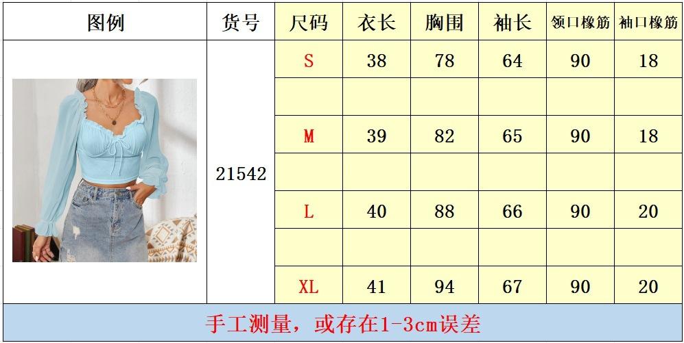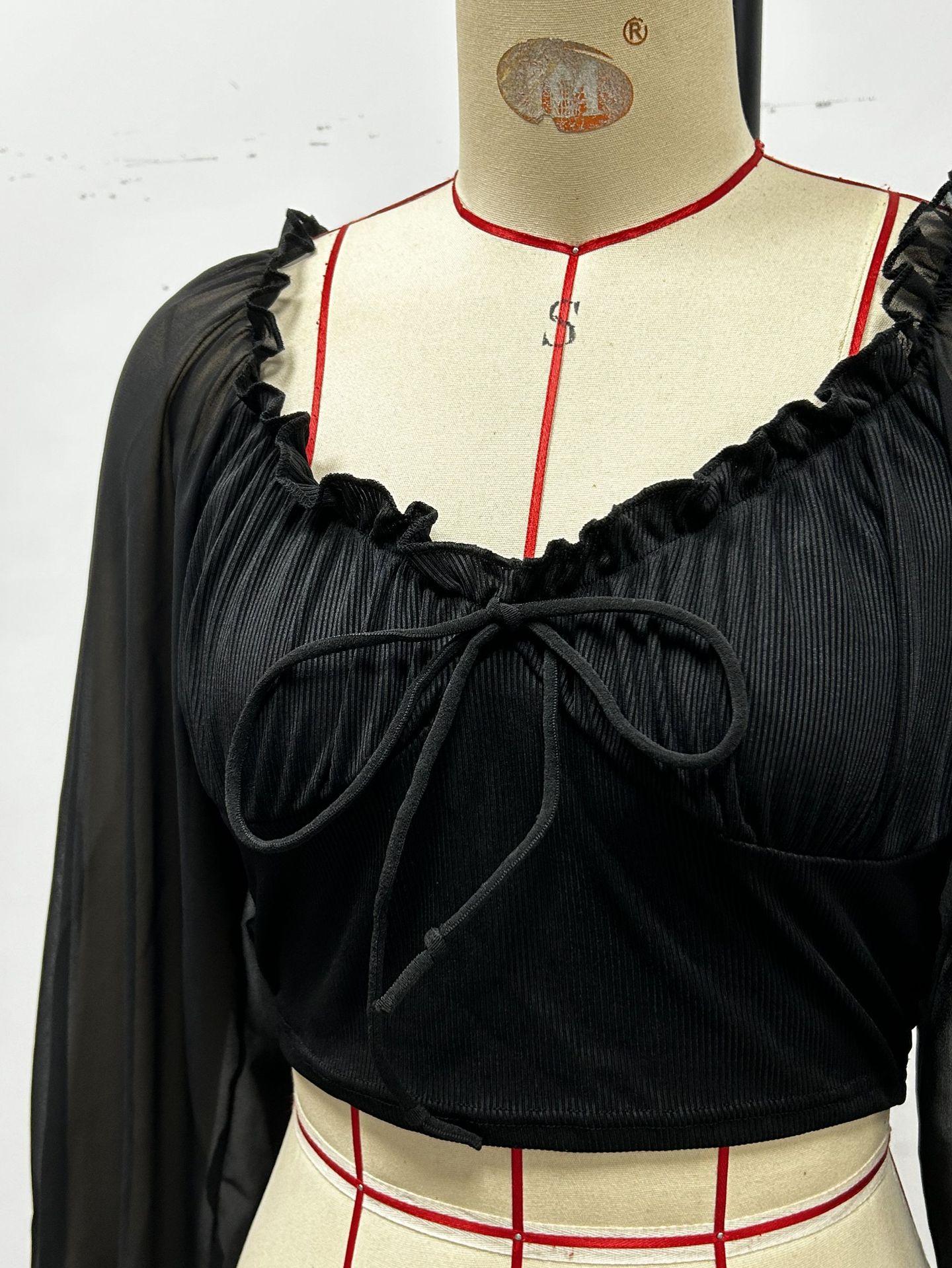 Top de Verano de Cuello Cuadrado con Adorno de Orejas de Manga Larga Europeo y Americano Transfronterizo para Mujer con Cordones Elástico Ajustado Elegante Camisa Base Corta