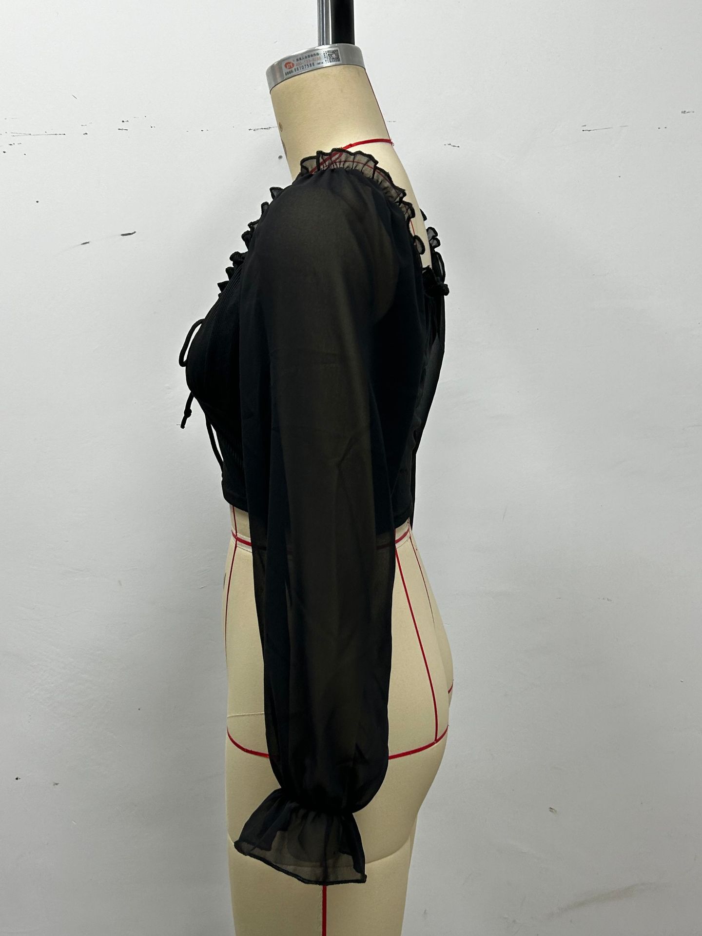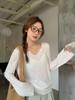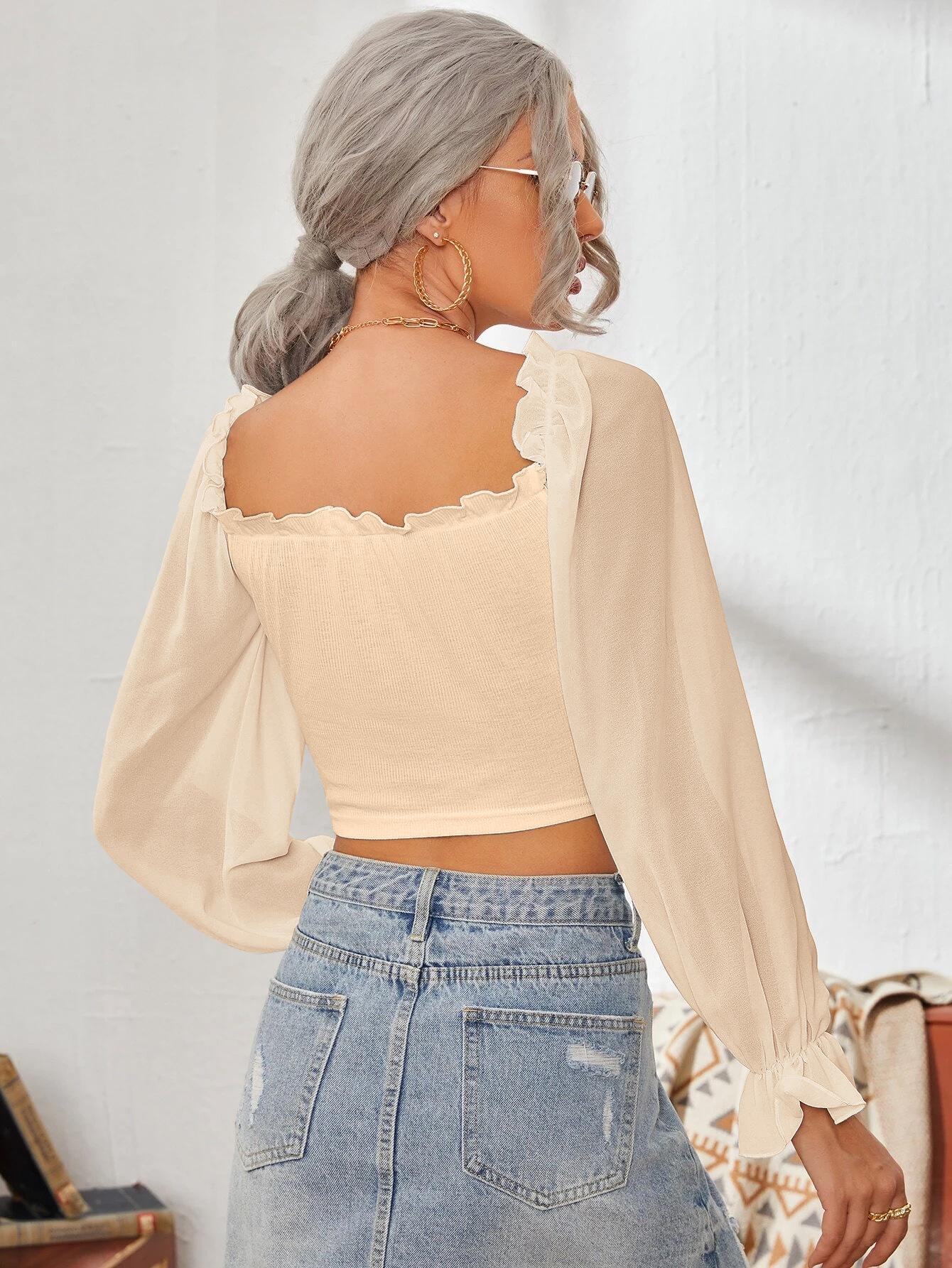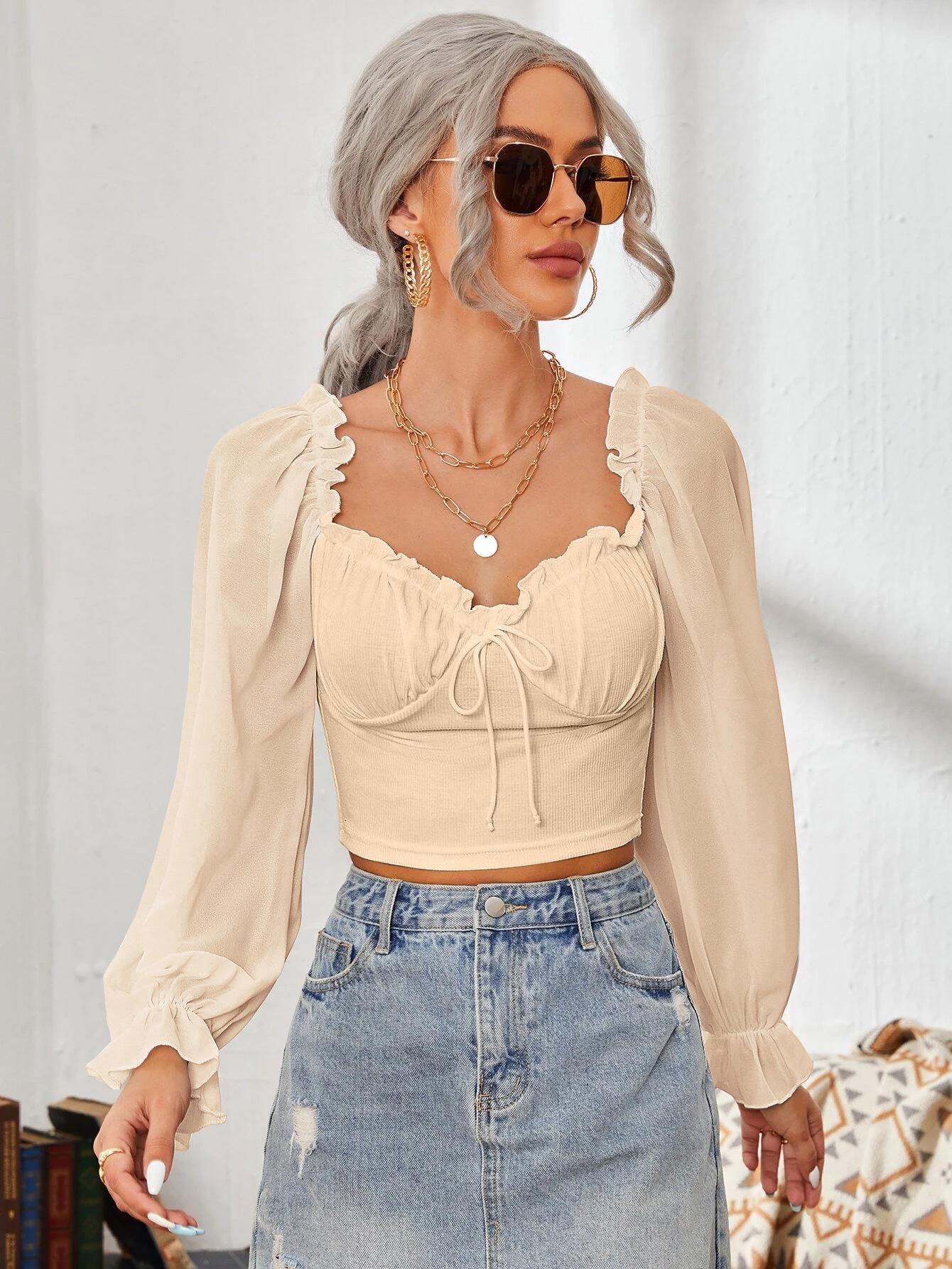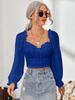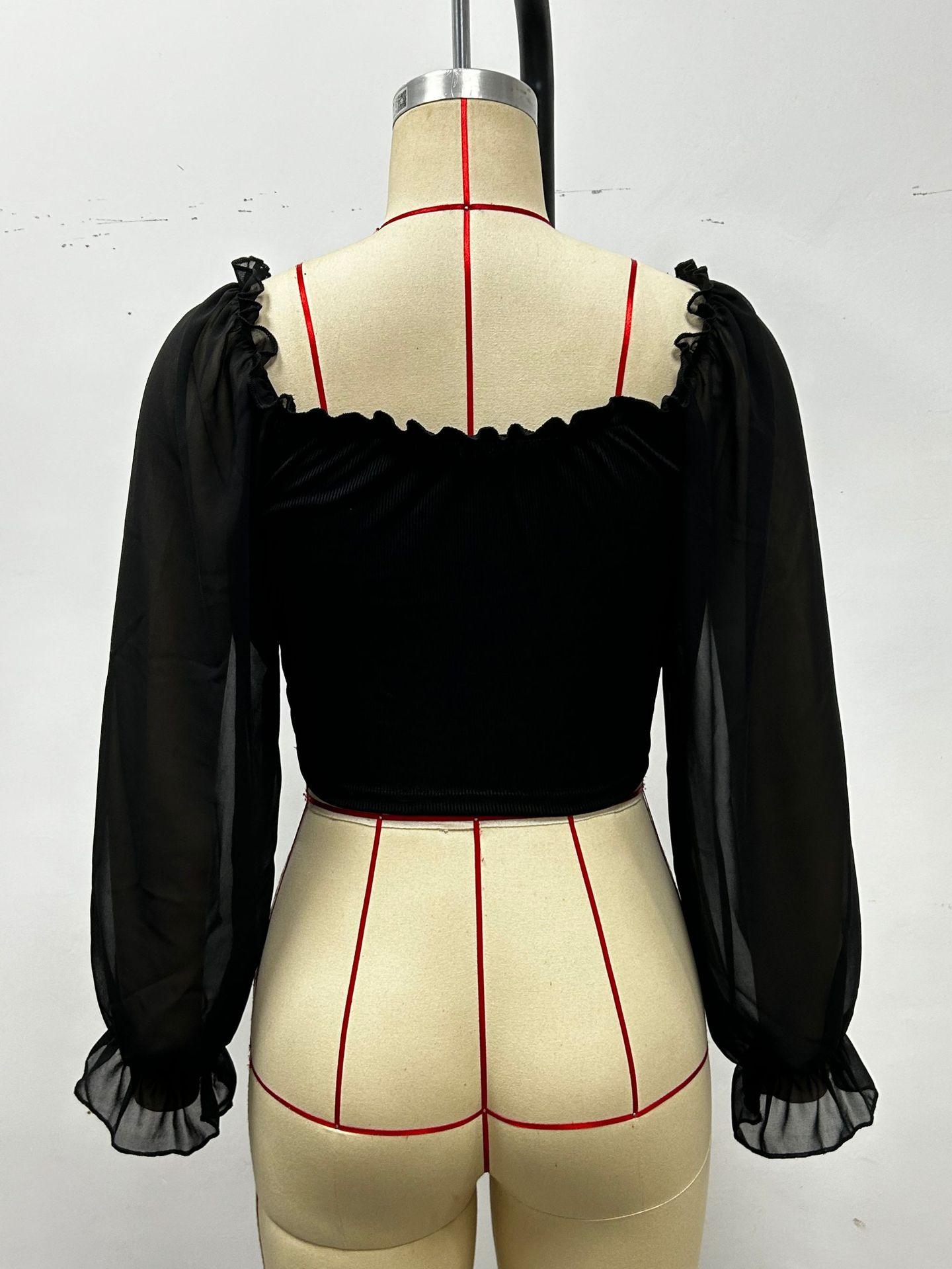 Top de Verano de Cuello Cuadrado con Adorno de Orejas de Manga Larga Europeo y Americano Transfronterizo para Mujer con Cordones Elástico Ajustado Elegante Camisa Base Corta