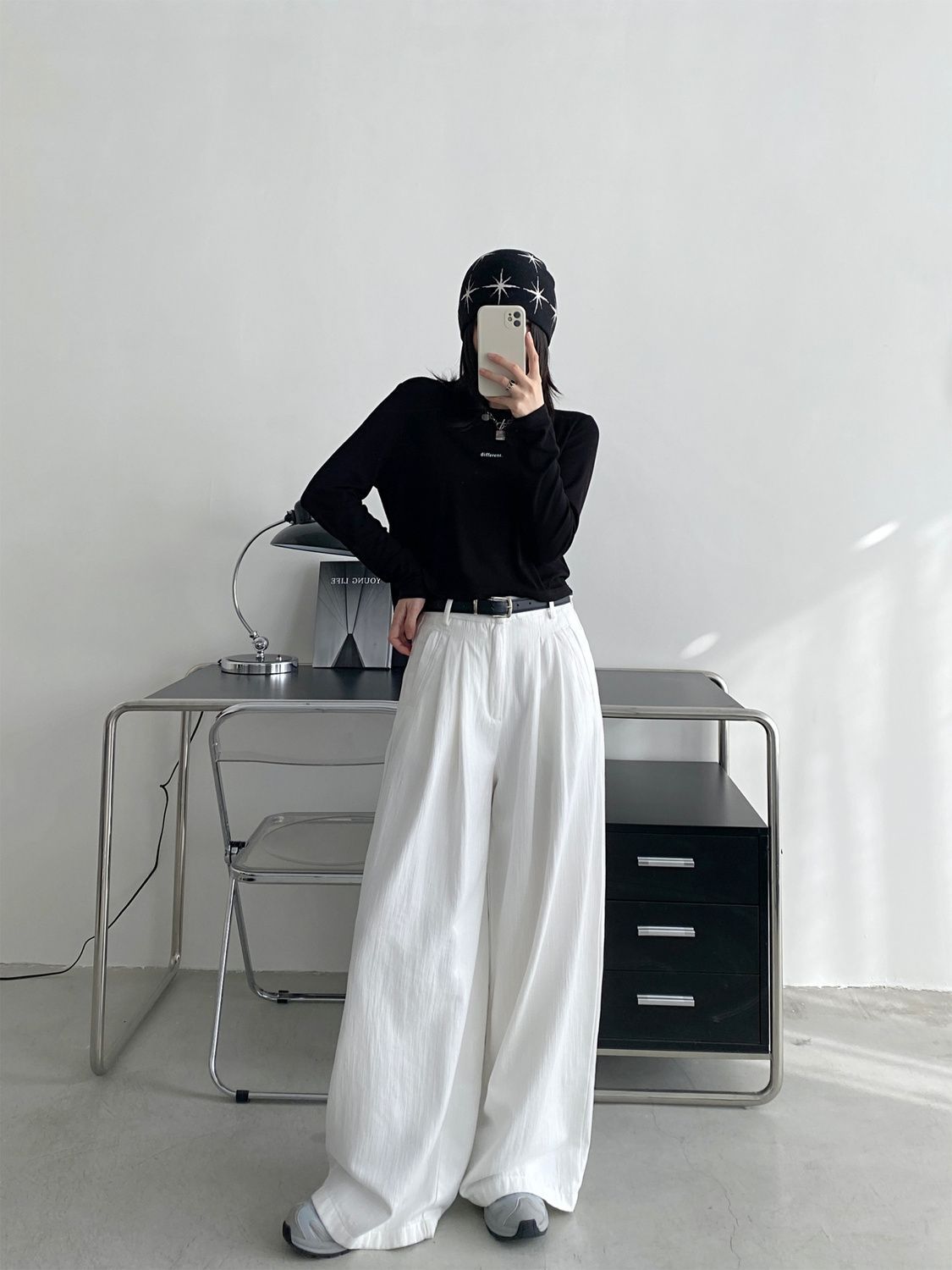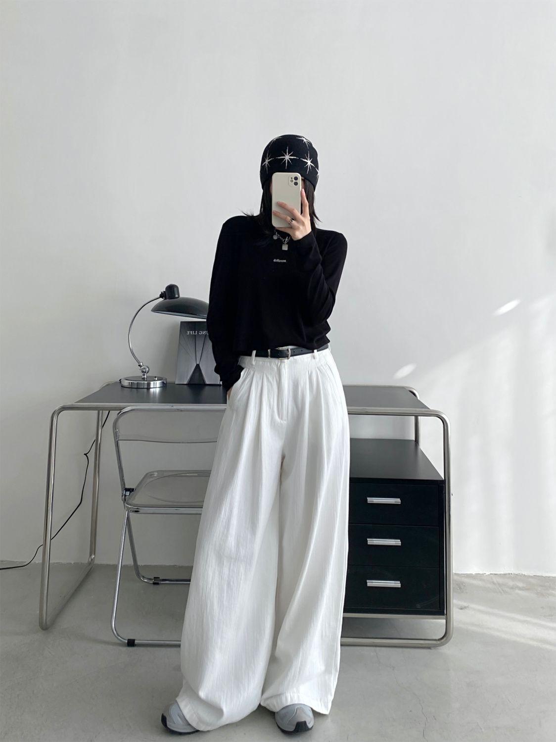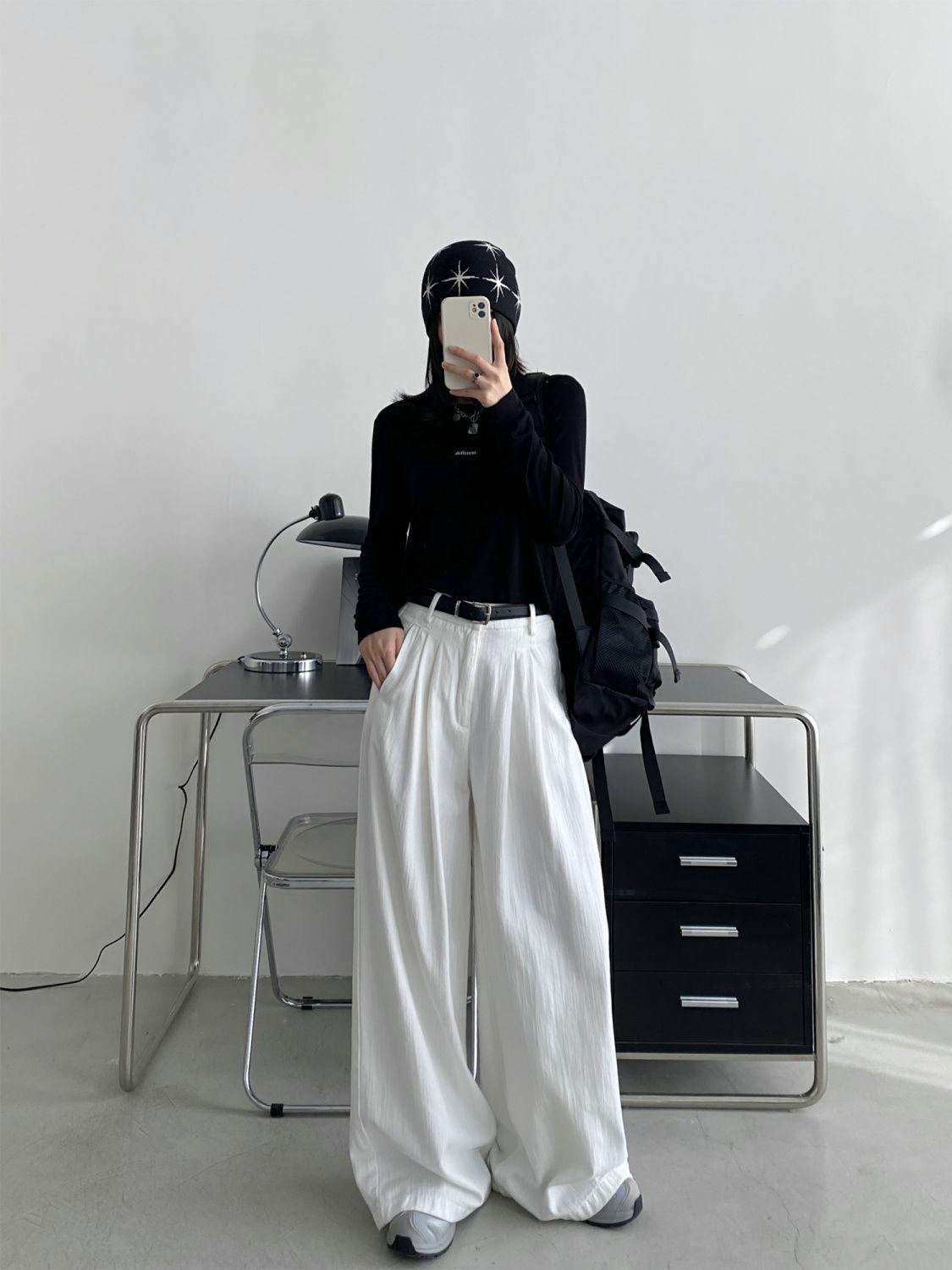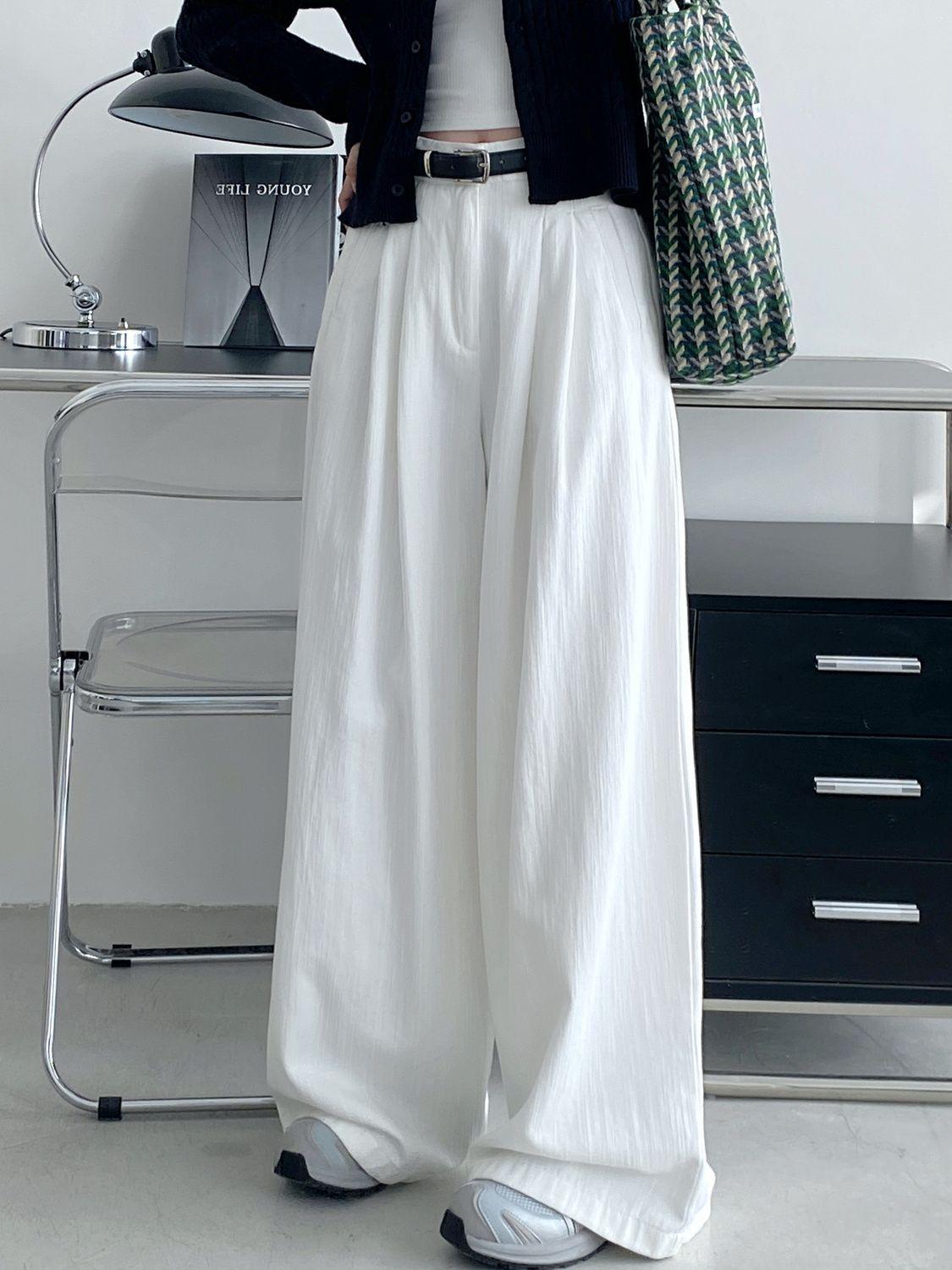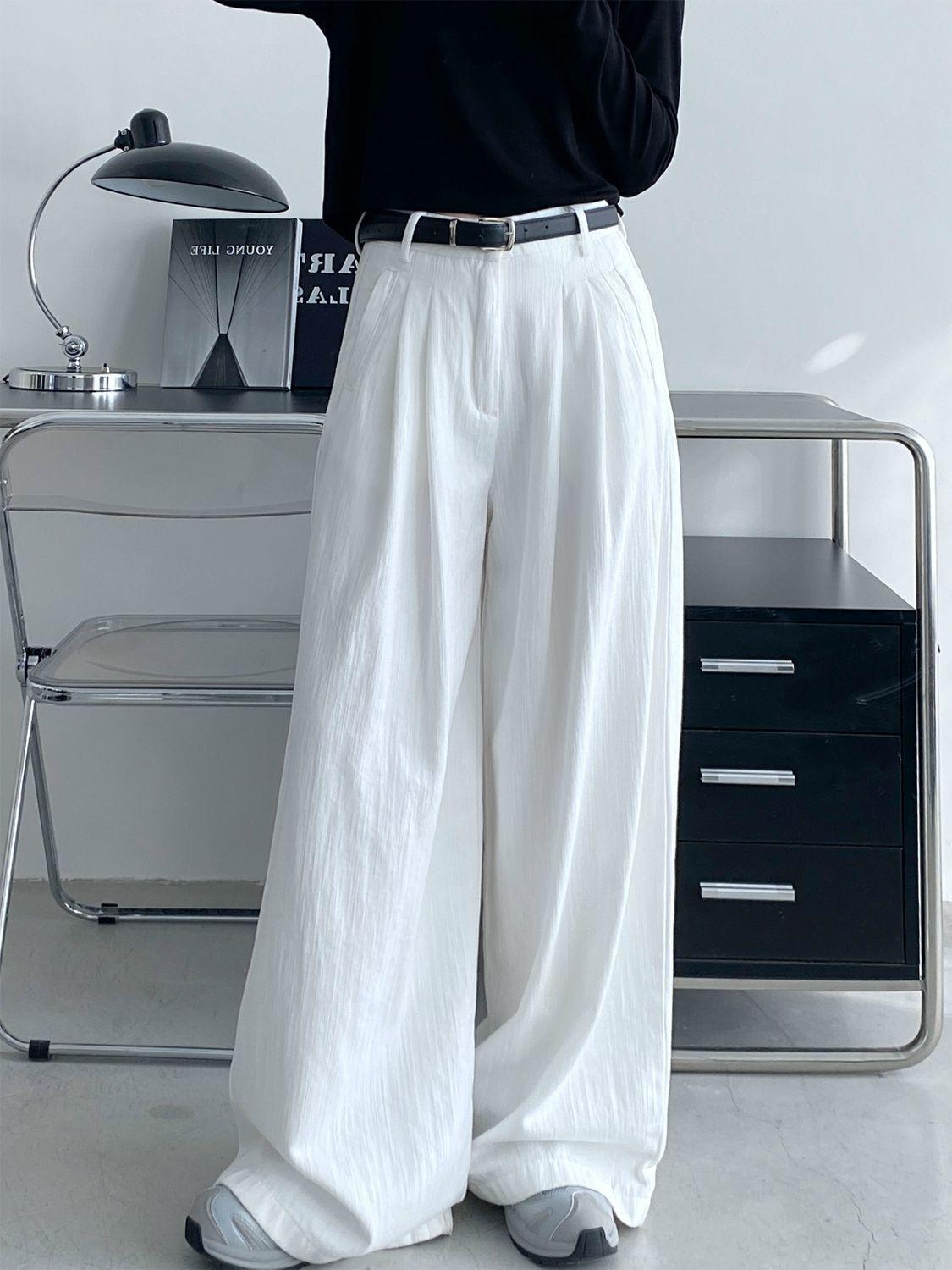 Jeans Blancos Holgados de Cintura Alta para Mujer Otoño Diseño con Dobles Pliegues Sensación Adelgazante Pierna Ancha Modernos Pantalones de Moda