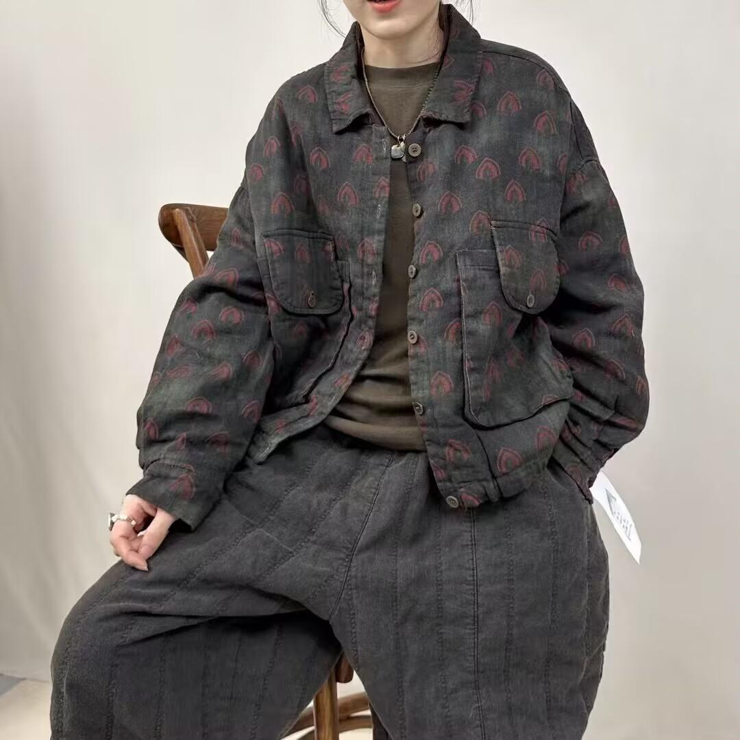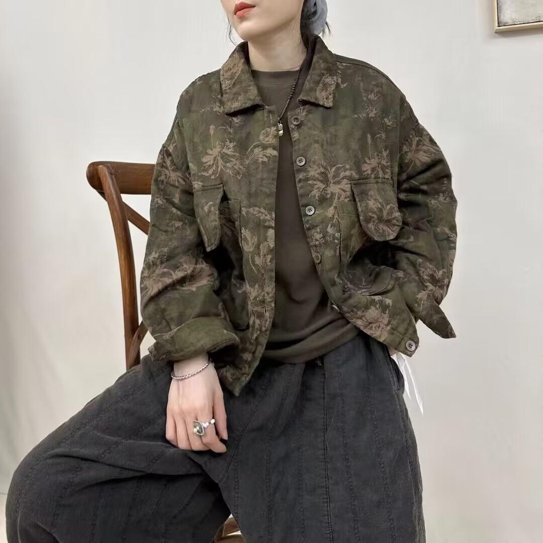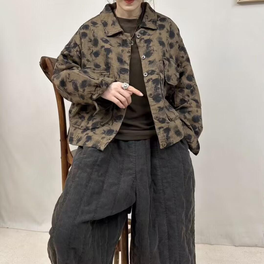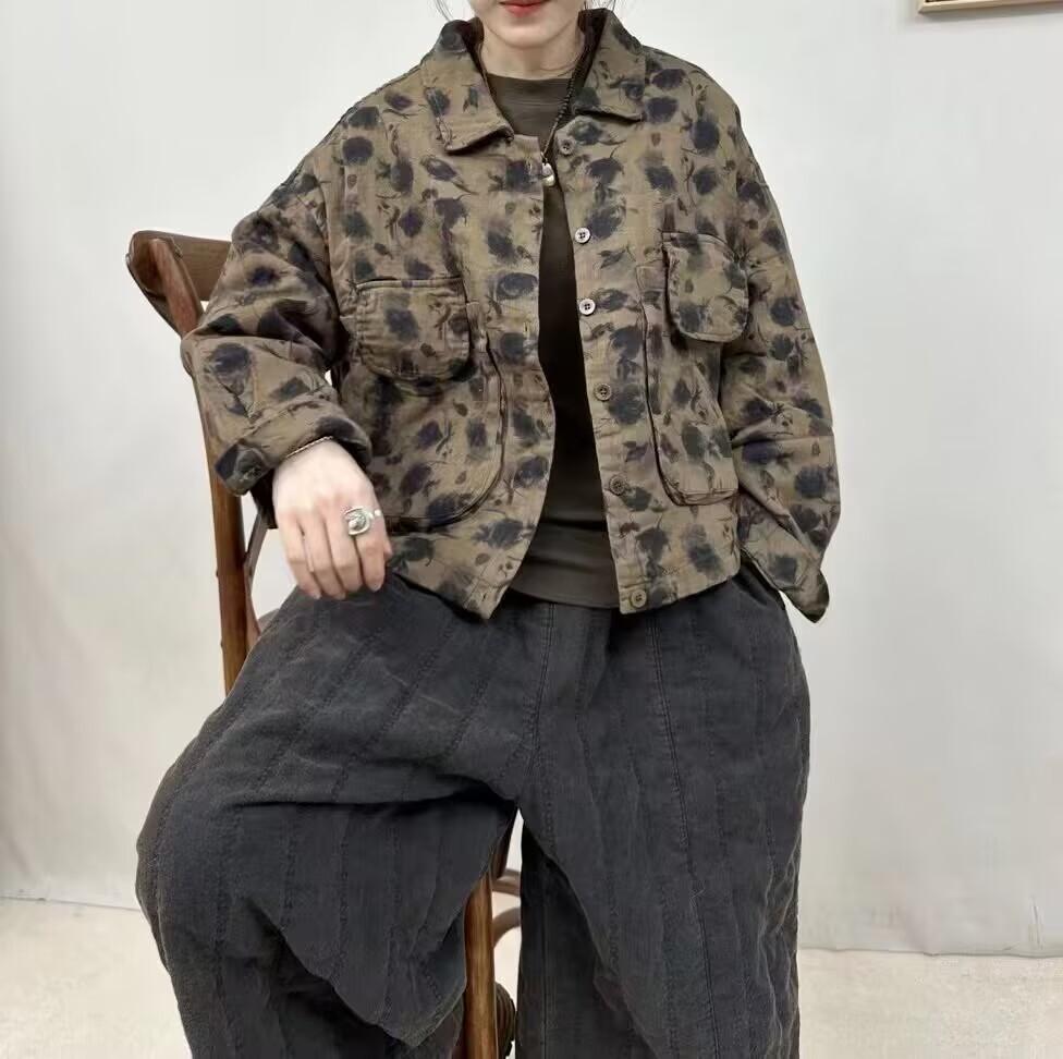 Chaqueta corta acolchada de algodón para mujer, otoño e invierno 2024, nueva chaqueta vintage estampada, informal, combinable, holgada y cálida.