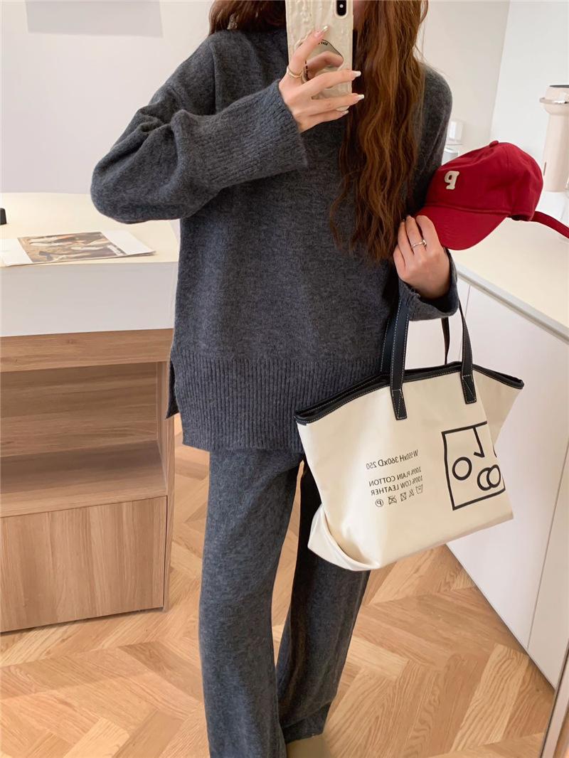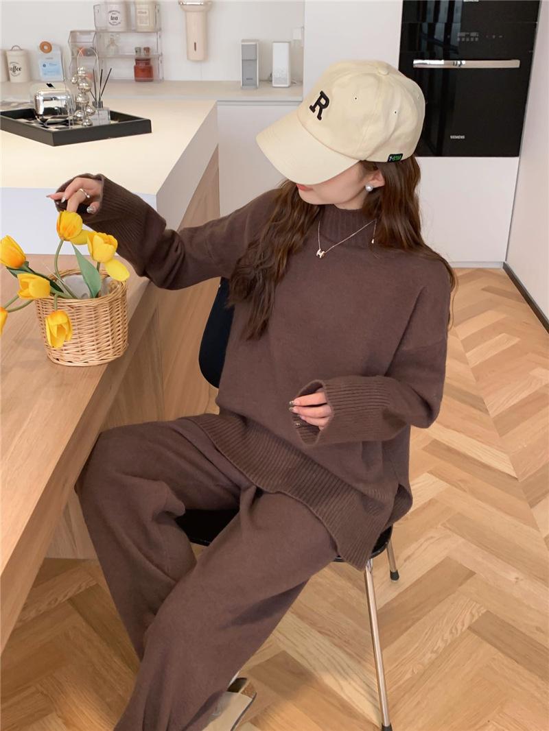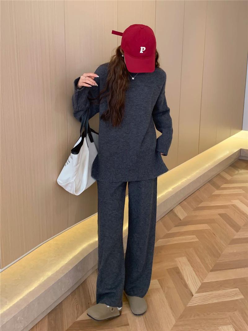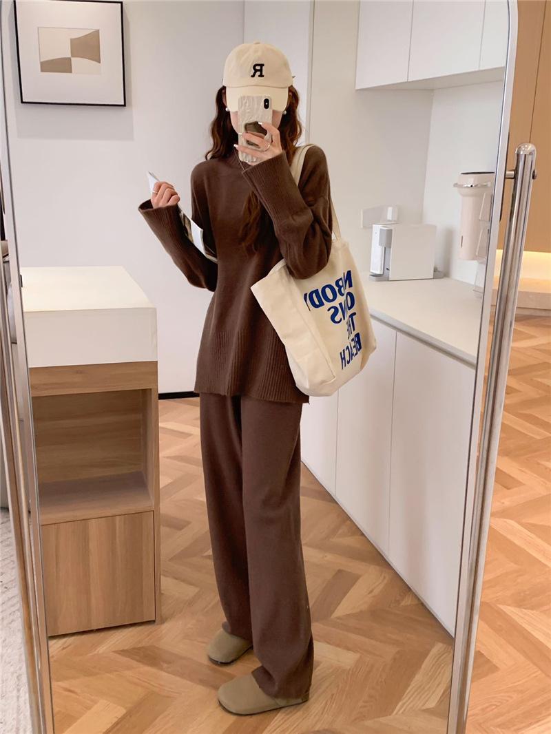 Traje tejido de estilo occidental de moda casual para mujer, otoño e invierno, nuevo, sentido de alta gama, suéter holgado, pantalones de pierna ancha, conjunto de dos piezas