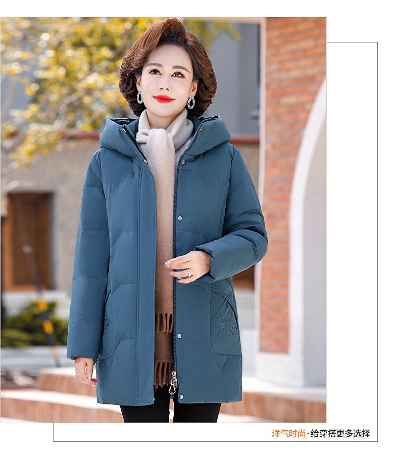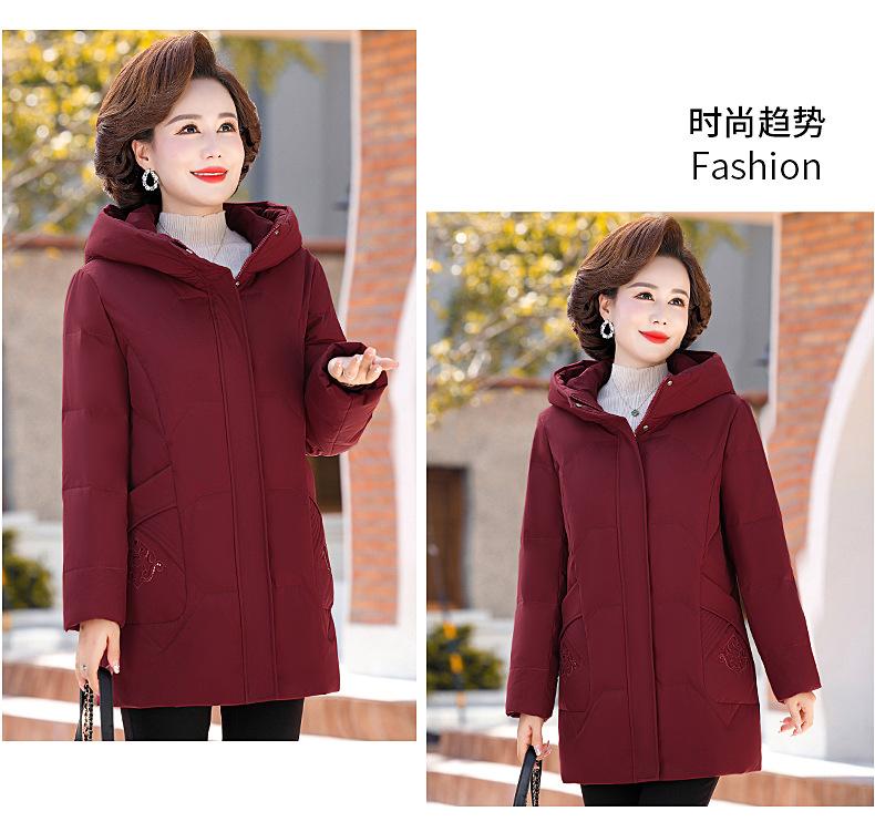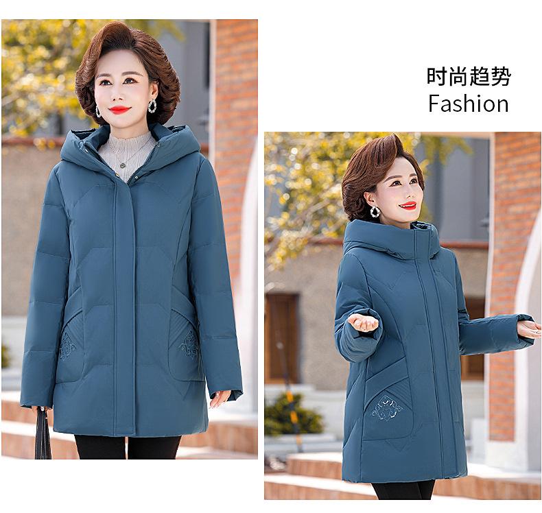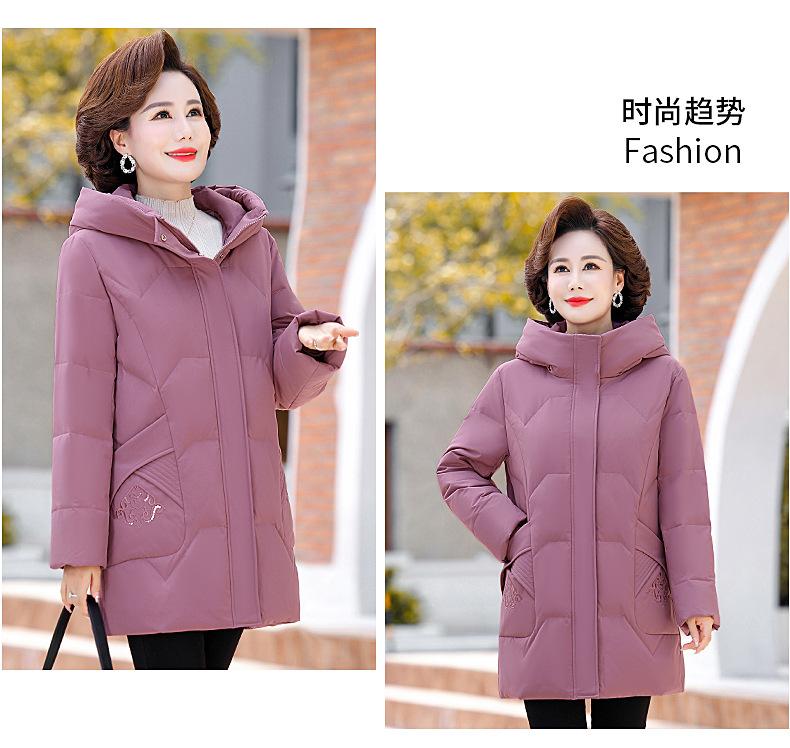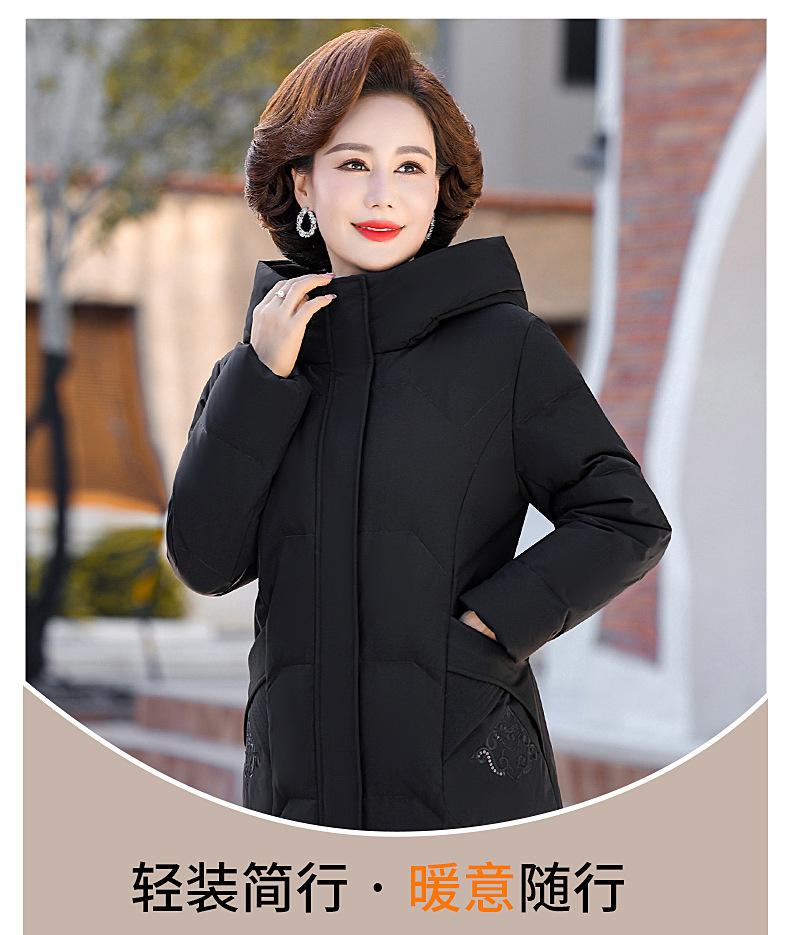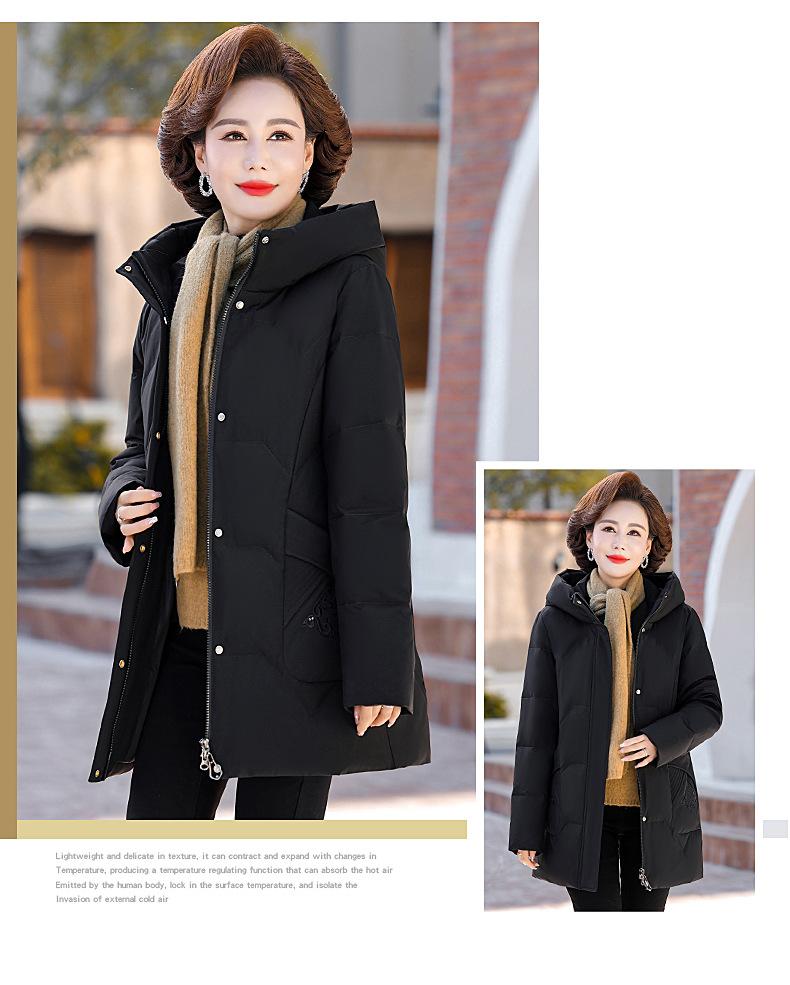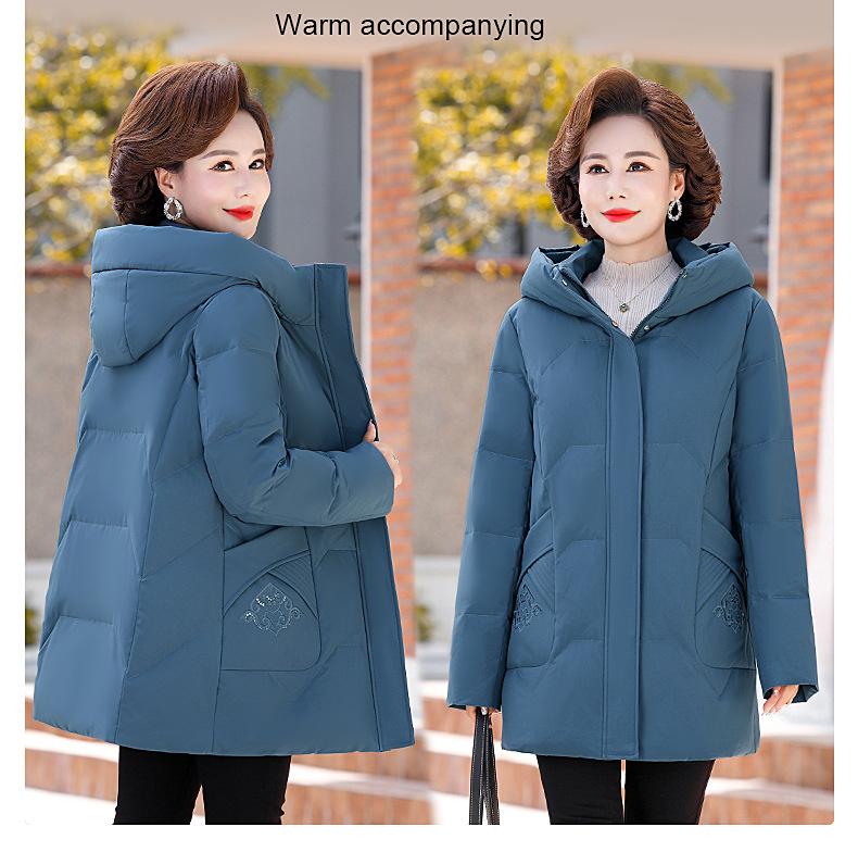 Abrigo de plumón de pato blanco cálido de estilo occidental moderno para madres de mediana edad y mayores, nueva chaqueta de plumón larga con capucha para mujer para invierno