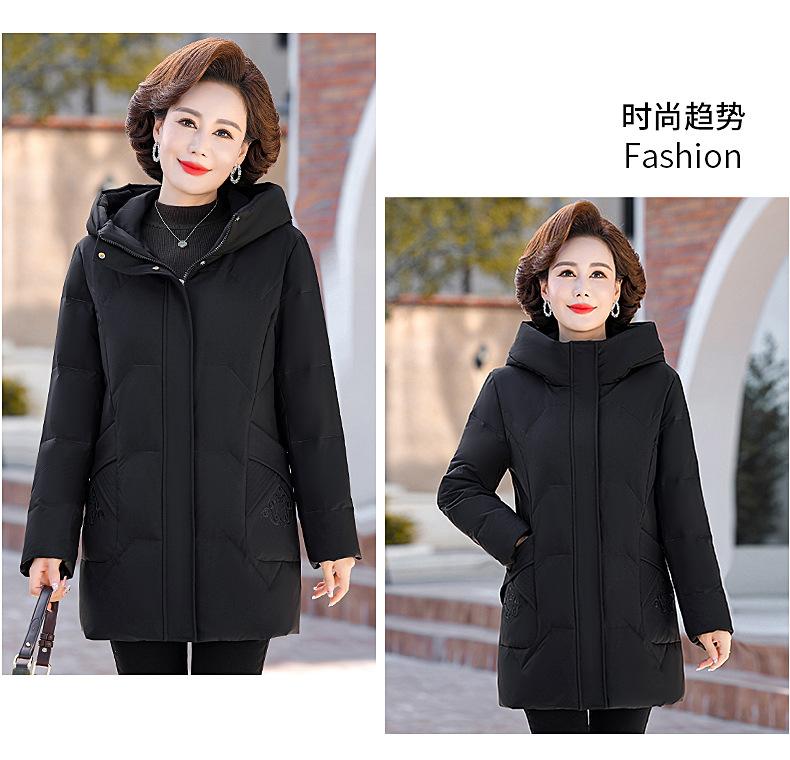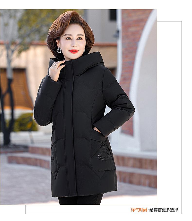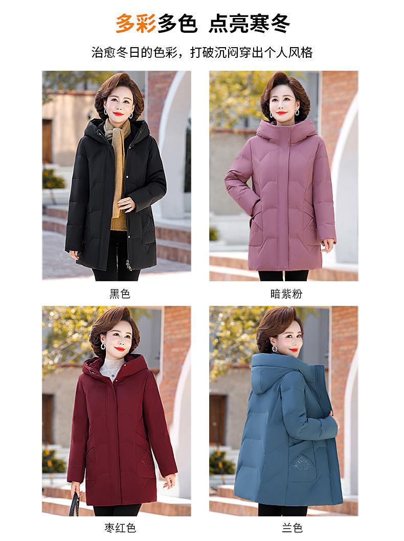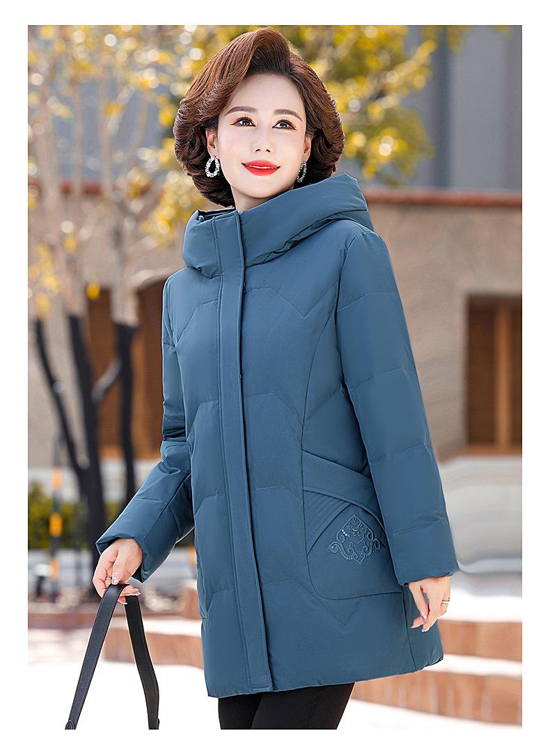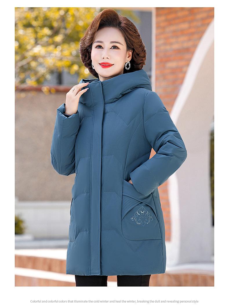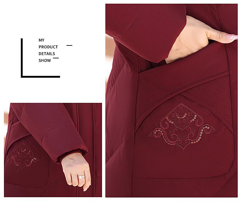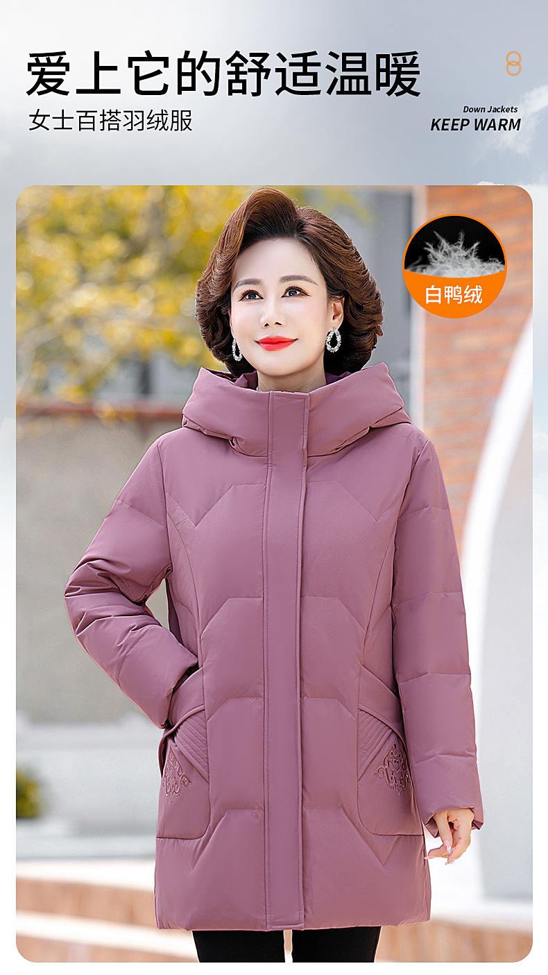 Abrigo de plumón de pato blanco cálido de estilo occidental moderno para madres de mediana edad y mayores, nueva chaqueta de plumón larga con capucha para mujer para invierno