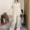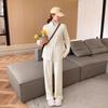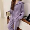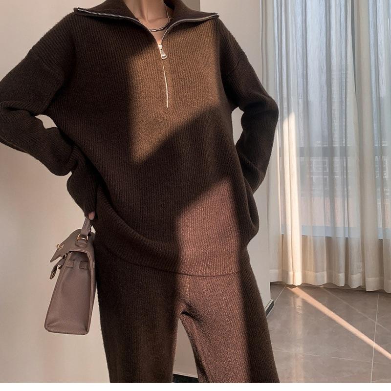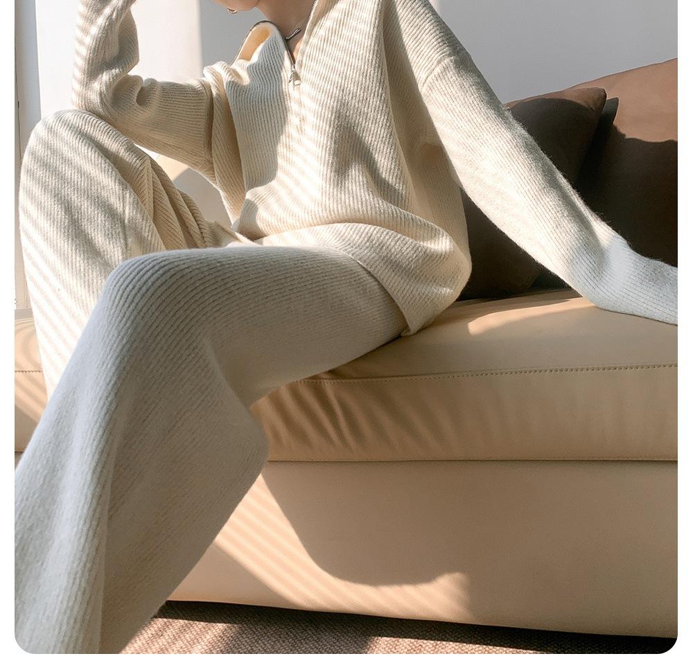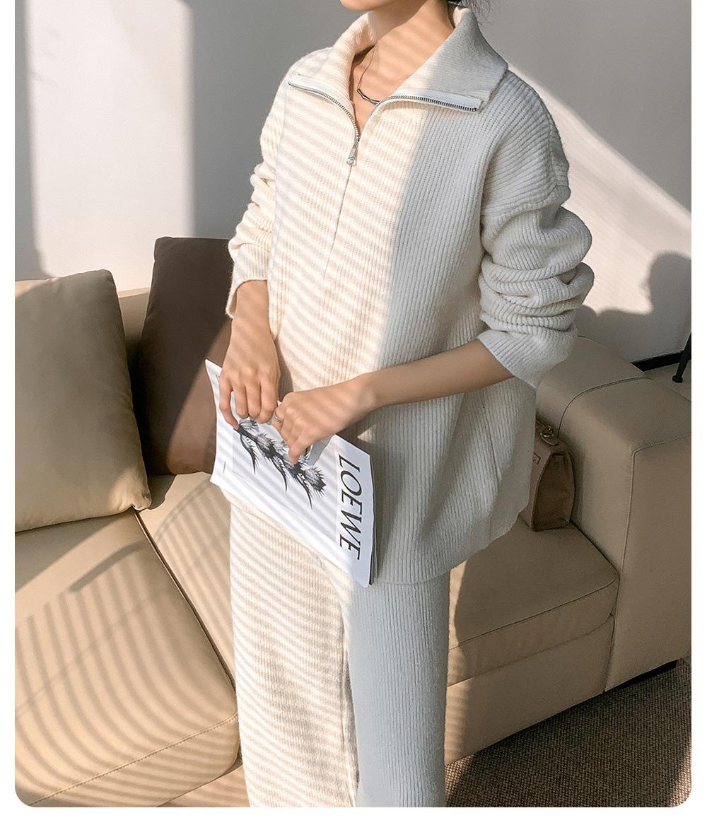 Traje de suéter pulóver con cremallera de cuello alto para mujer, otoño e invierno 2024, versión coreana de pantalones de punto holgados de color sólido de pierna ancha, conjunto de dos piezas