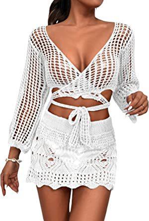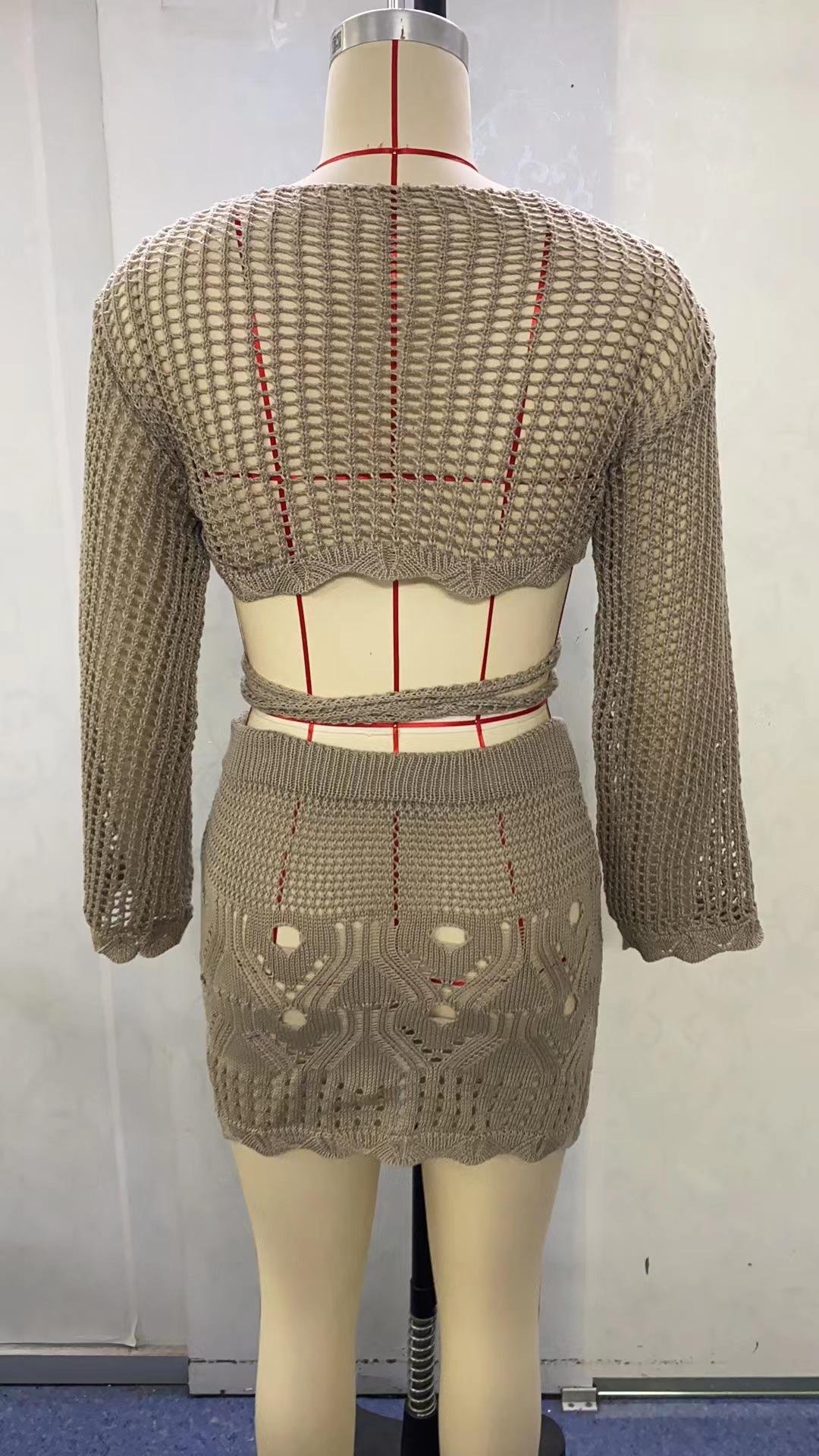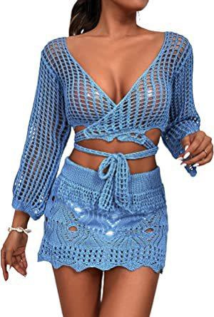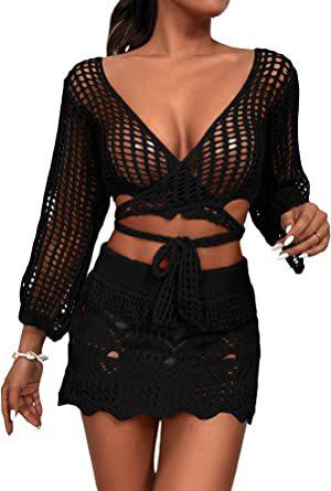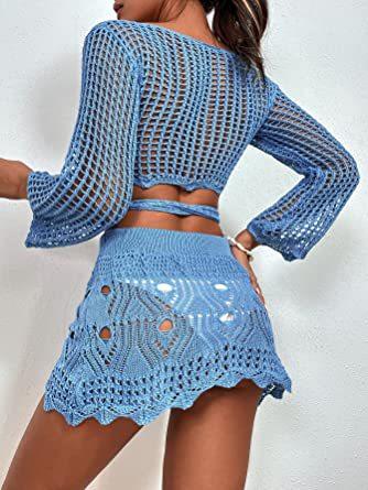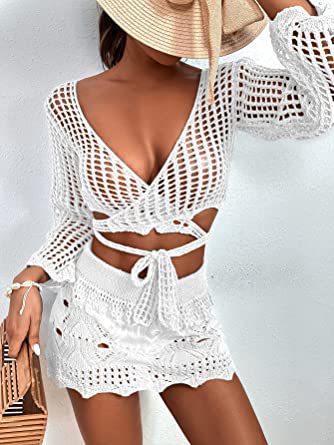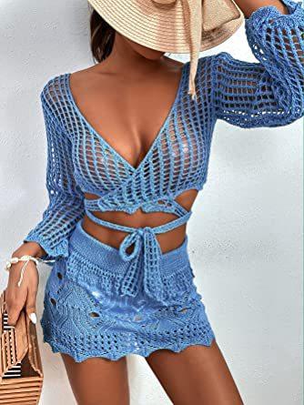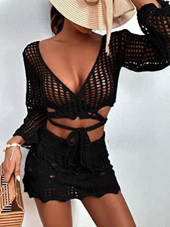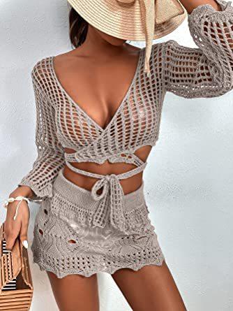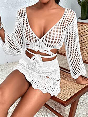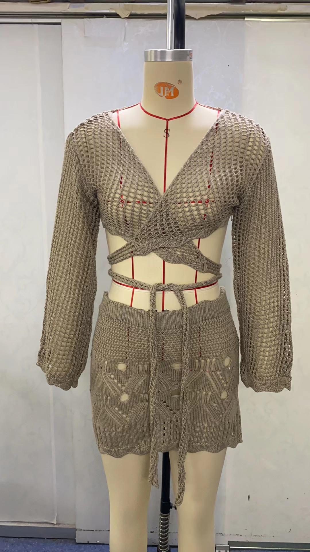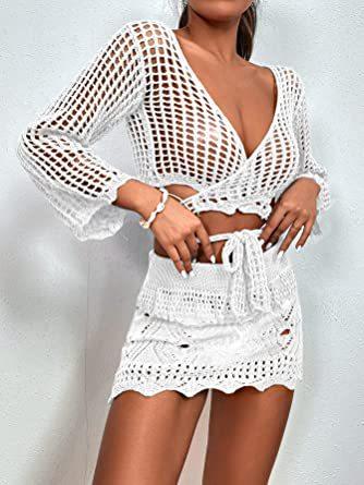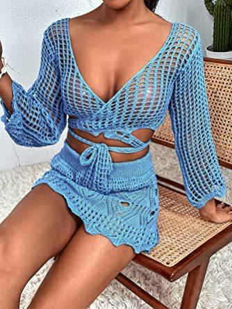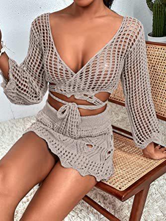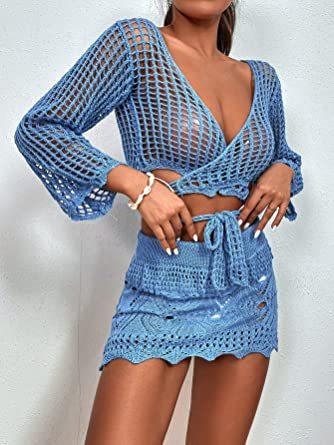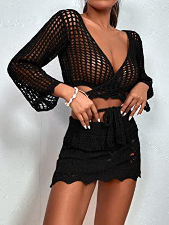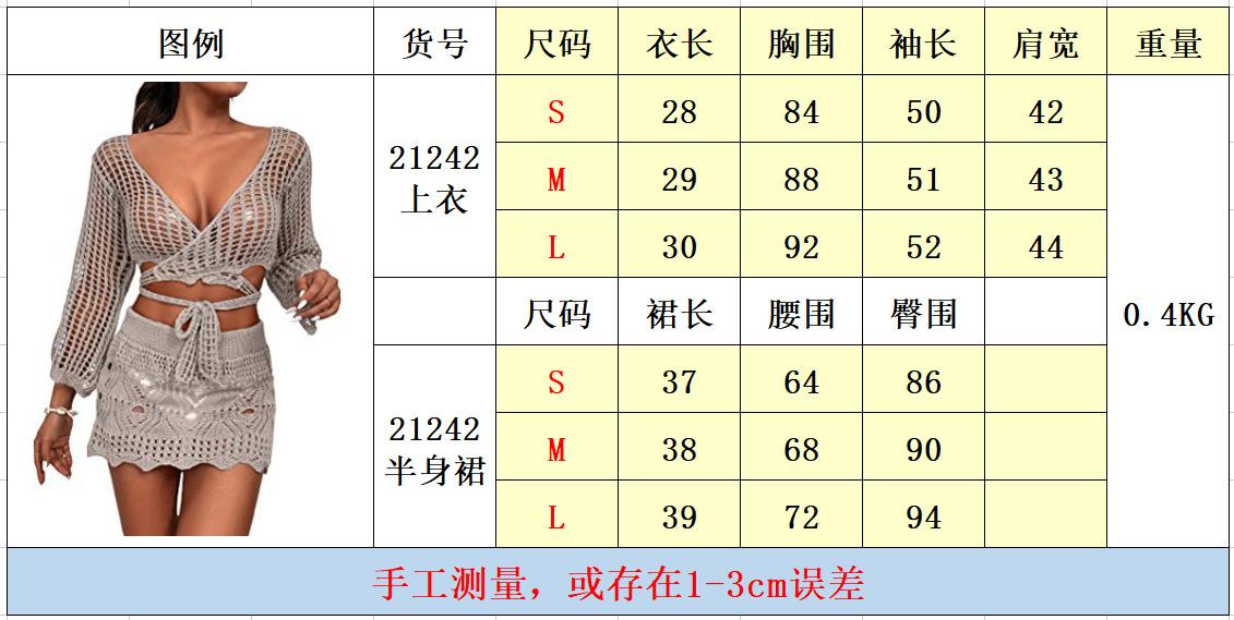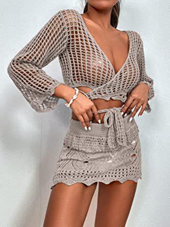 AliExpress Verano para Mujer Europeo y Americano Cuello en V Tirantes Cruzados Ombligo Camisa Tejida Calada Sexy Falda de Cadera Traje
