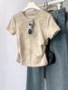 Camiseta de manga corta de algodón puro con hombros teñidos y diseño tie-dye para mujer, de verano, con cintura ajustada y diseño adelgazante.
