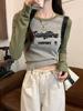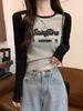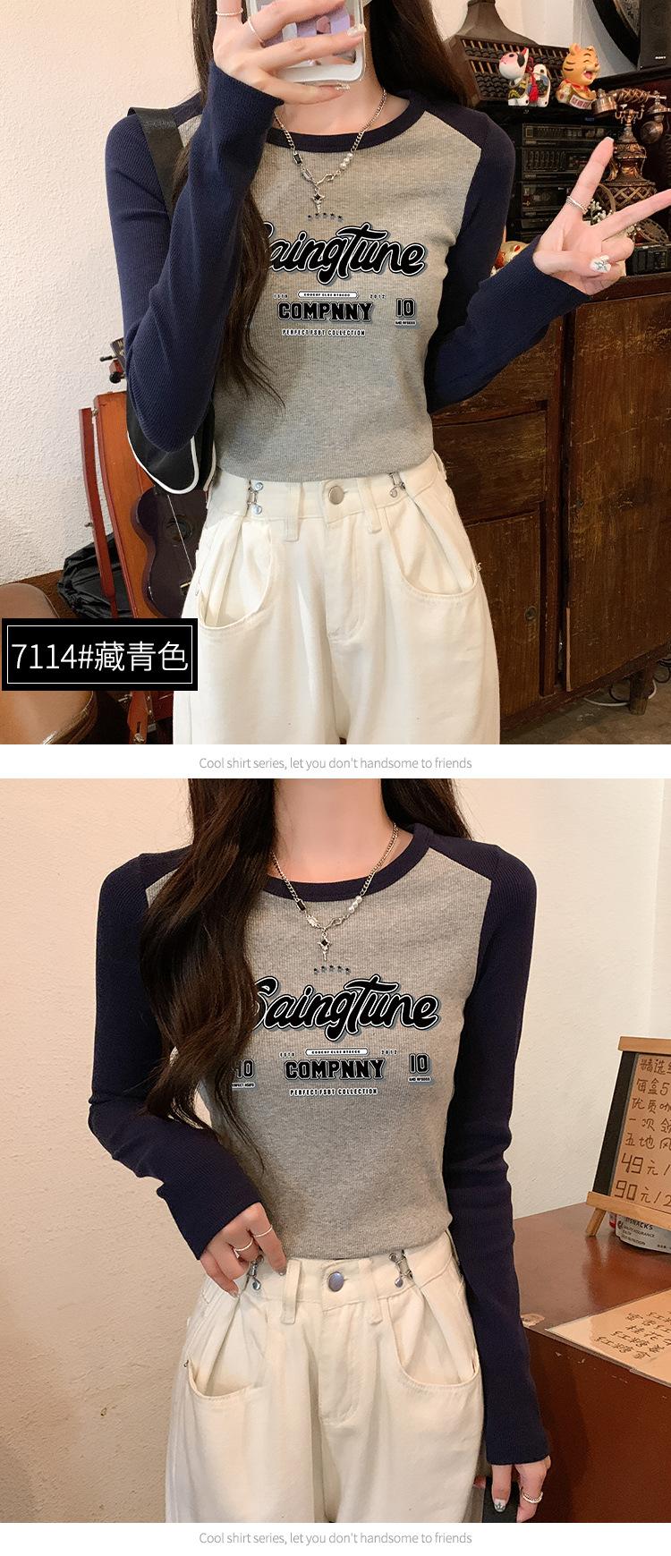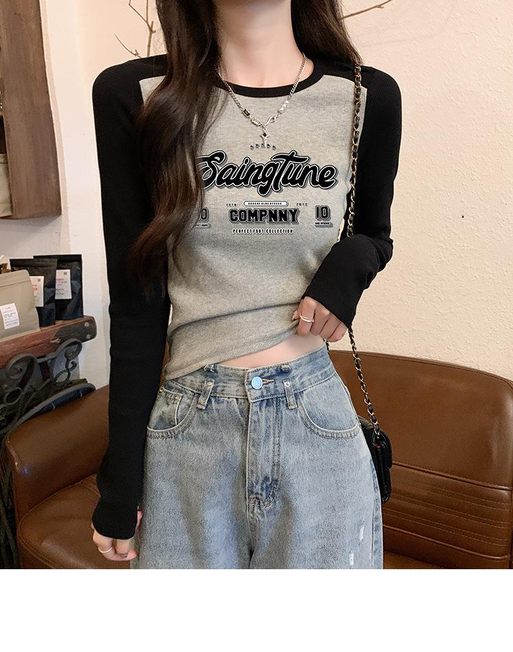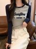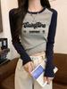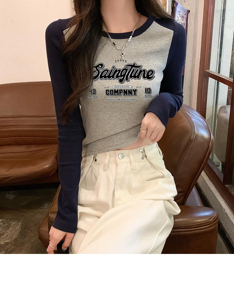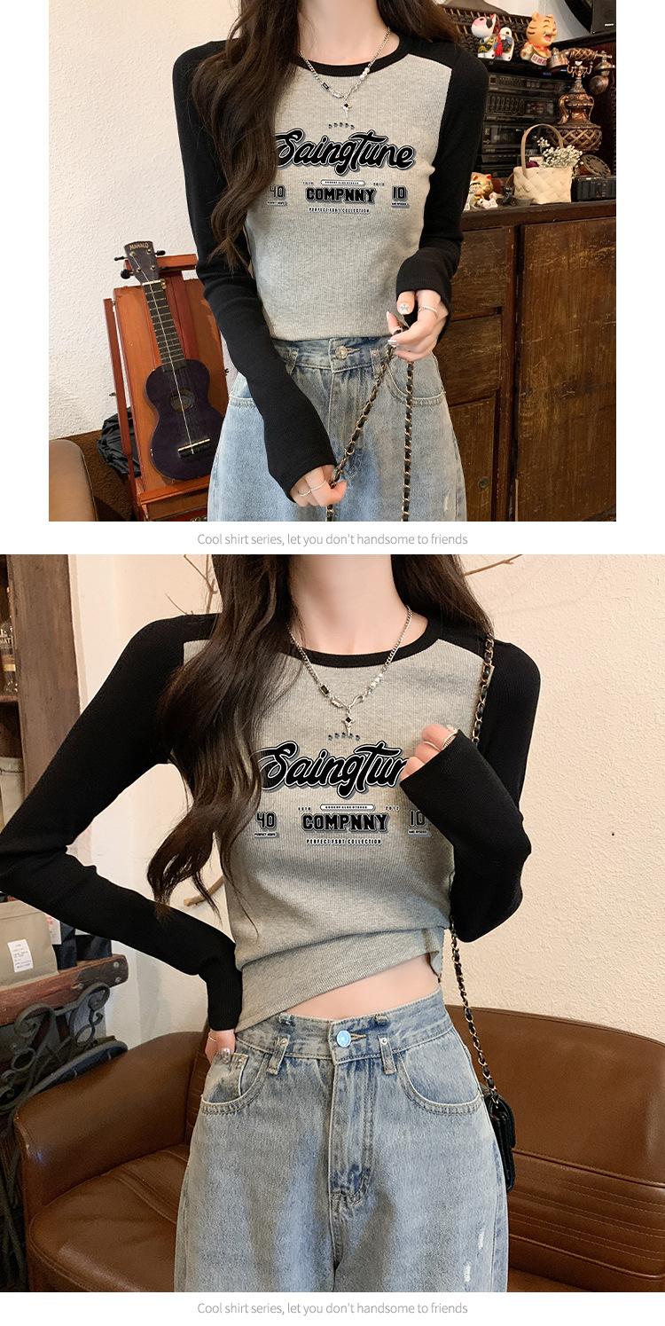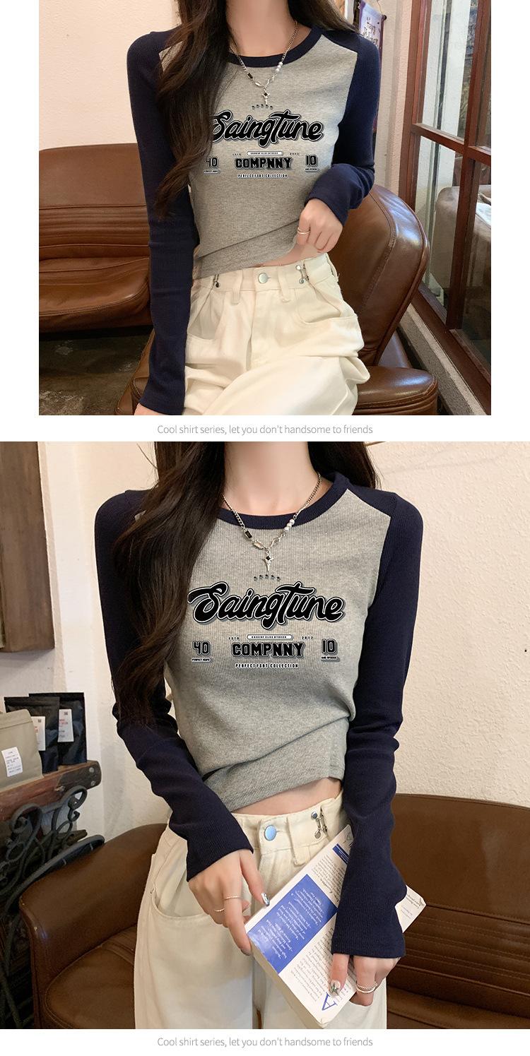 Camiseta de manga larga de algodón puro estilo americano con hombros descubiertos y contraste de color retro para mujer, diseño de primavera y otoño, top corto para chica atractiva