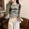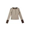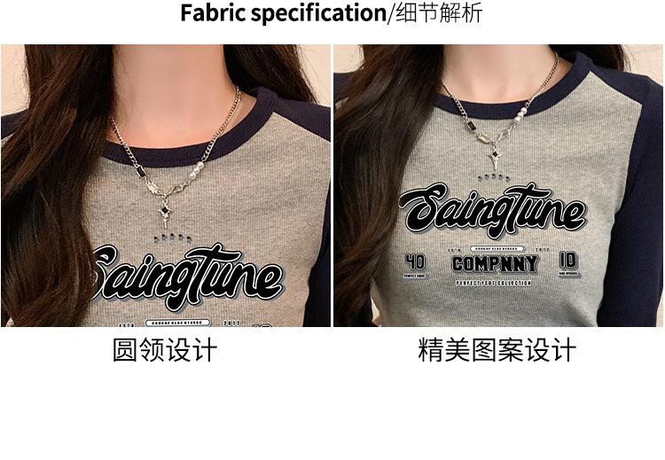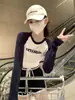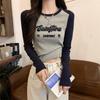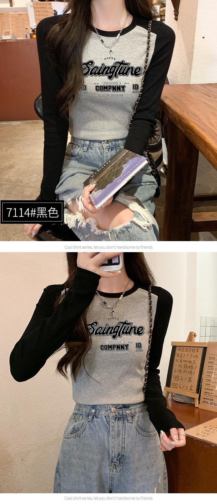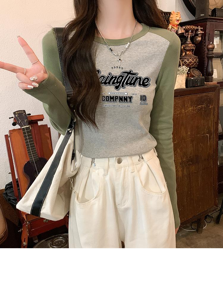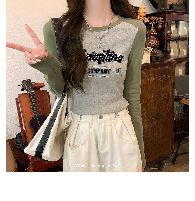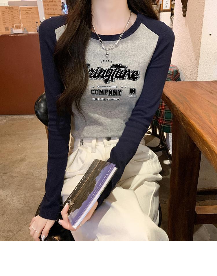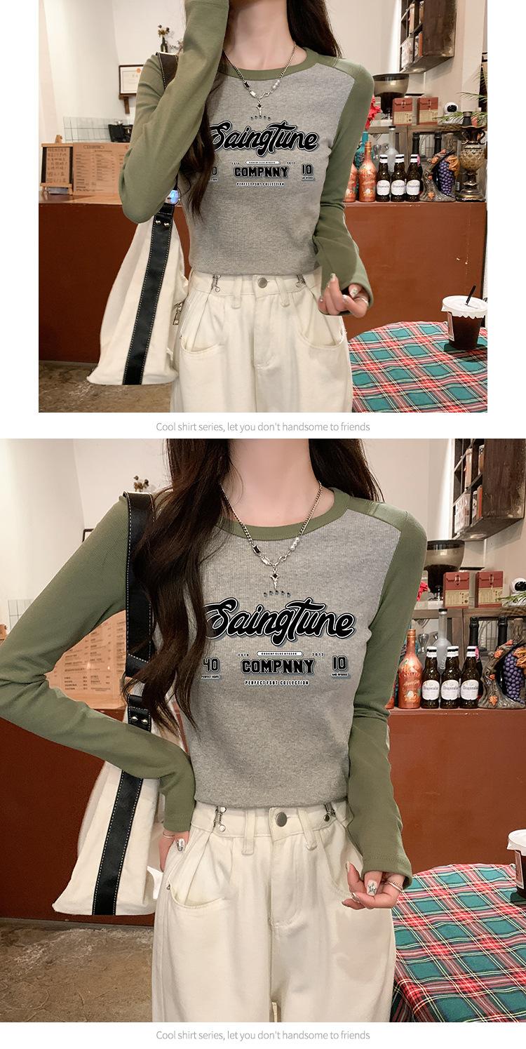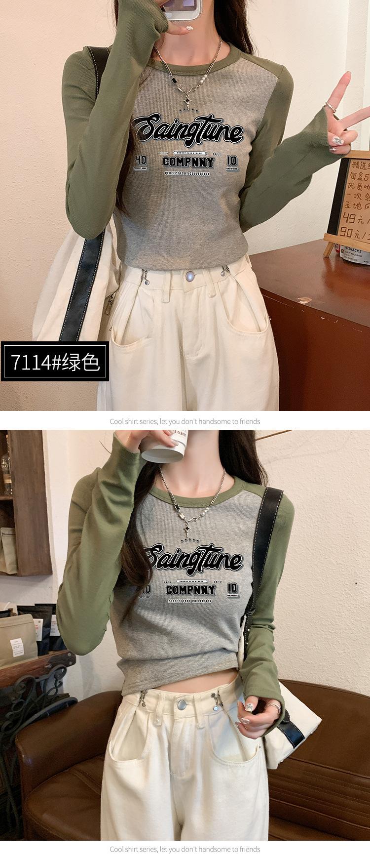 Camiseta de manga larga de algodón puro estilo americano con hombros descubiertos y contraste de color retro para mujer, diseño de primavera y otoño, top corto para chica atractiva