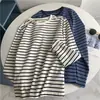 Camiseta básica de manga larga de algodón puro a rayas con cuello redondo estilo coreano para mujer, estilo retro, holgada, adelgazante y combinable.