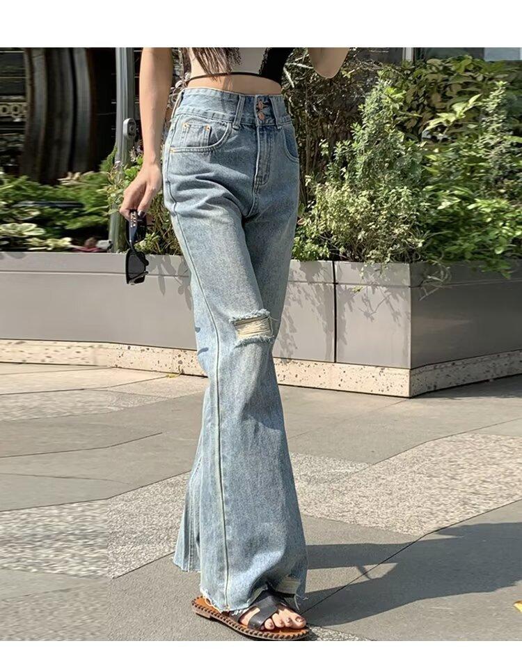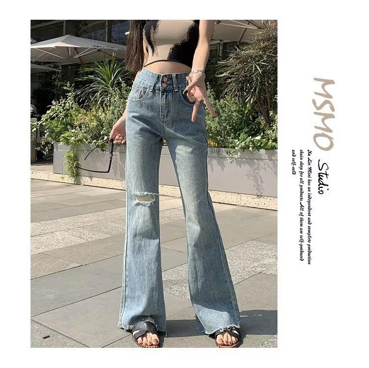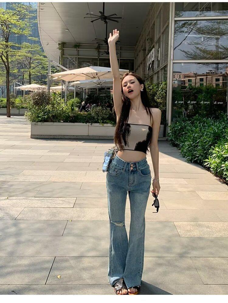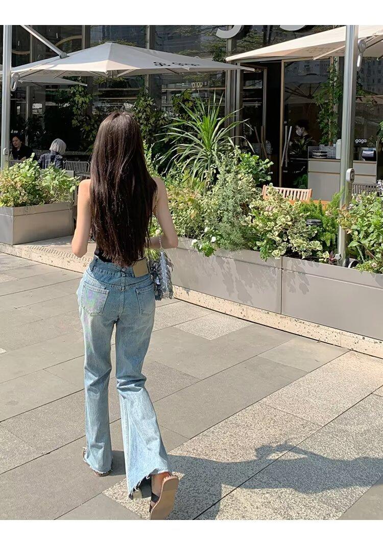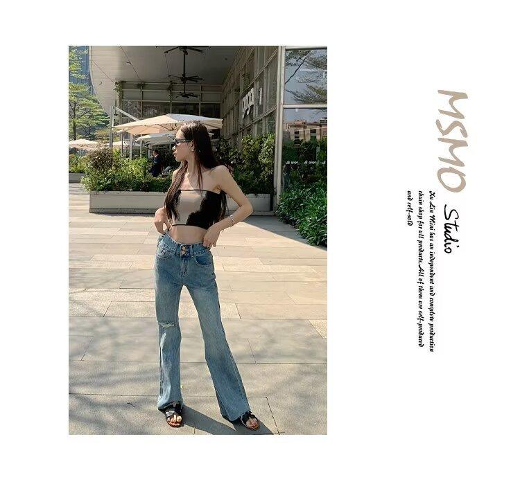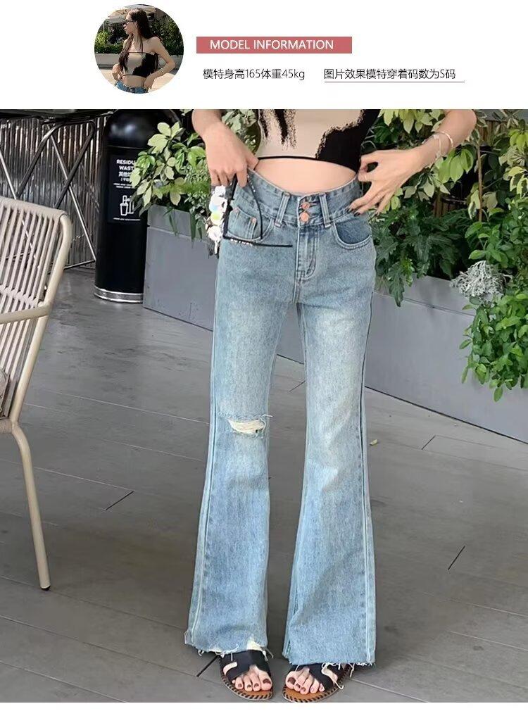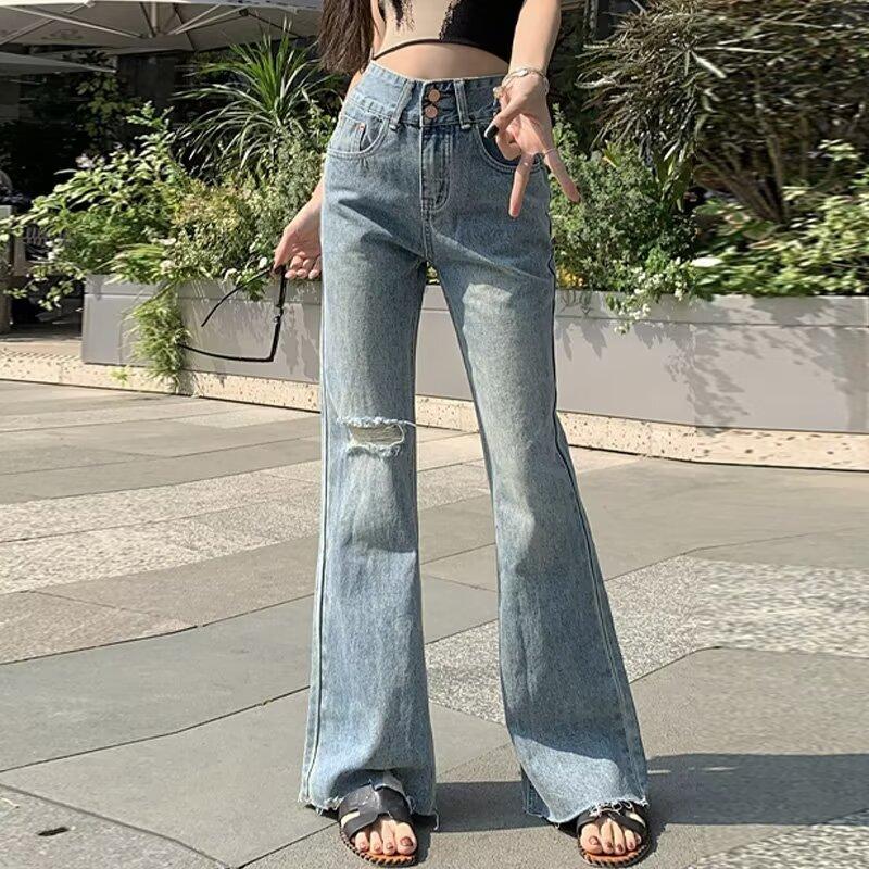 Vaqueros de otoño para mujer, ajustados, sexys y sexys, vaqueros retro con abertura y tiras con borde sin rematar para mujer, verano