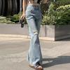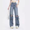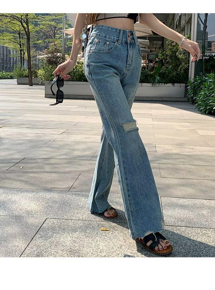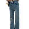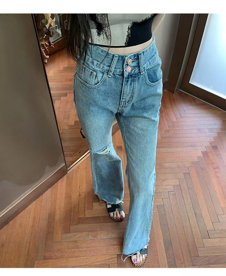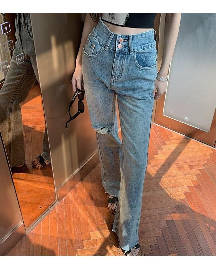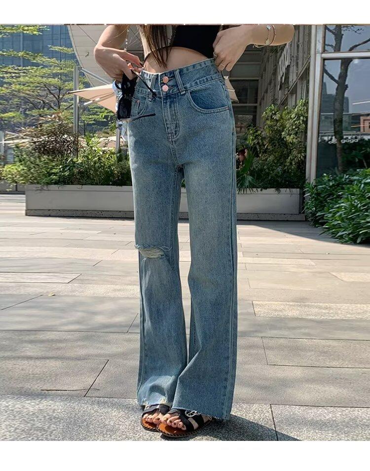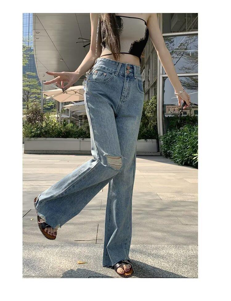 Nuevo estilo de jeans rectos rotos para mujer, pantalones retro holgados y versátiles de pierna ancha, pantalones adelgazantes de cintura alta hasta el suelo.