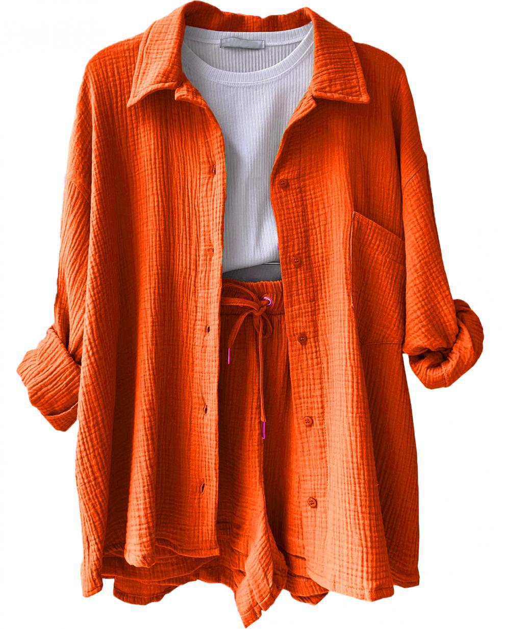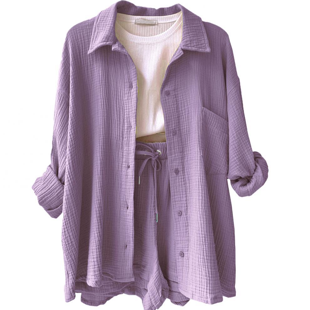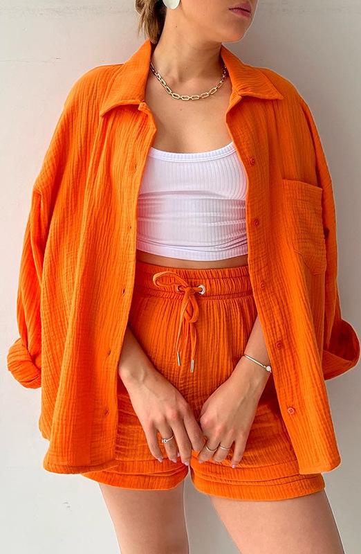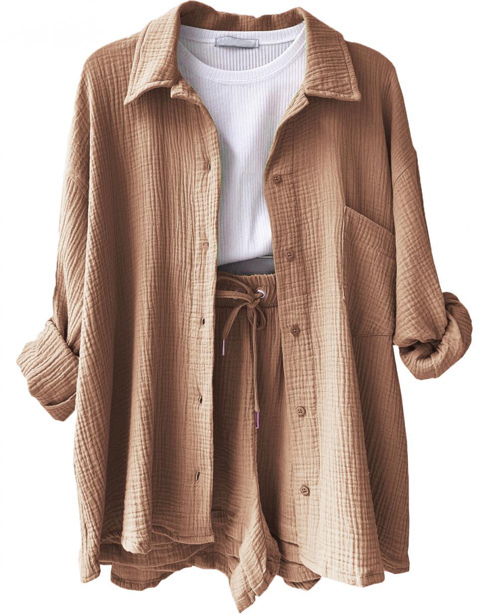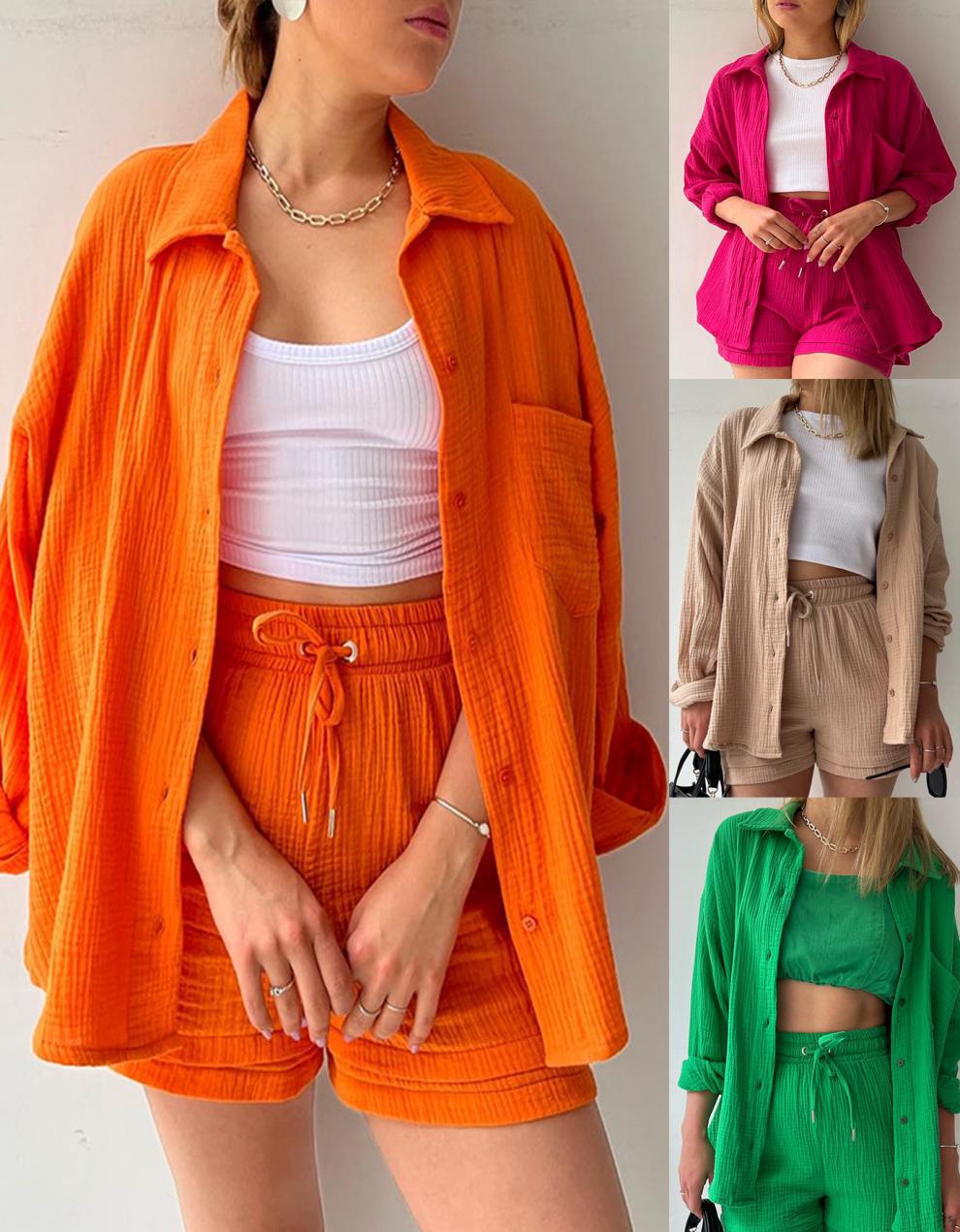 Ropa de mujer transfronteriza Amazon Europa y América camisa de manga larga con solapa con volantes pantalones cortos de cintura alta con cordón traje casual de moda