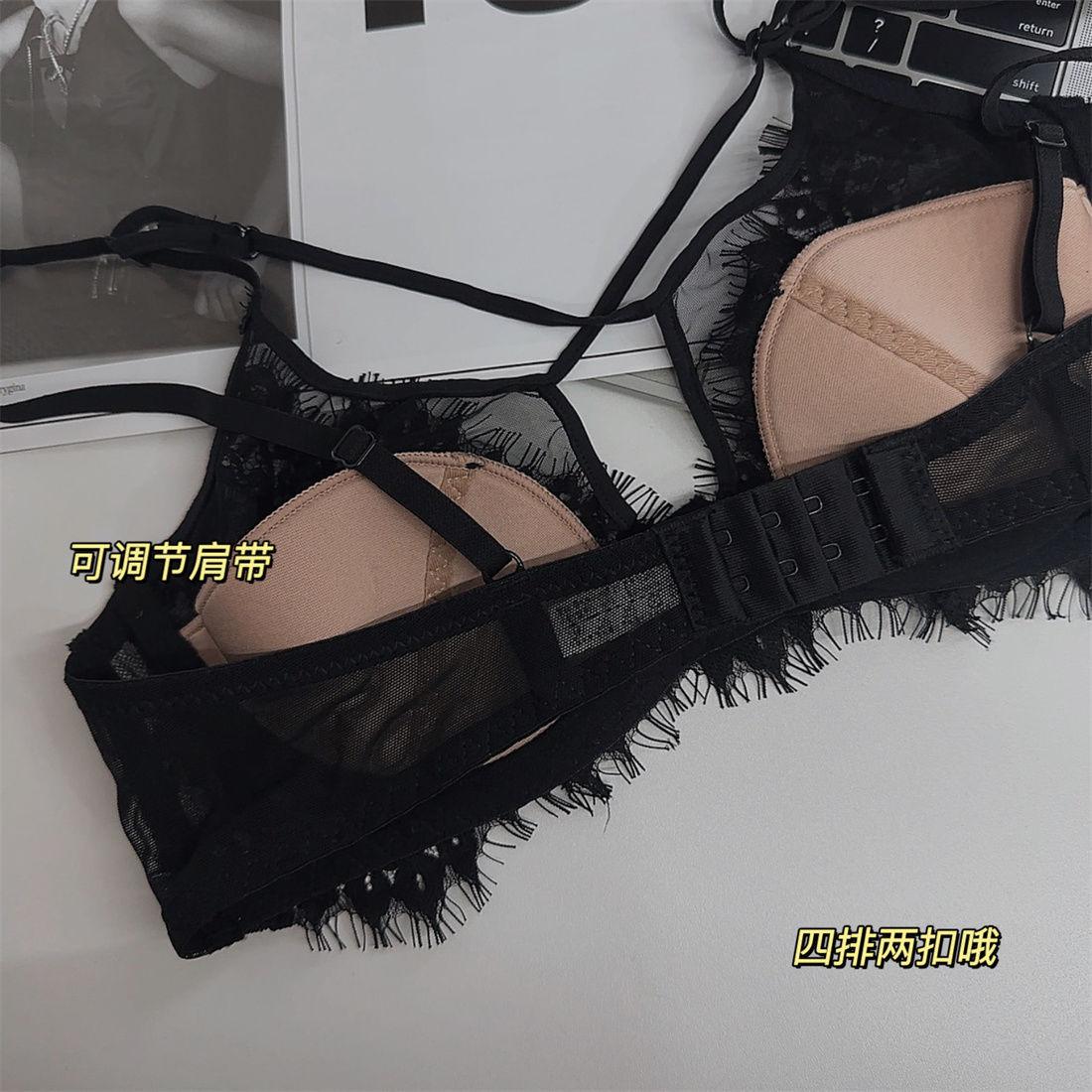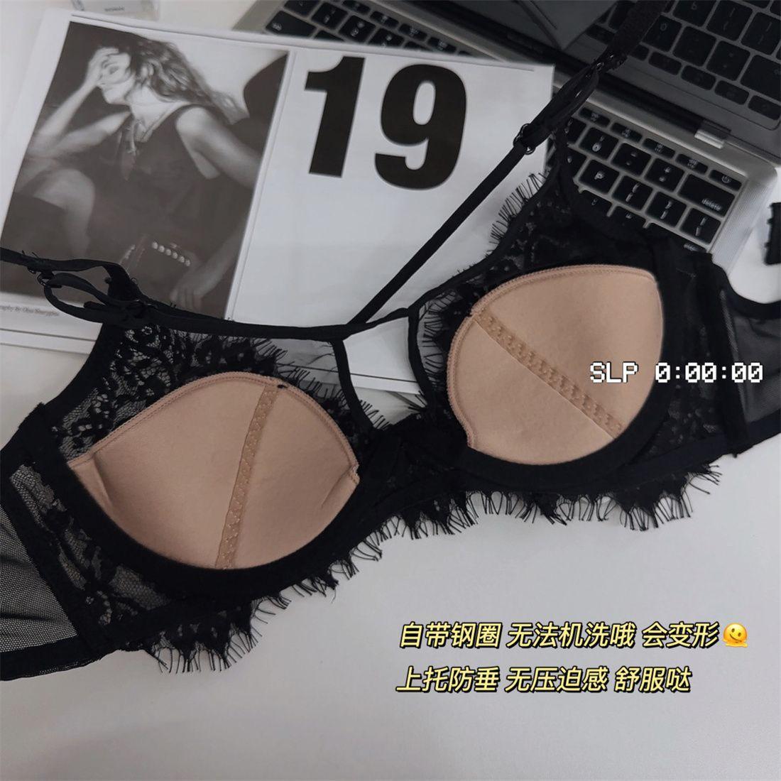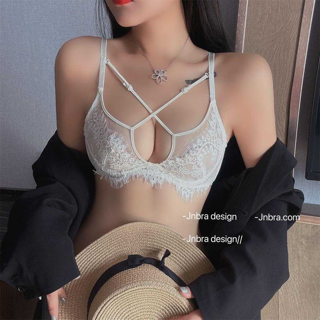 Sujetador de estilo francés sexy con aro de acero fino y cruzado con encaje hueco, push-up, ropa interior Pure Desire, con pecho despejado.