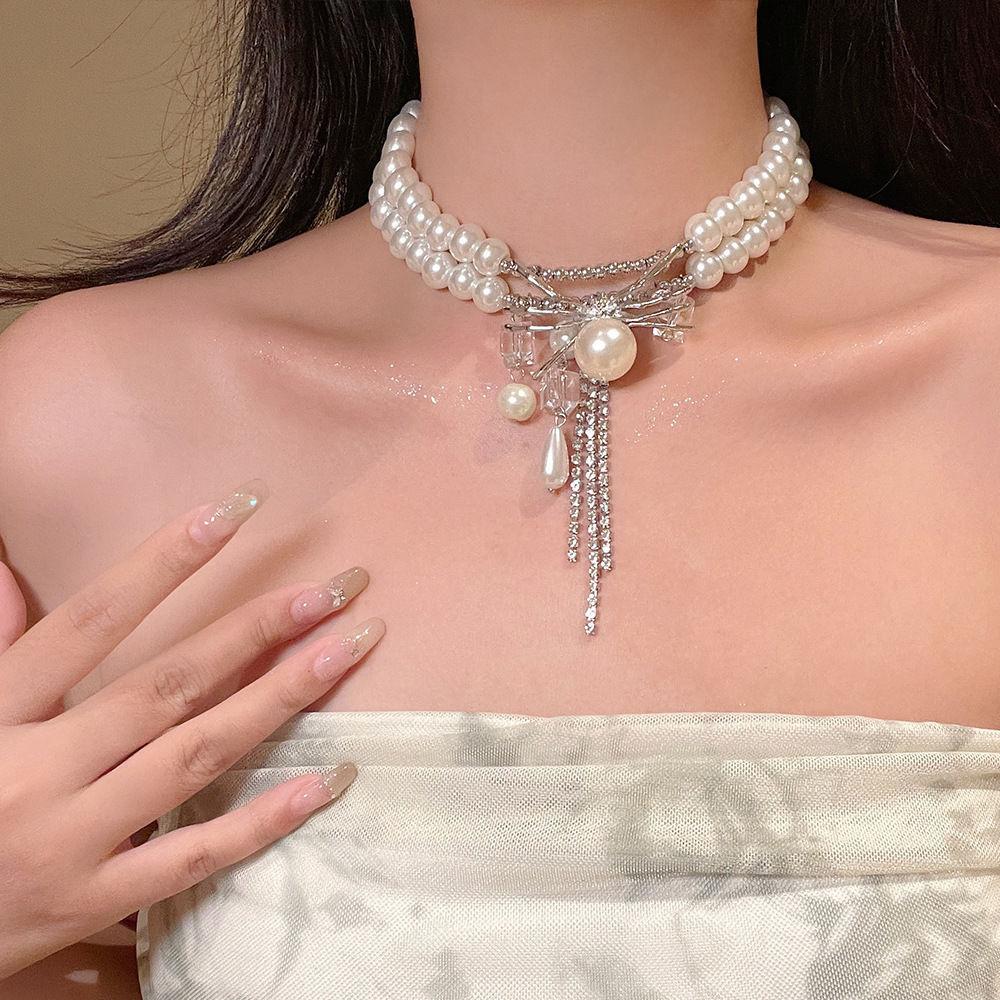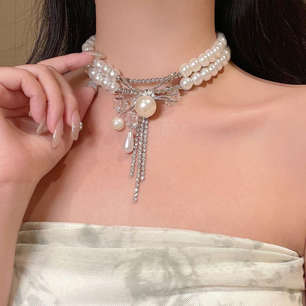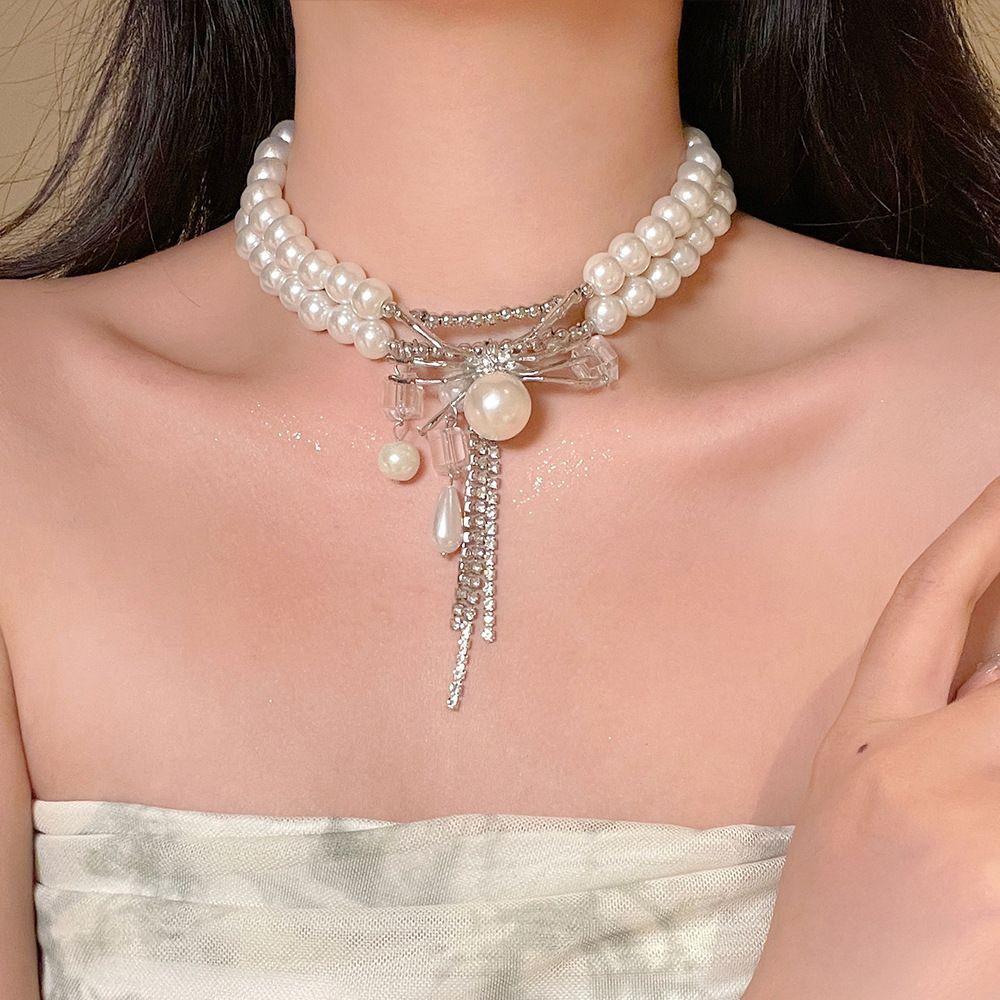 Collar con colgante de borla de araña de perla, diseño de nicho dulce y moderno, cadena de clavícula apilada de múltiples capas de lujo para mujer