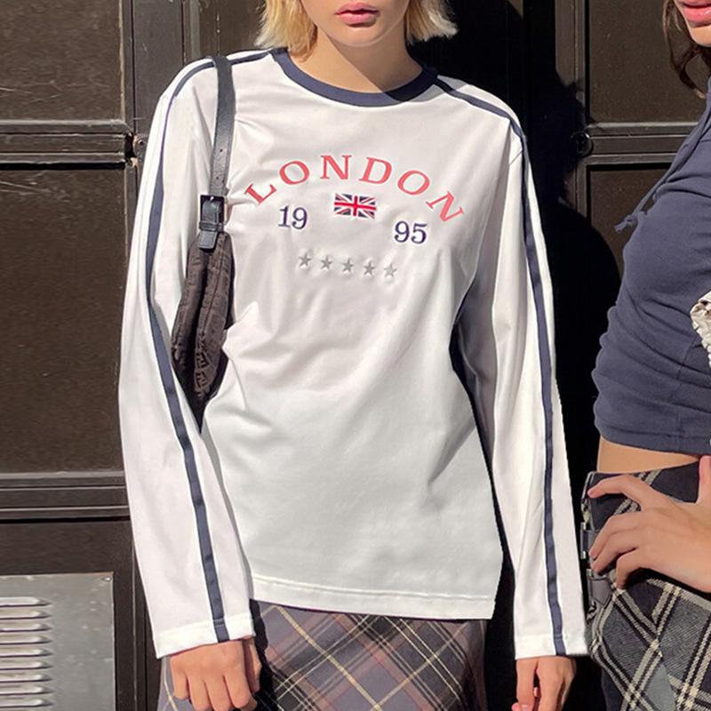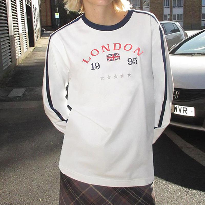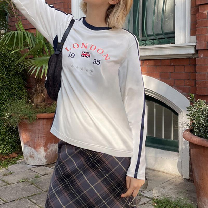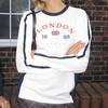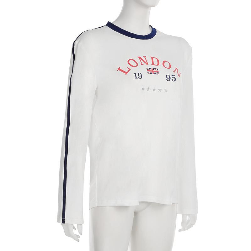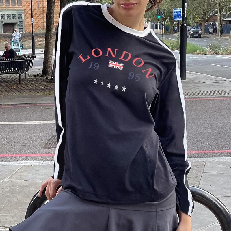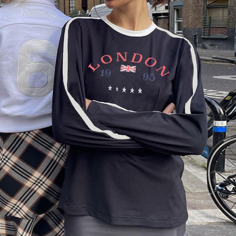 Camiseta de manga larga con estampado de letras en contraste de color, estilo informal americano de comercio exterior, estilo Spice Girls, cuello redondo, distintiva, combinable con todo, para otoño e invierno.