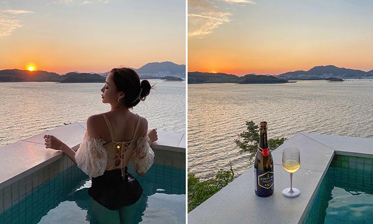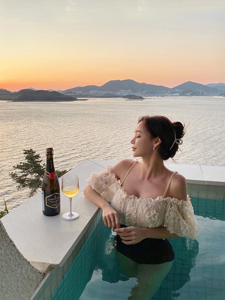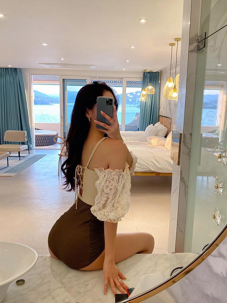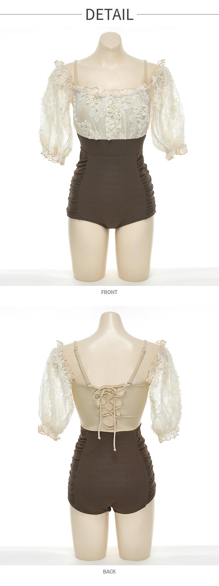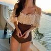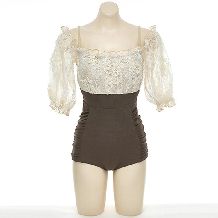 Bikini de una pieza de estilo coreano con hombros descubiertos, cintura alta, corte ajustado, adelgazante, traje de baño conservador de aguas termales con fruncido en el pecho pequeño que cubre el vientre.