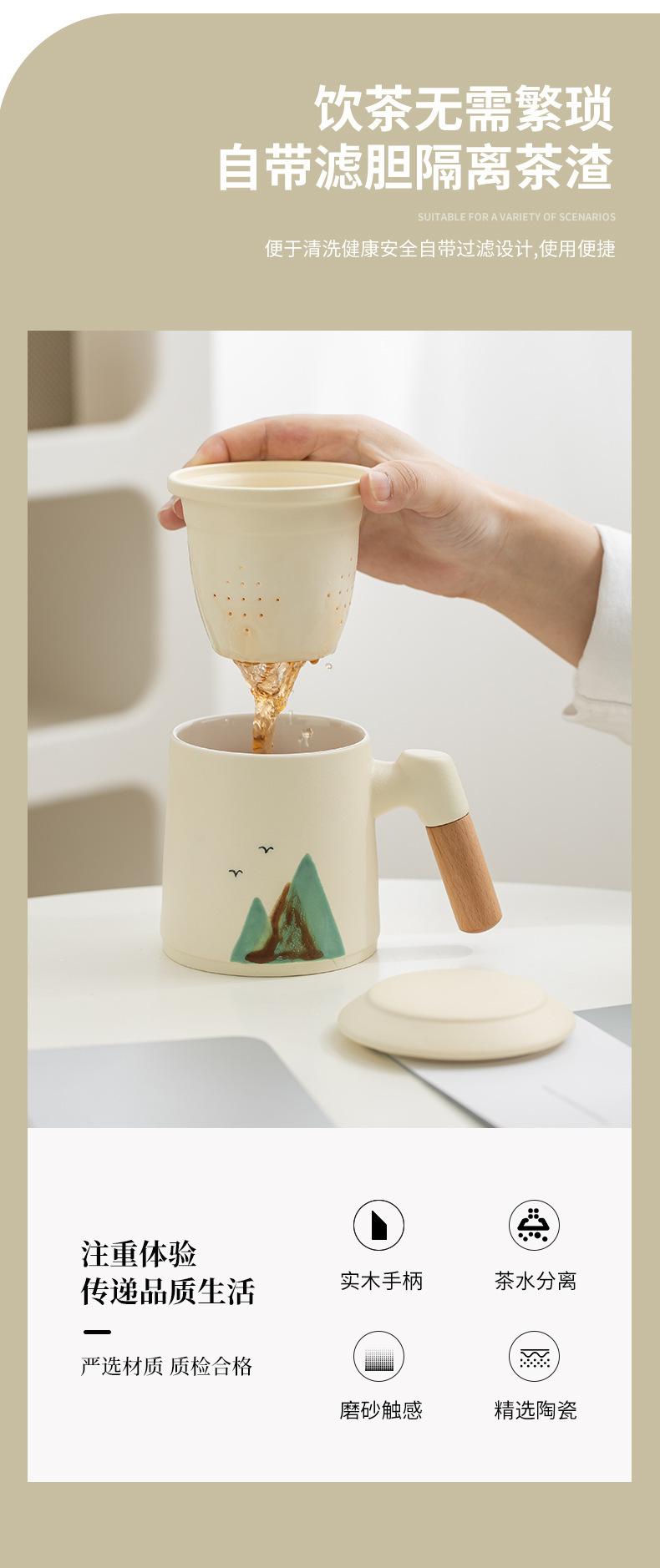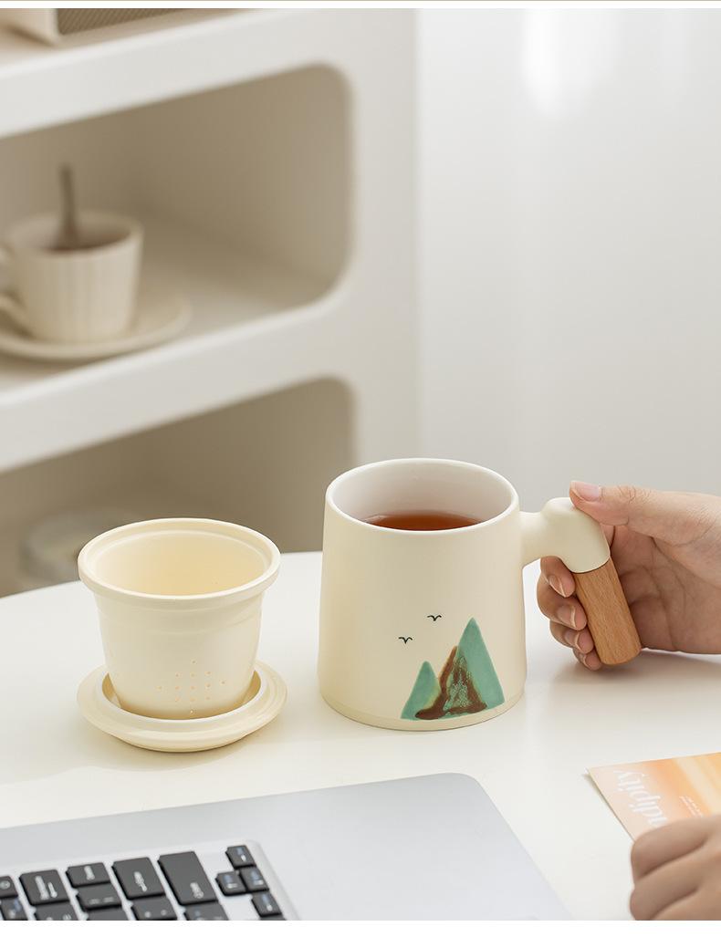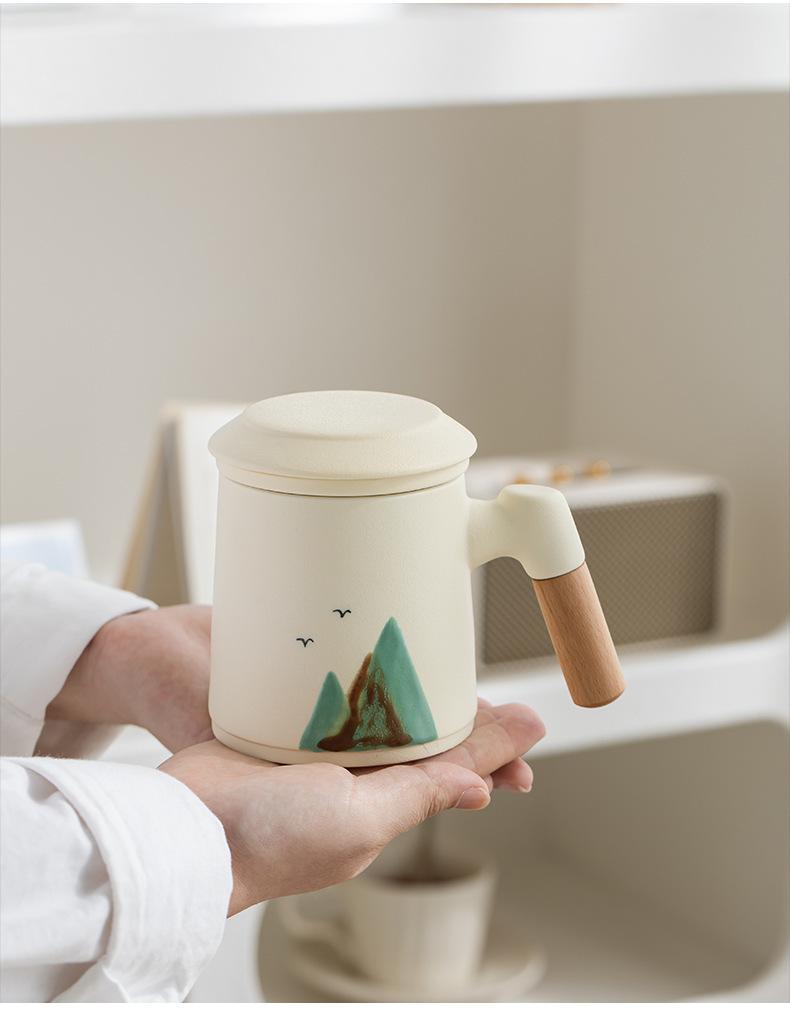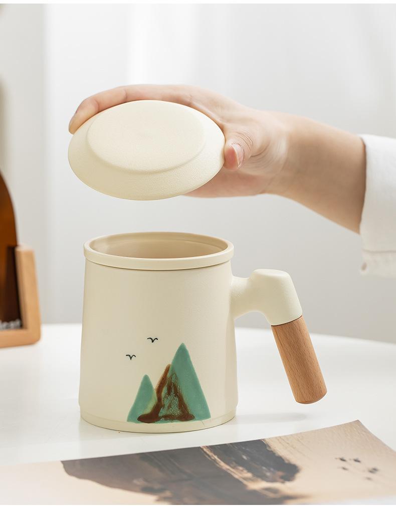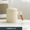 Beige wooden handle stoneware office cup simple, Beige wooden handle stoneware Yuanshan office cup, Beige wood...