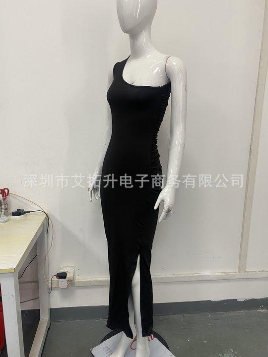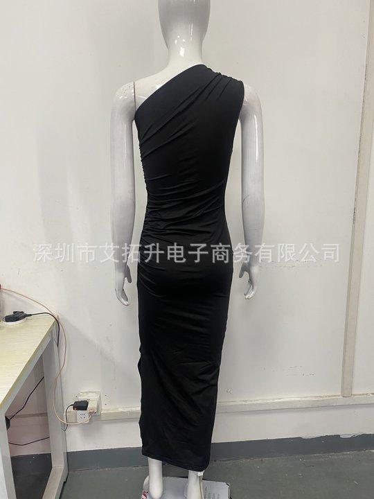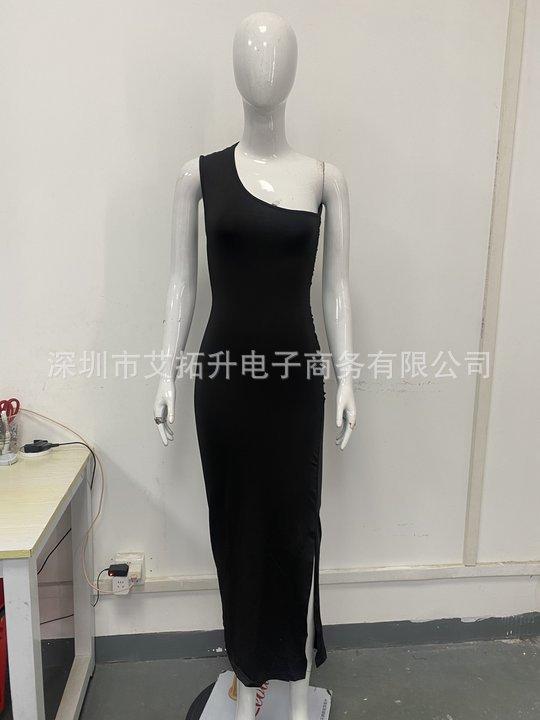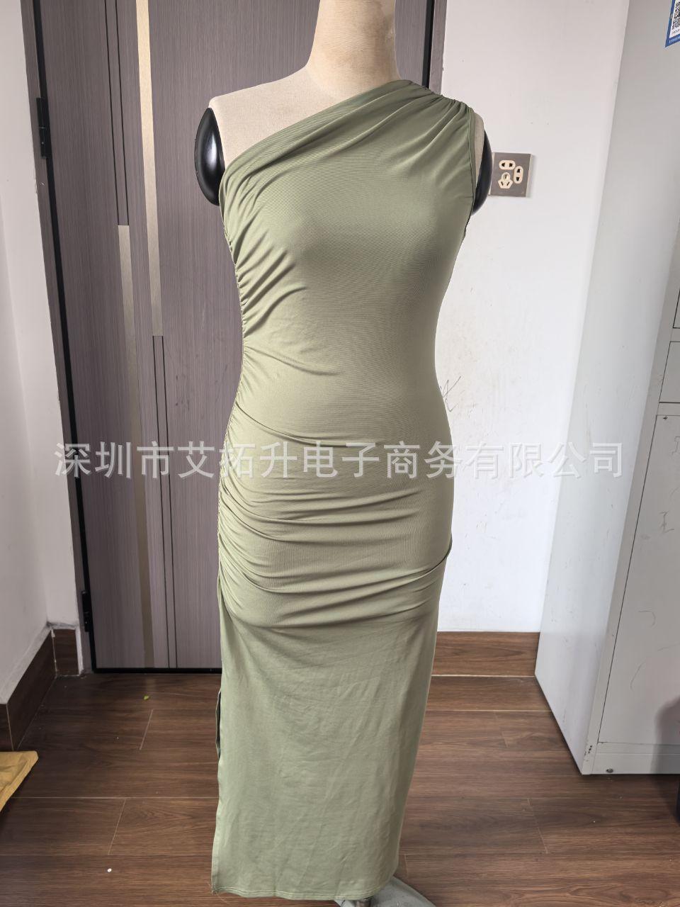 Vestido de Verano 2025 Nuevo Estilo Europeo y Americano Transfronterizo Hombro Inclinado Color Sólido Abertura Moda Sexy Temperamento Ajustado Mujer Venta al por Mayor