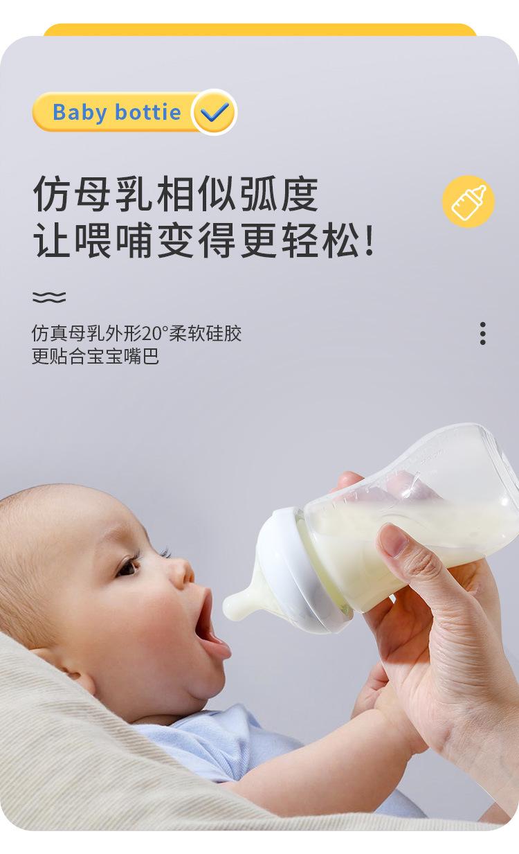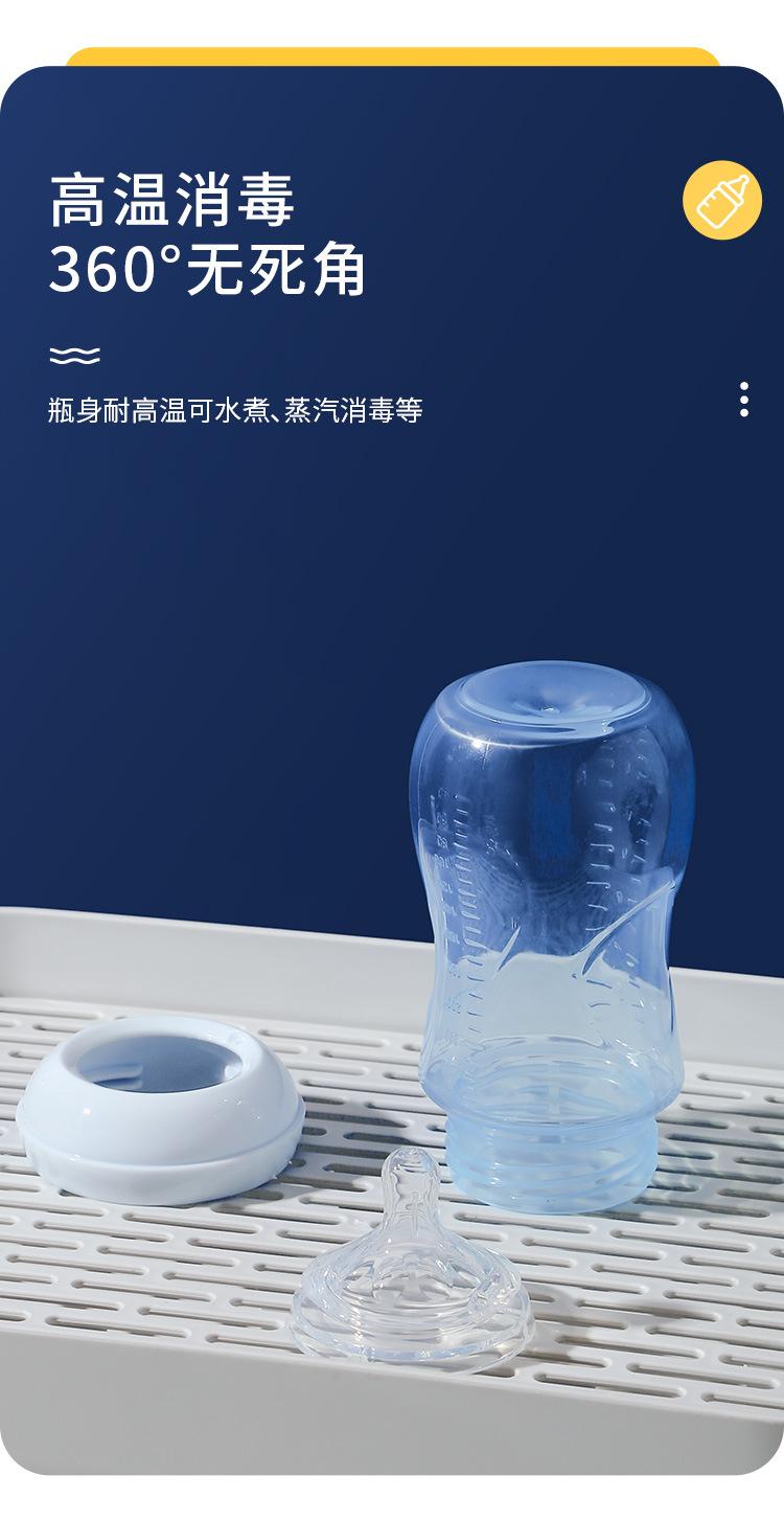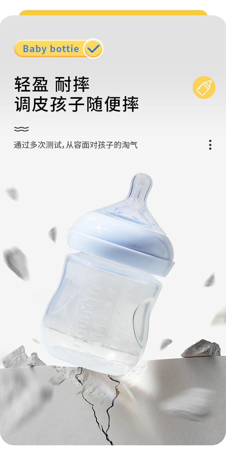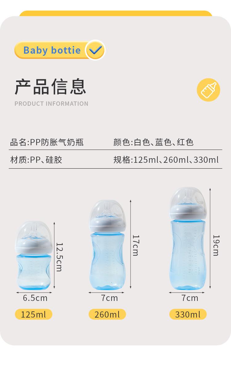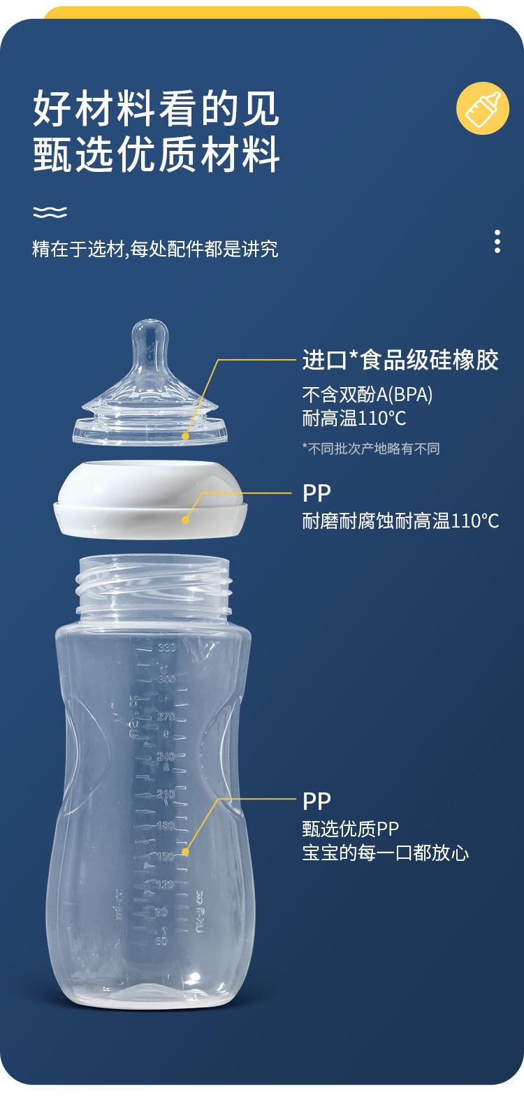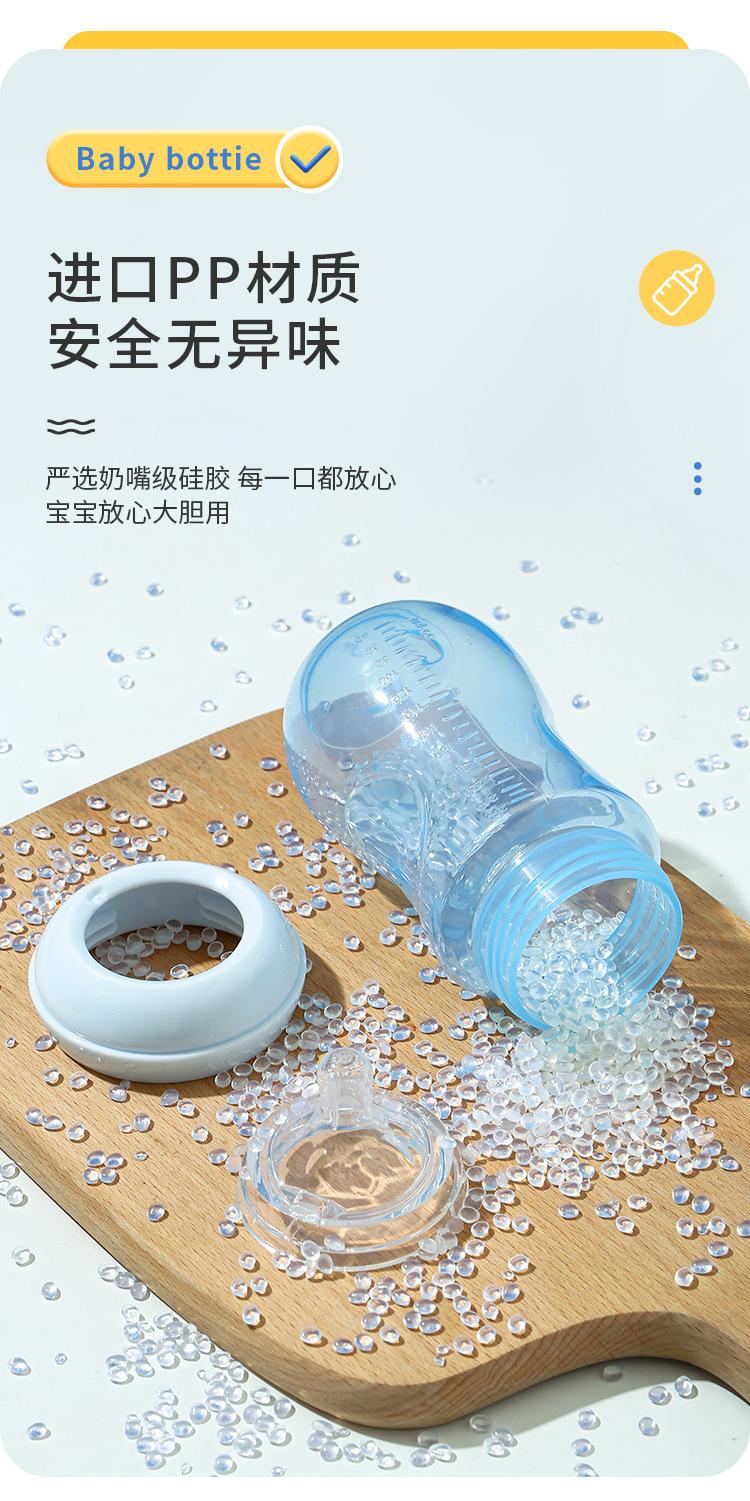 Biberón de polipropileno de boca ancha para bebé, venta directa de fábrica, venta al por mayor, biberón de plástico con asa de mano para madre y bebé.