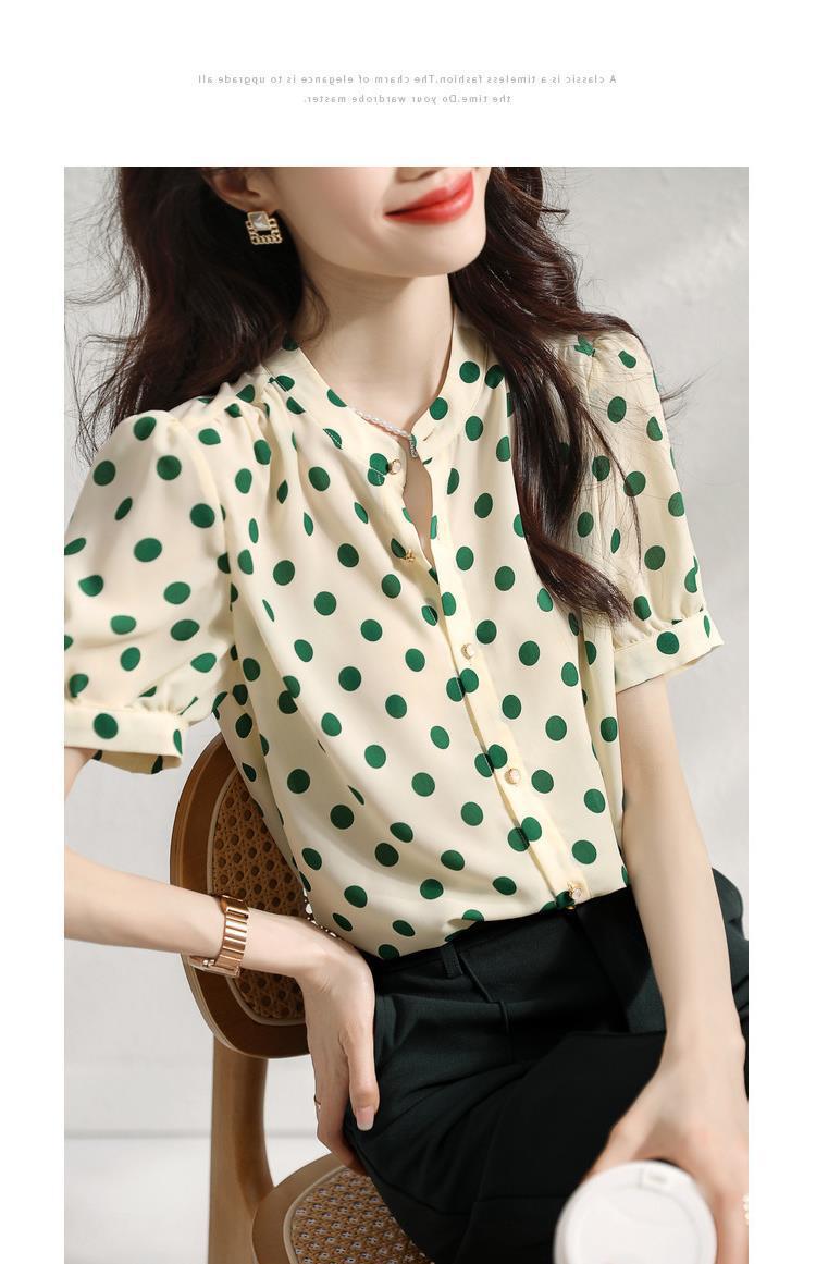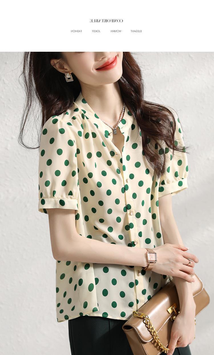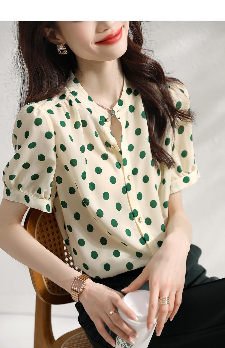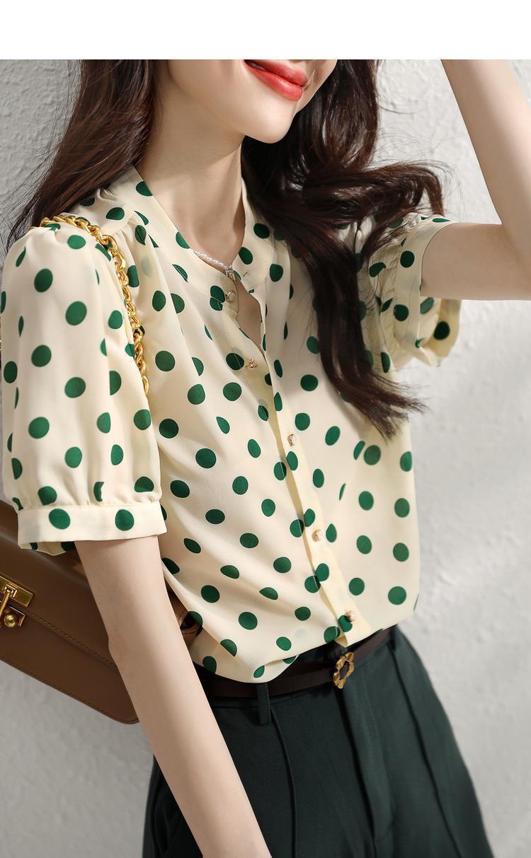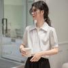 Camisa de Organza de Manga Corta para Mujer Top Francés de Manga Abullonada 2025 Verano Nuevo Camisa de Cuello Alto Holgada y de Alta Gama