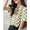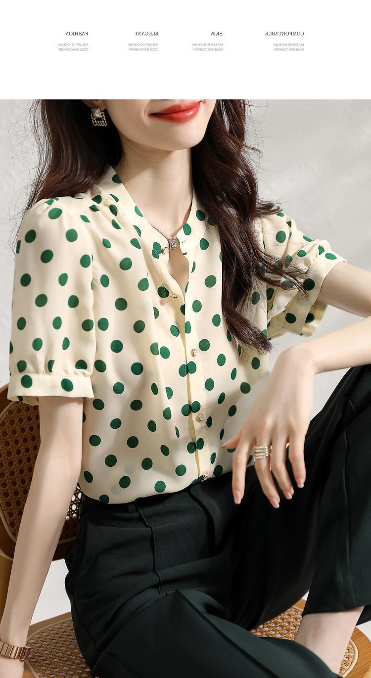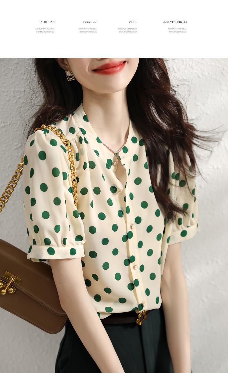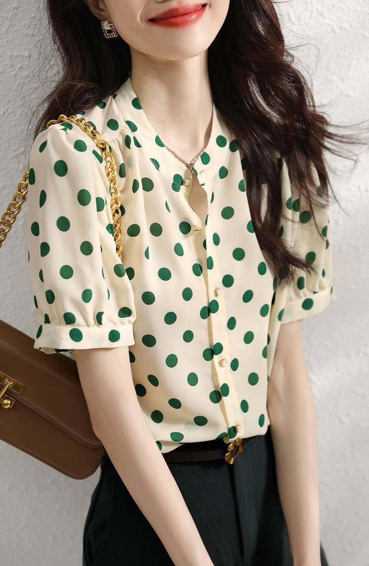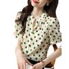 Camisa de Organza de Manga Corta para Mujer Top Francés de Manga Abullonada 2025 Verano Nuevo Camisa de Cuello Alto Holgada y de Alta Gama