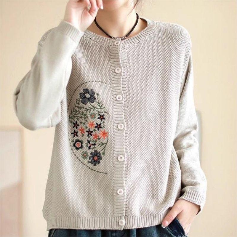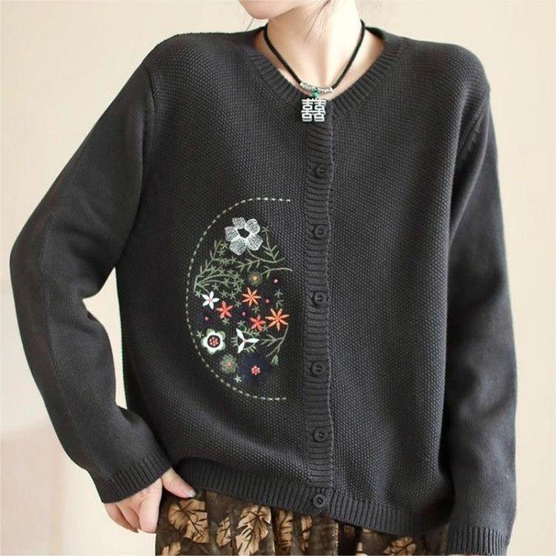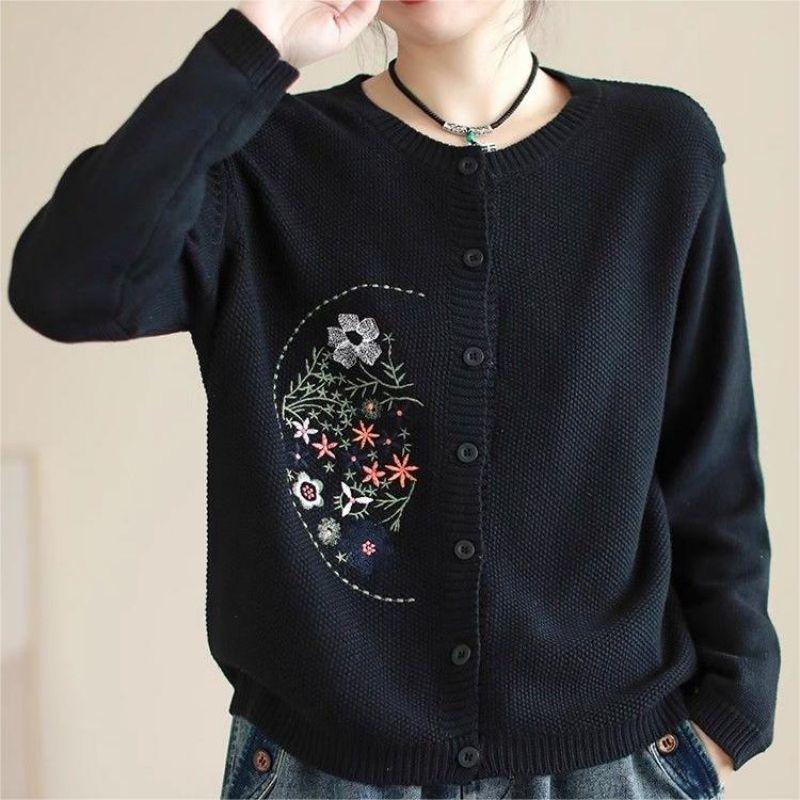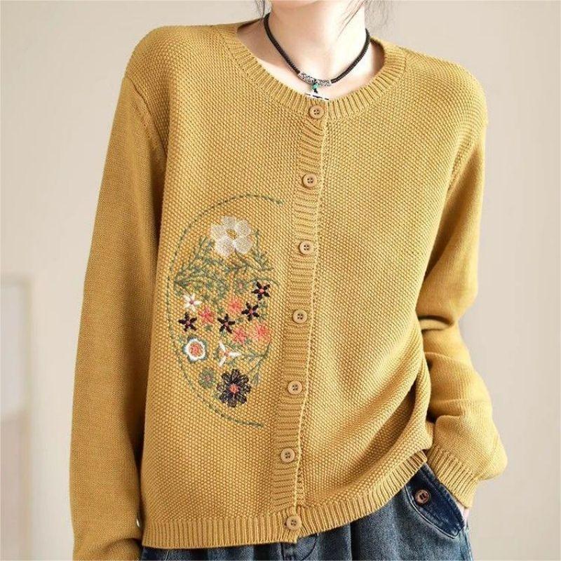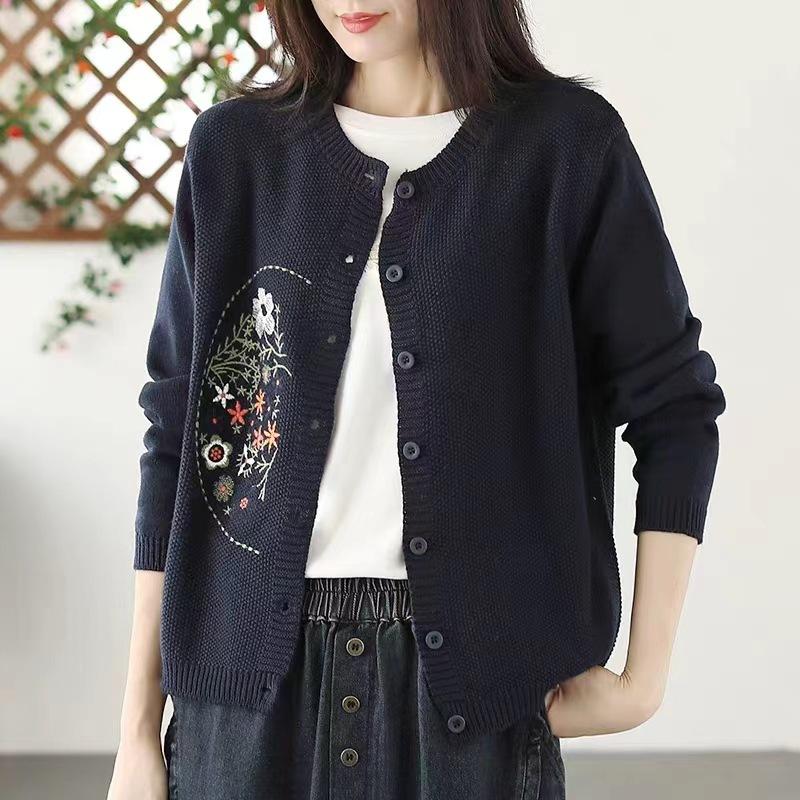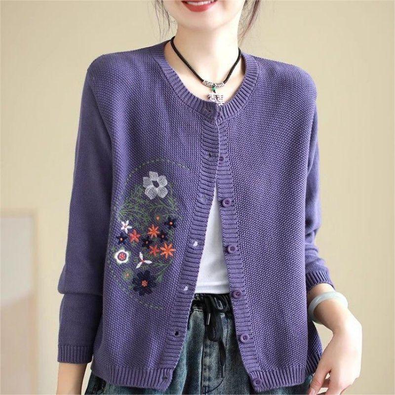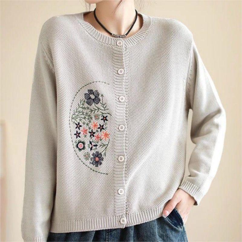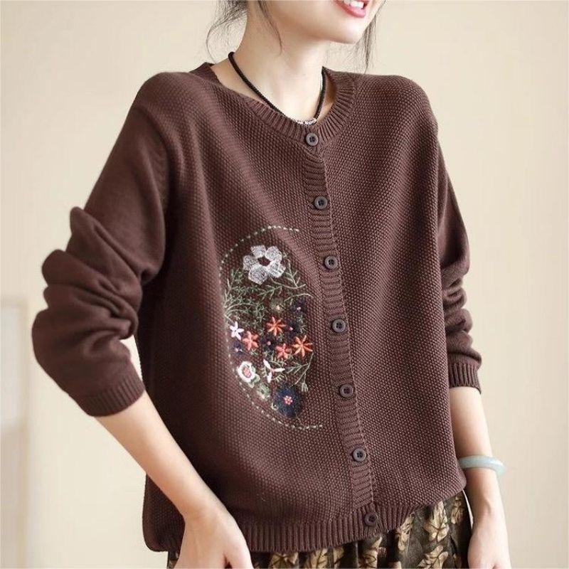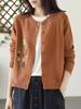 Suéter tipo cárdigan de punto con cuello redondo y bordado fino de primavera, estilo retro que combina con todo.