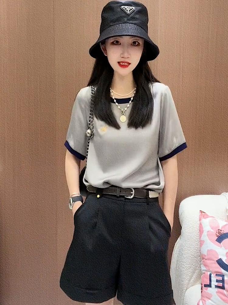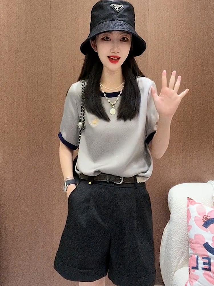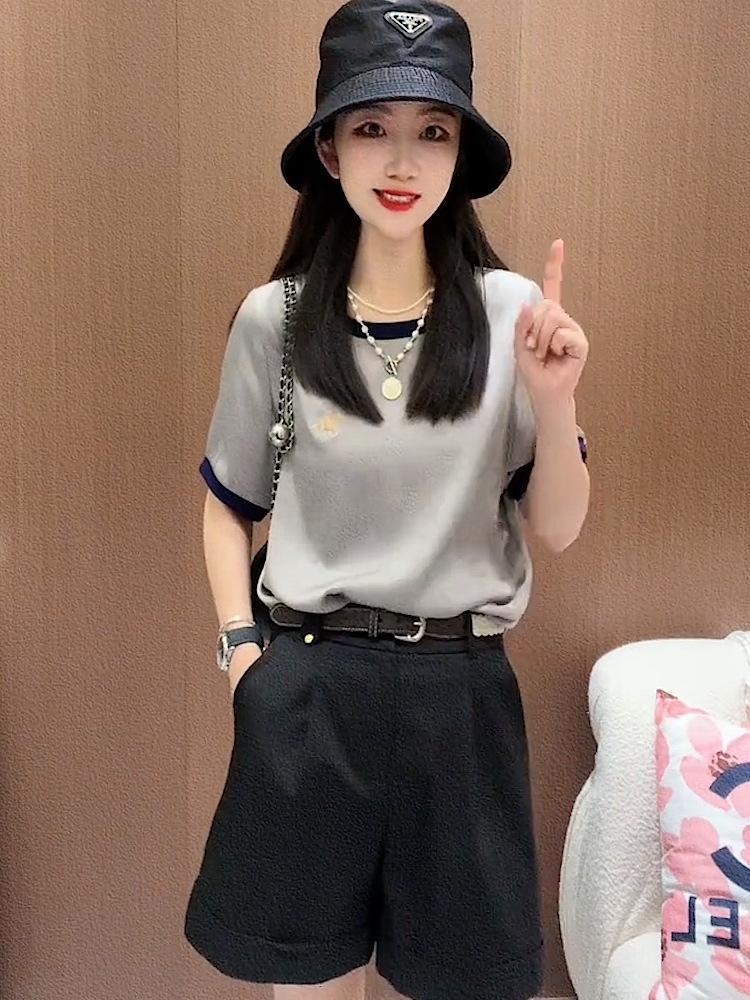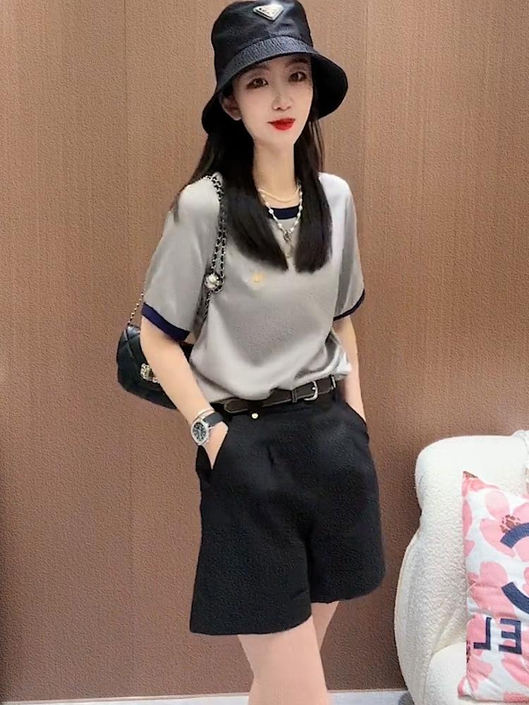 Traje de moda informal de verano, fino, holgado, de colores a juego, cuello redondo, manga corta, top de dos piezas para mujer