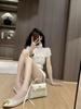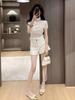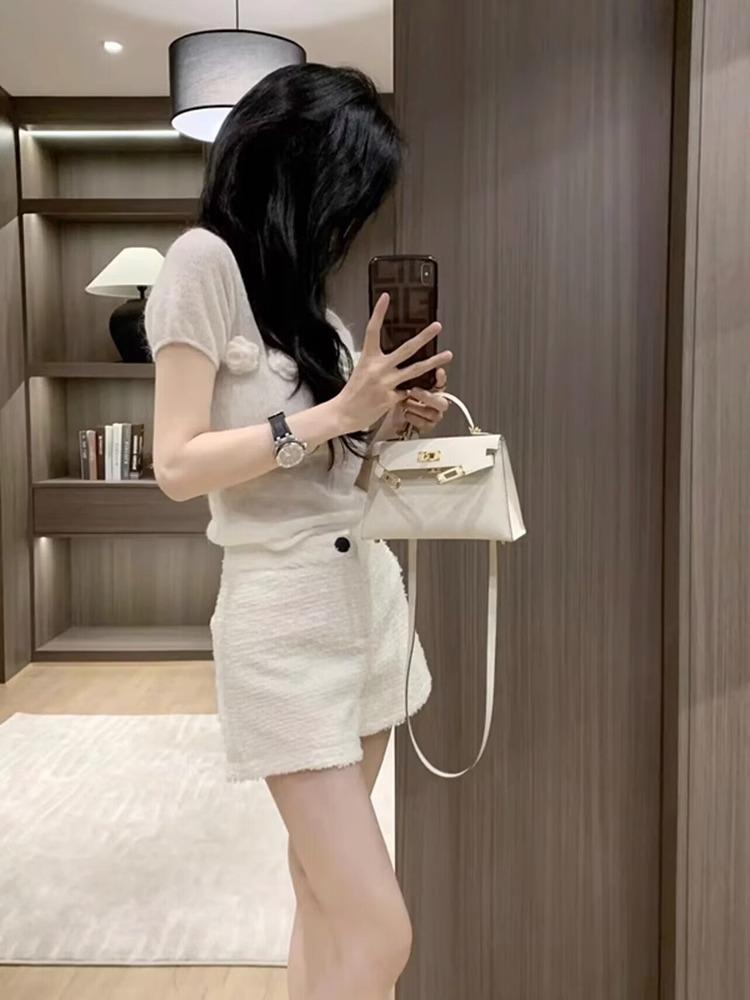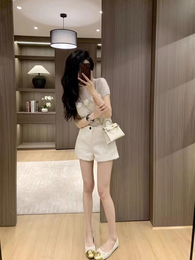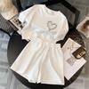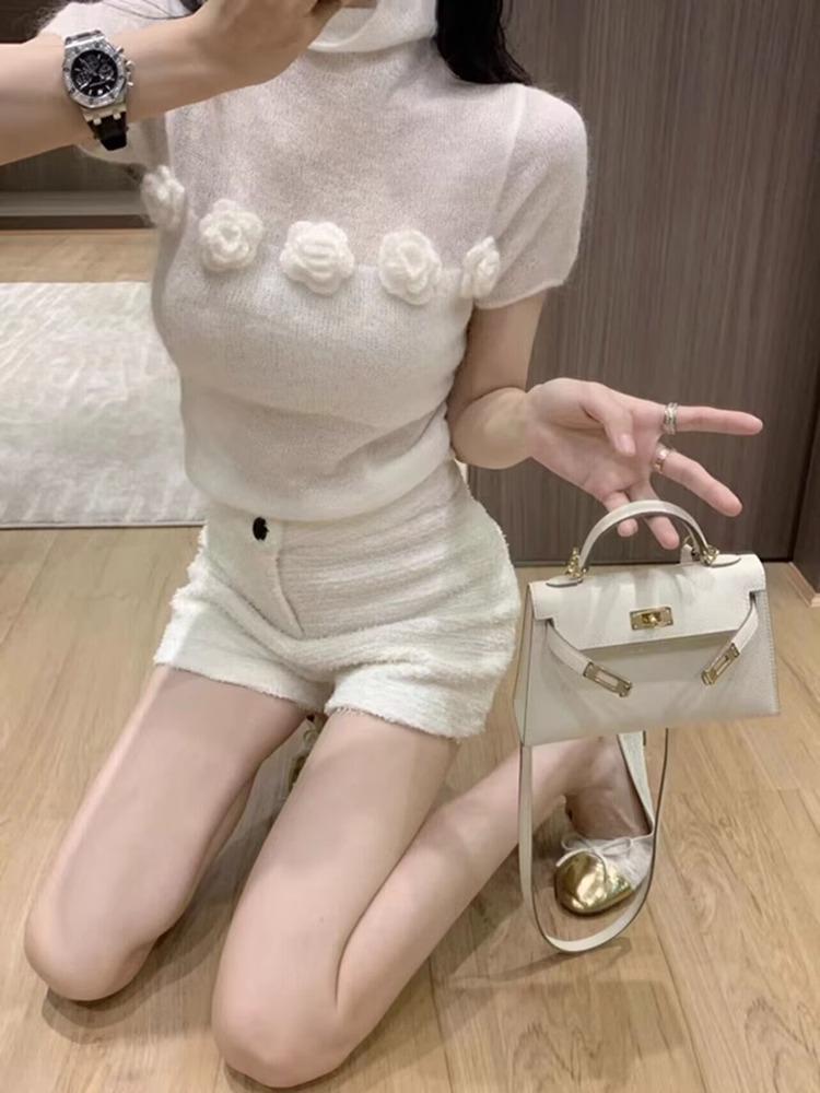 Suéter elegante de manga corta, hermoso traje para mujer, nuevo verano 2023, estilo occidental de moda, pantalones cortos antiedad, conjunto de dos piezas