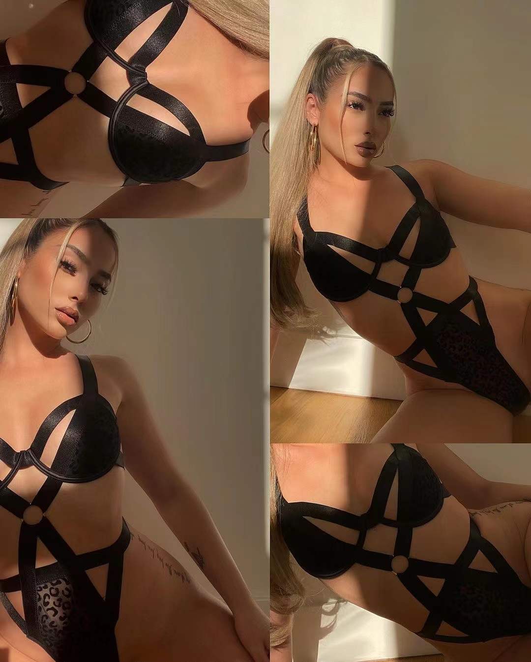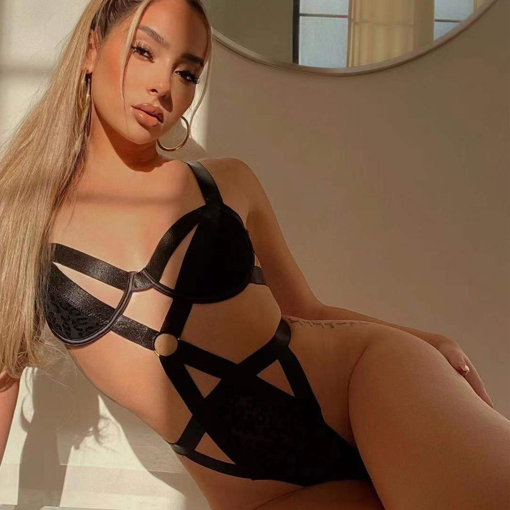 Estilo Europeo y Americano Lencería Sexy Estilo Atado Estampado de Leopardo Negro Recorte Hebilla Metálica Body Sexy
