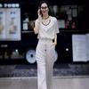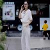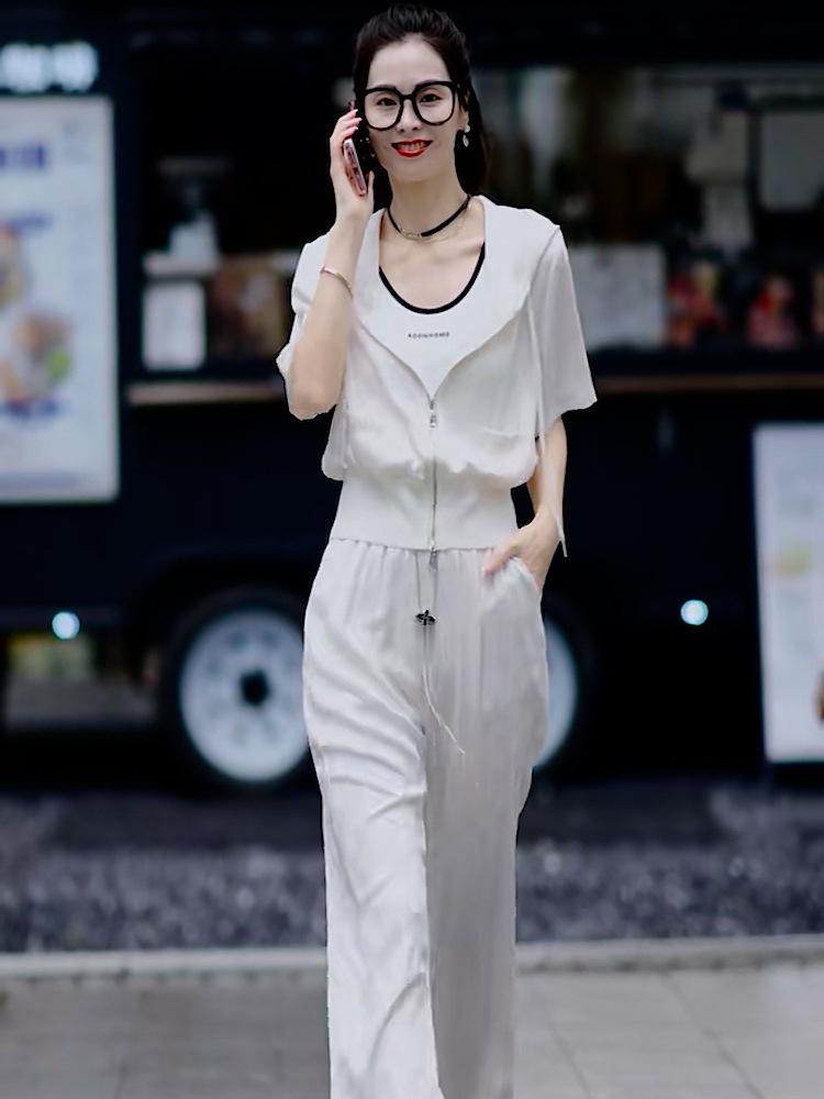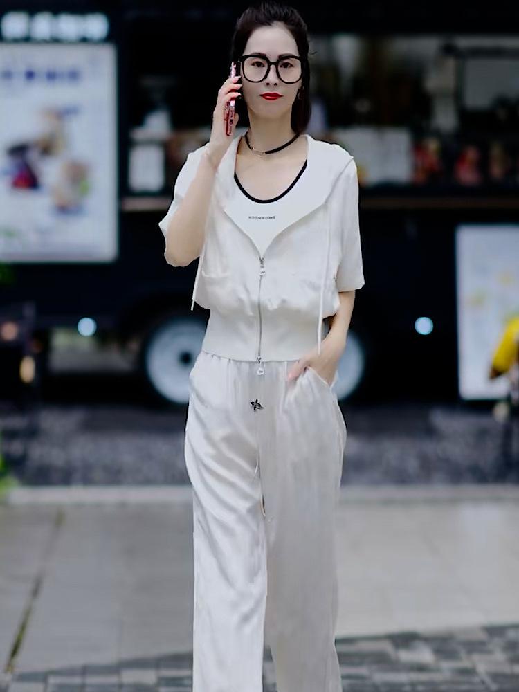 Traje casual de moda simple, verano 2024, nuevo cárdigan blanco con capucha y cremallera, manga corta, ropa de dos piezas para mujer