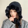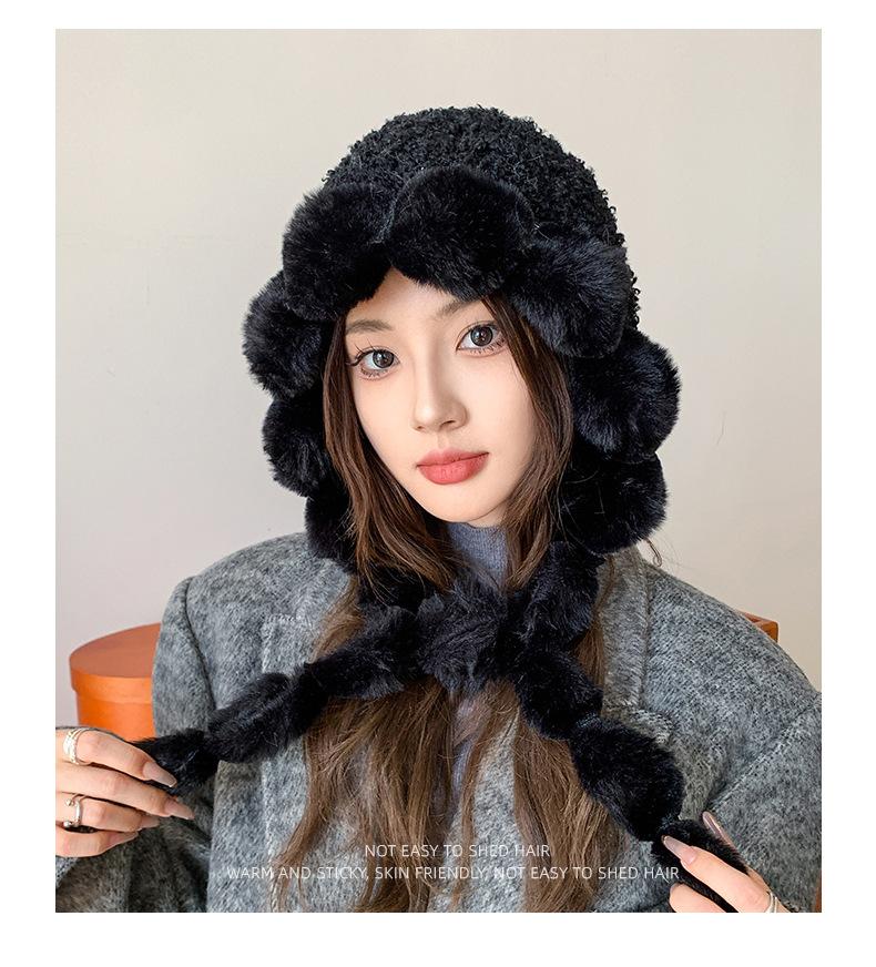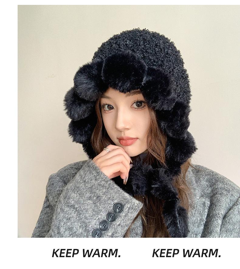 Gorro de punto de bola de lana de felpa gruesa y cálida para mujer, nuevo estilo coreano, con orejeras de felpa para otoño e invierno, resistente al frío, gorro Lei Feng |