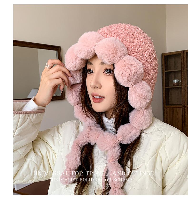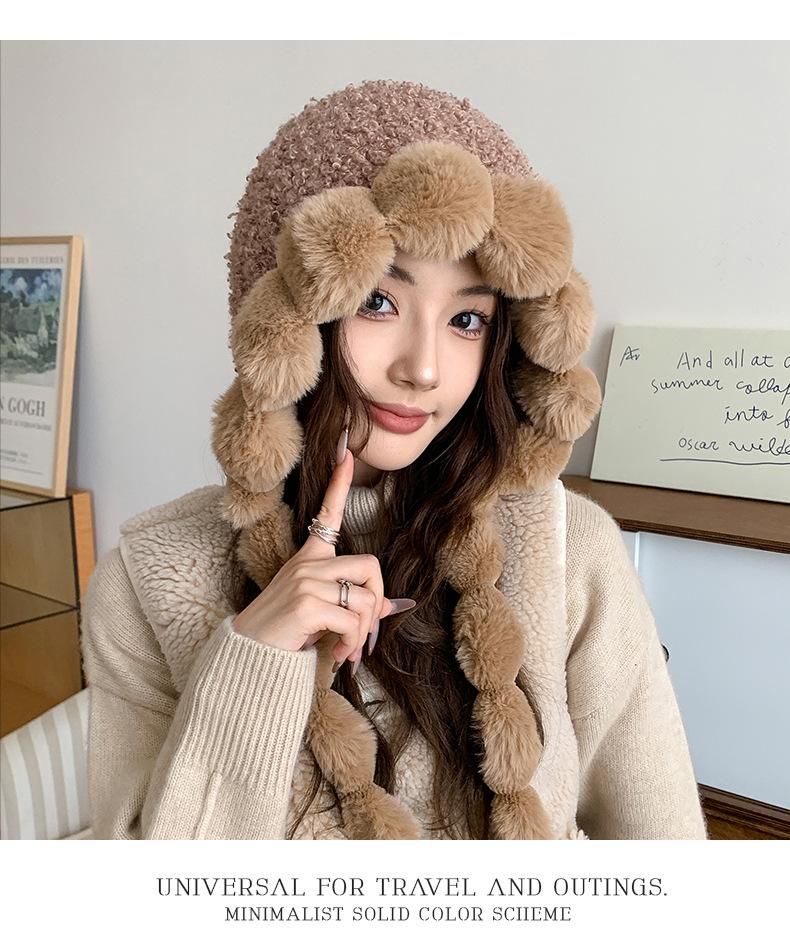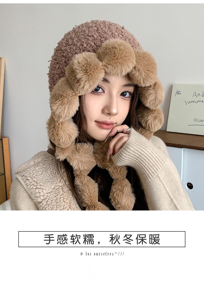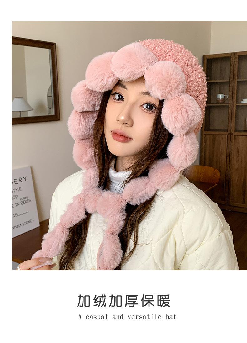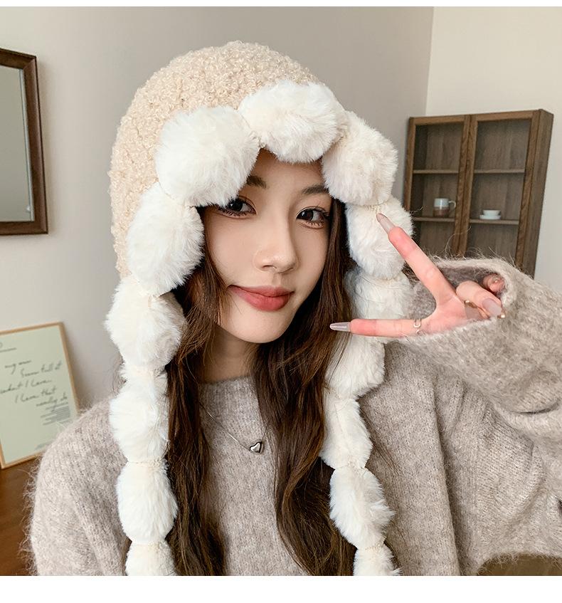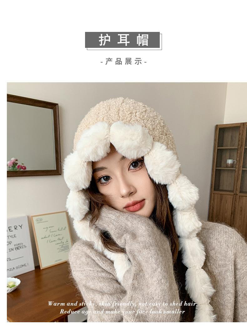 Versión coreana del gorro Lei Feng con correa de bola de pelo y costuras a juego para mujer, para ciclismo de otoño e invierno, además de gorro de terciopelo cálido y protector contra el frío. |