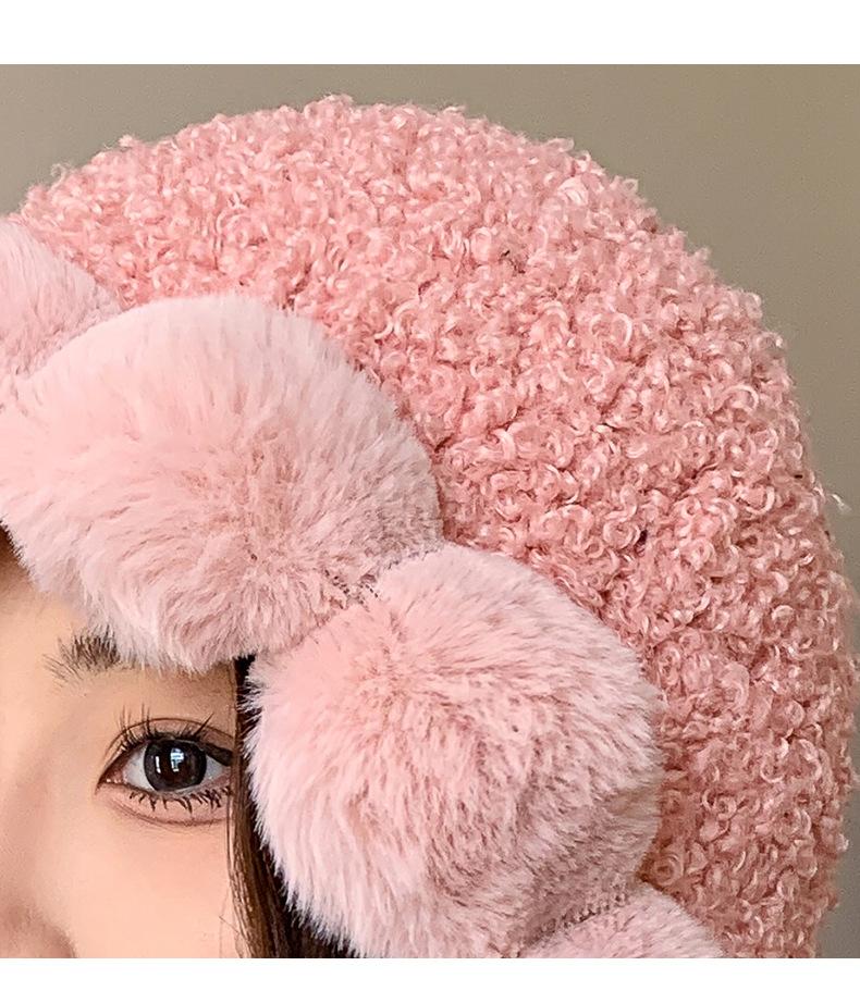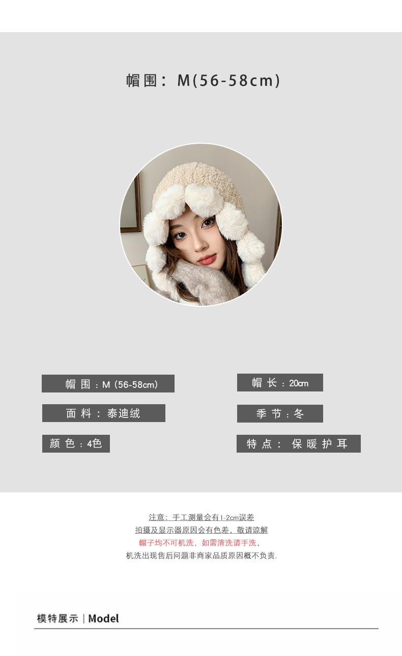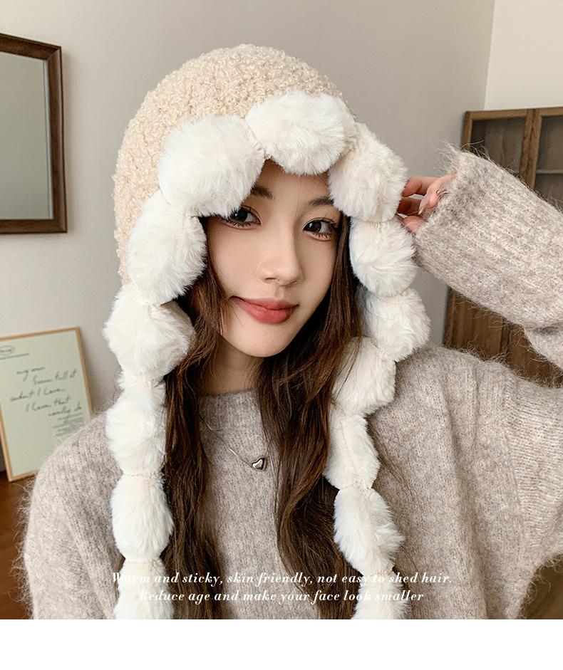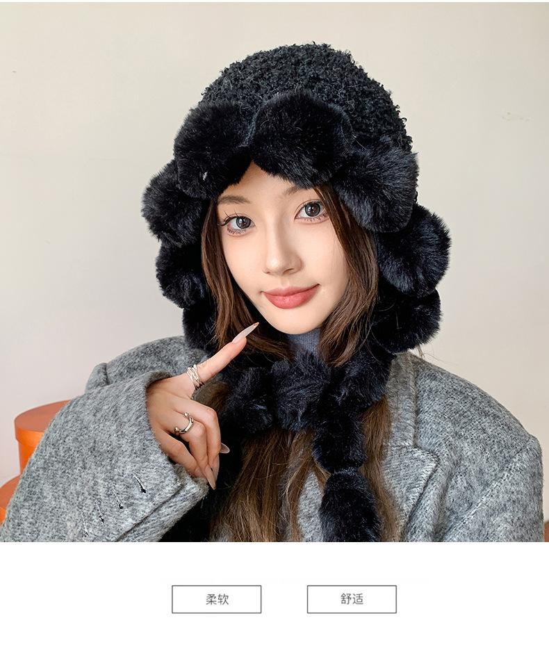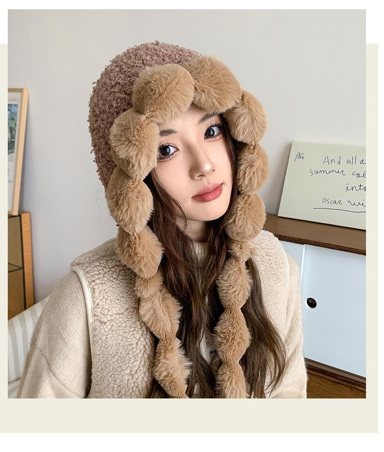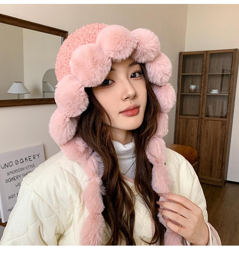 Versión coreana del gorro Lei Feng con correa de bola de pelo y costuras a juego para mujer, para ciclismo de otoño e invierno, además de gorro de terciopelo cálido y protector contra el frío. |