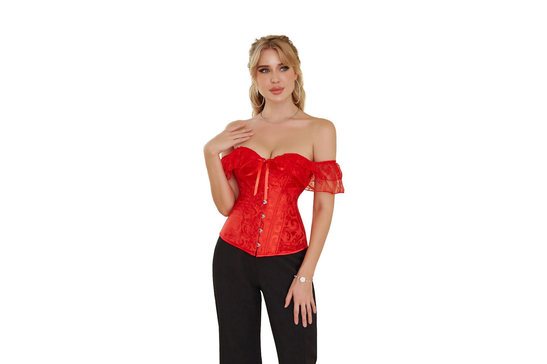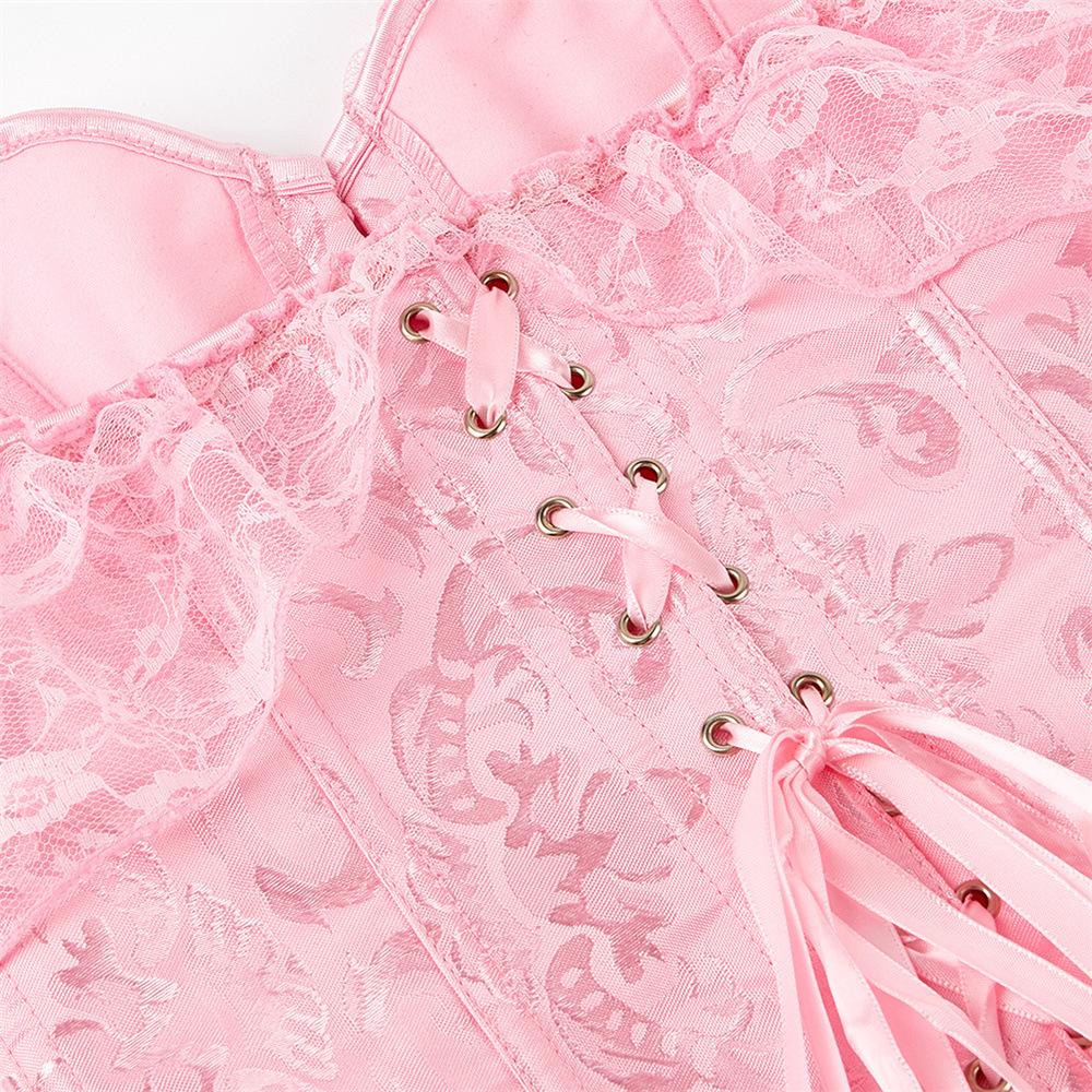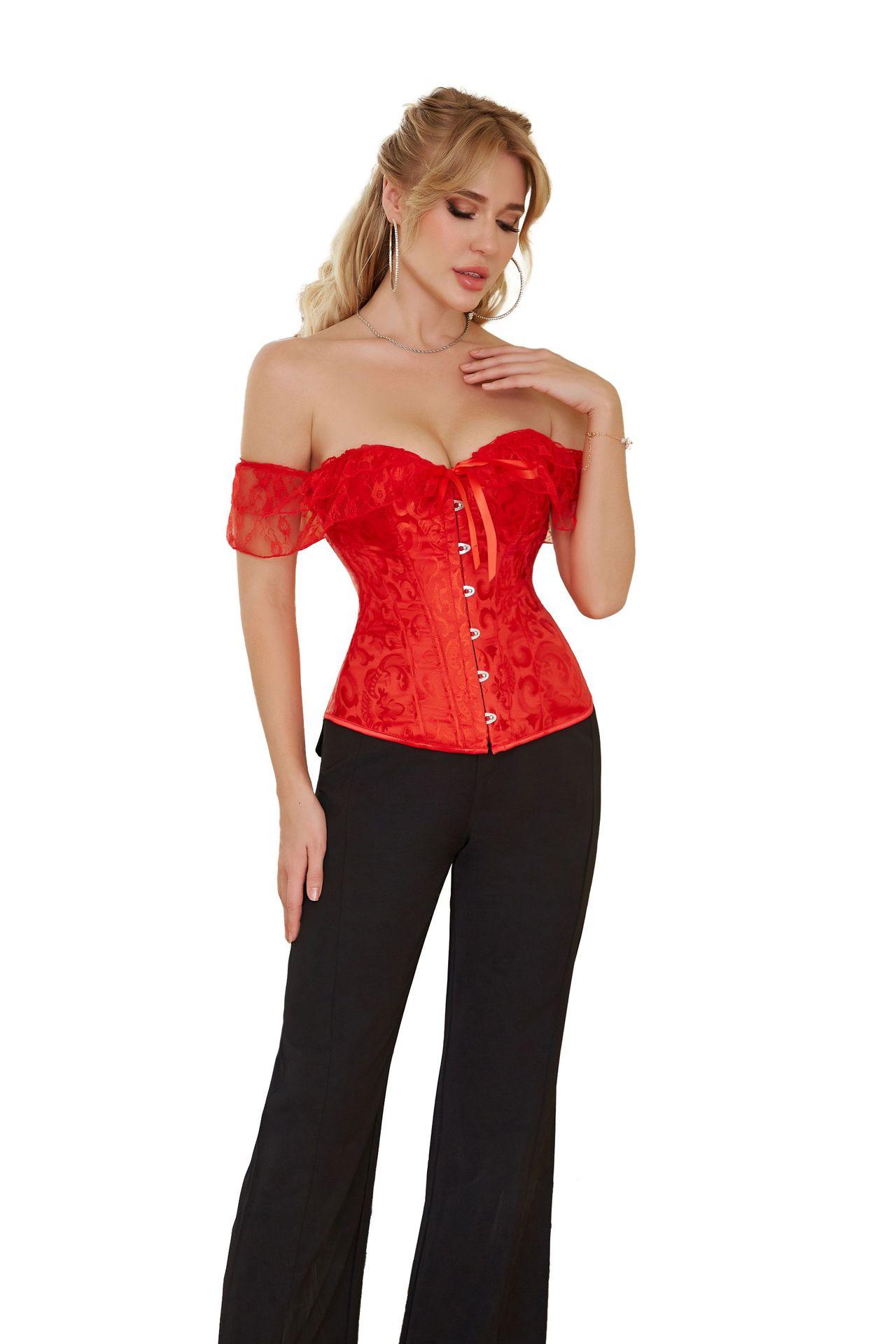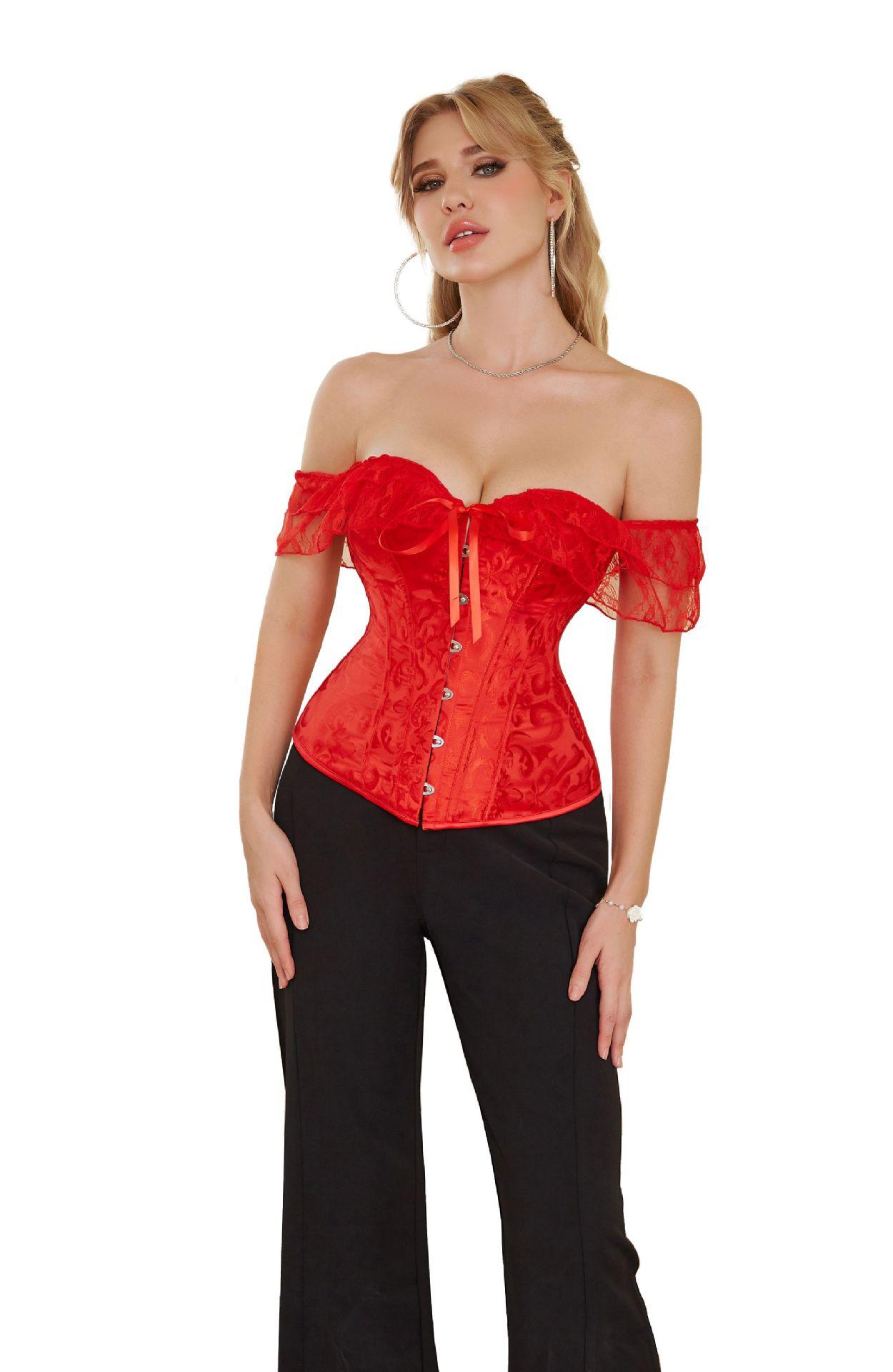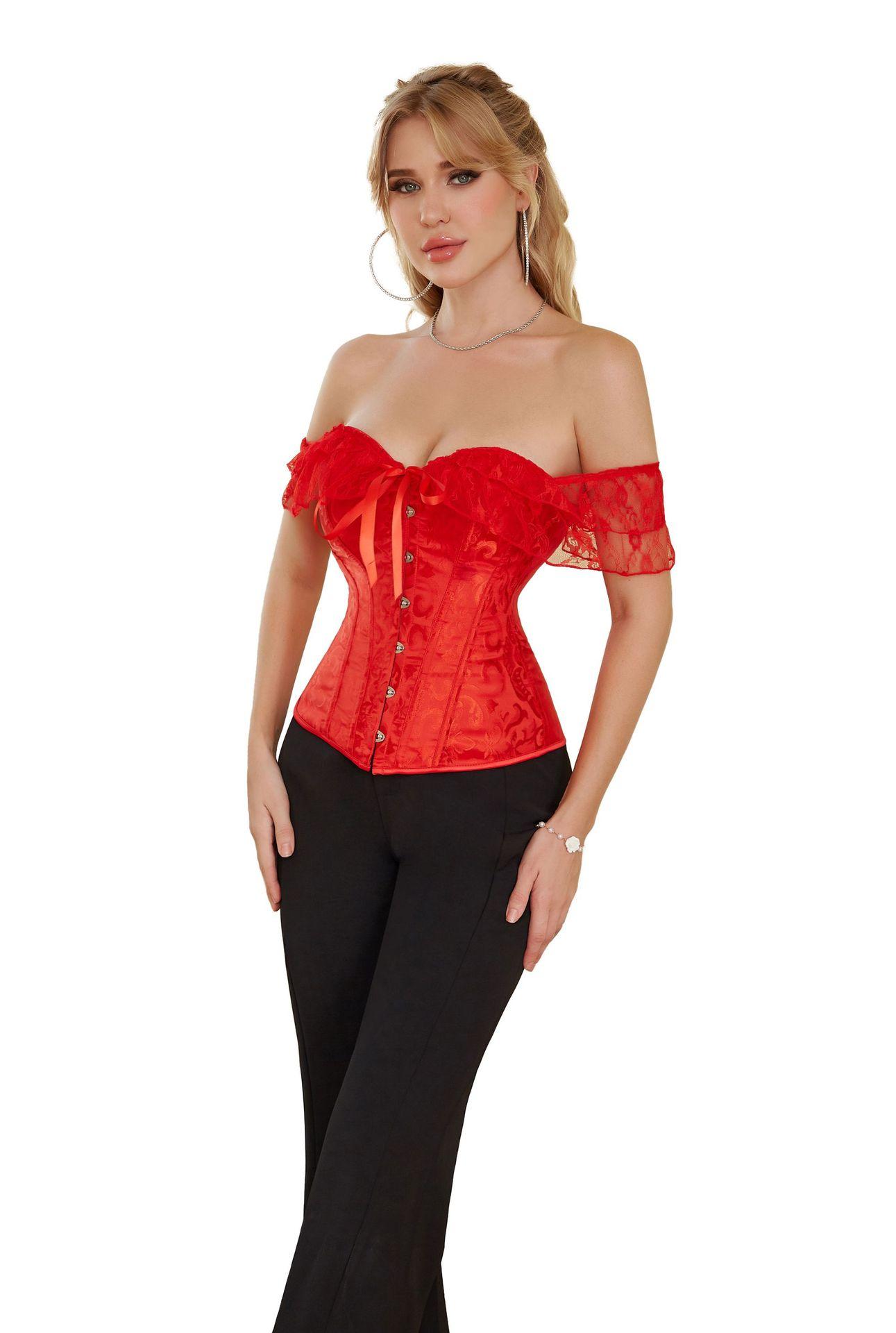 El corsé para mujer presenta mangas cortas con cordones, corsé fuera del hombro, espalda ajustable con cordones y panel de modestia ancho para expandir el corsé y proteger la piel de la espalda. Este corsé con cordones es una buena opción para moldear la figura.