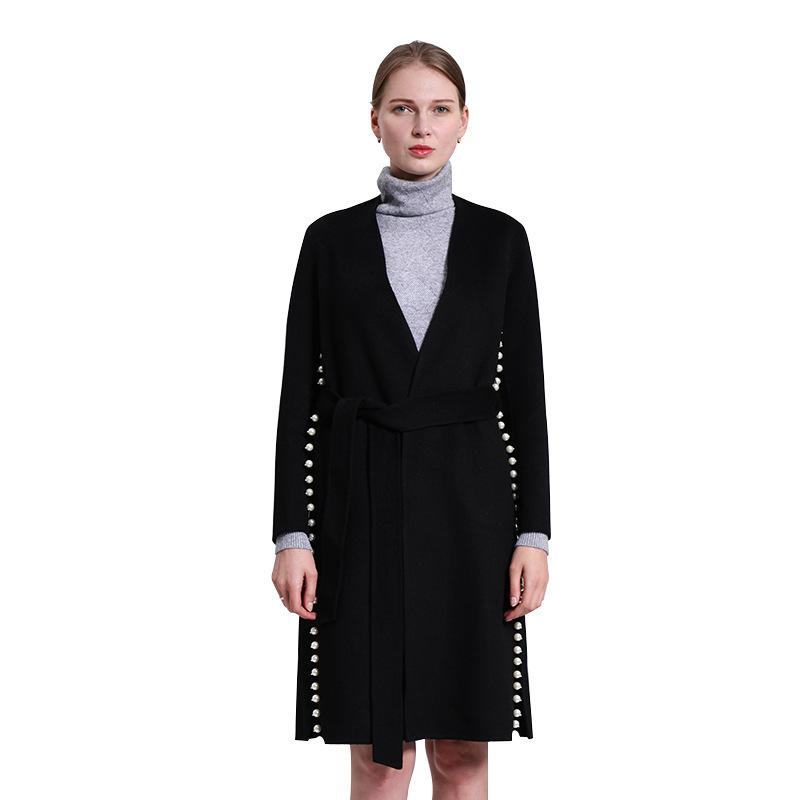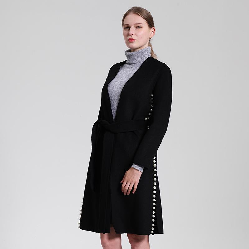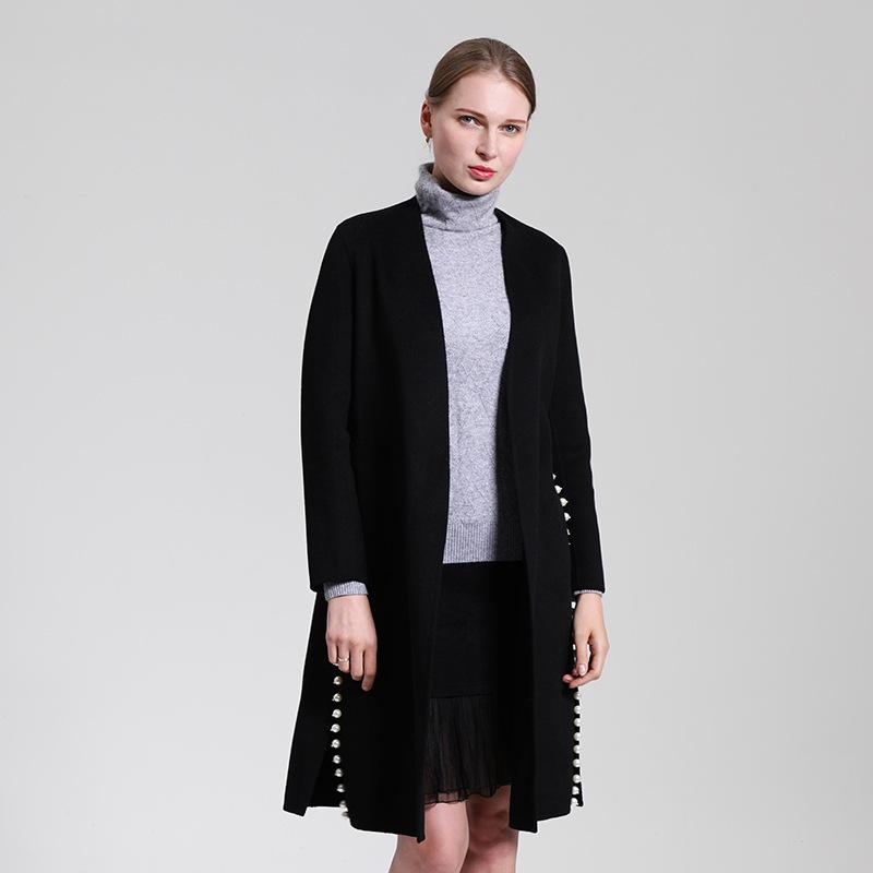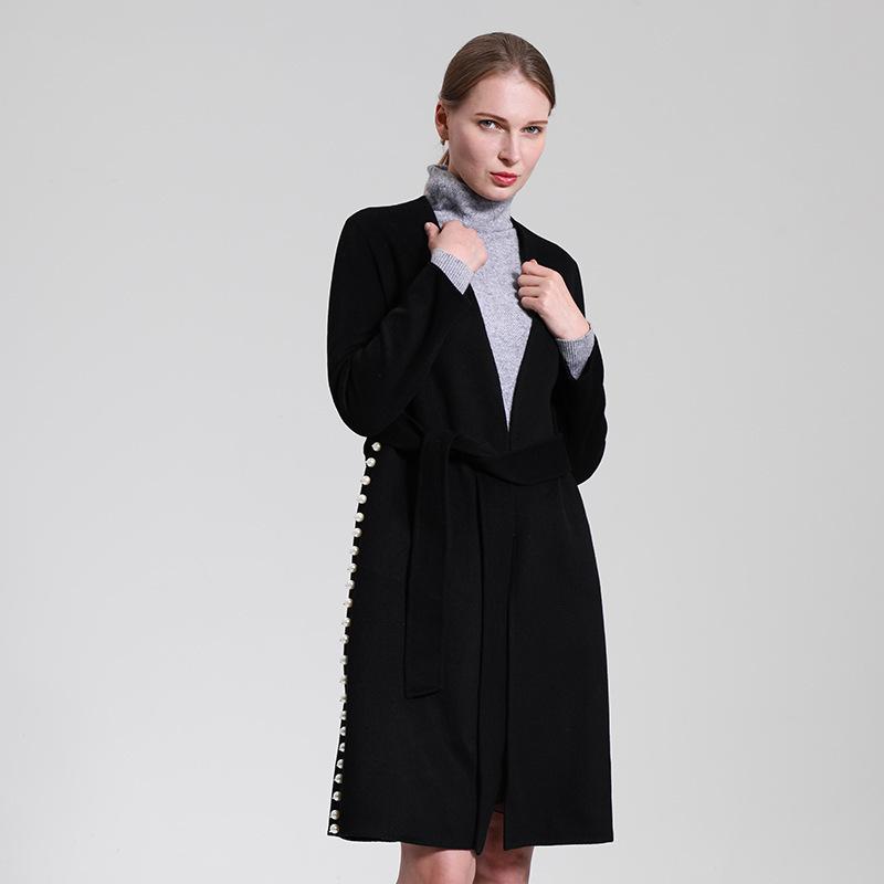 Abrigo de Cachemira de Perla Negra de Doble Vista para Mujer Otoño e Invierno 2025 Chaqueta de Lana Negra Cortavientos de Largo Medio para Mujer
