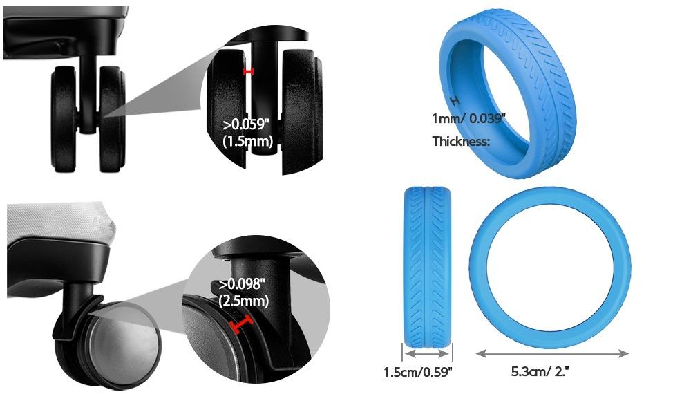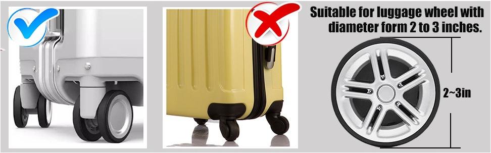 Coincidencia de tamaño: Antes de comprar, verifique siempre si su maleta tiene ruedas dobles, y si el tamaño de las ruedas y la distancia entre las ruedas y los ejes y guardabarros coinciden con los requisitos de tamaño de nuestras maletas.
