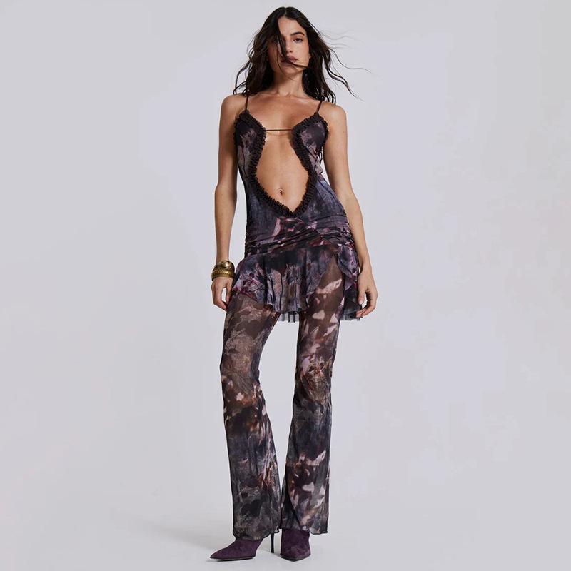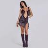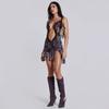 Ropa Europea y Americana Transfronteriza Sexy Hottie Sin Mangas Tirantes Patrón Malla Ombligo Expuesto Elegante Cintura Alta Ajustado Vestido Verano