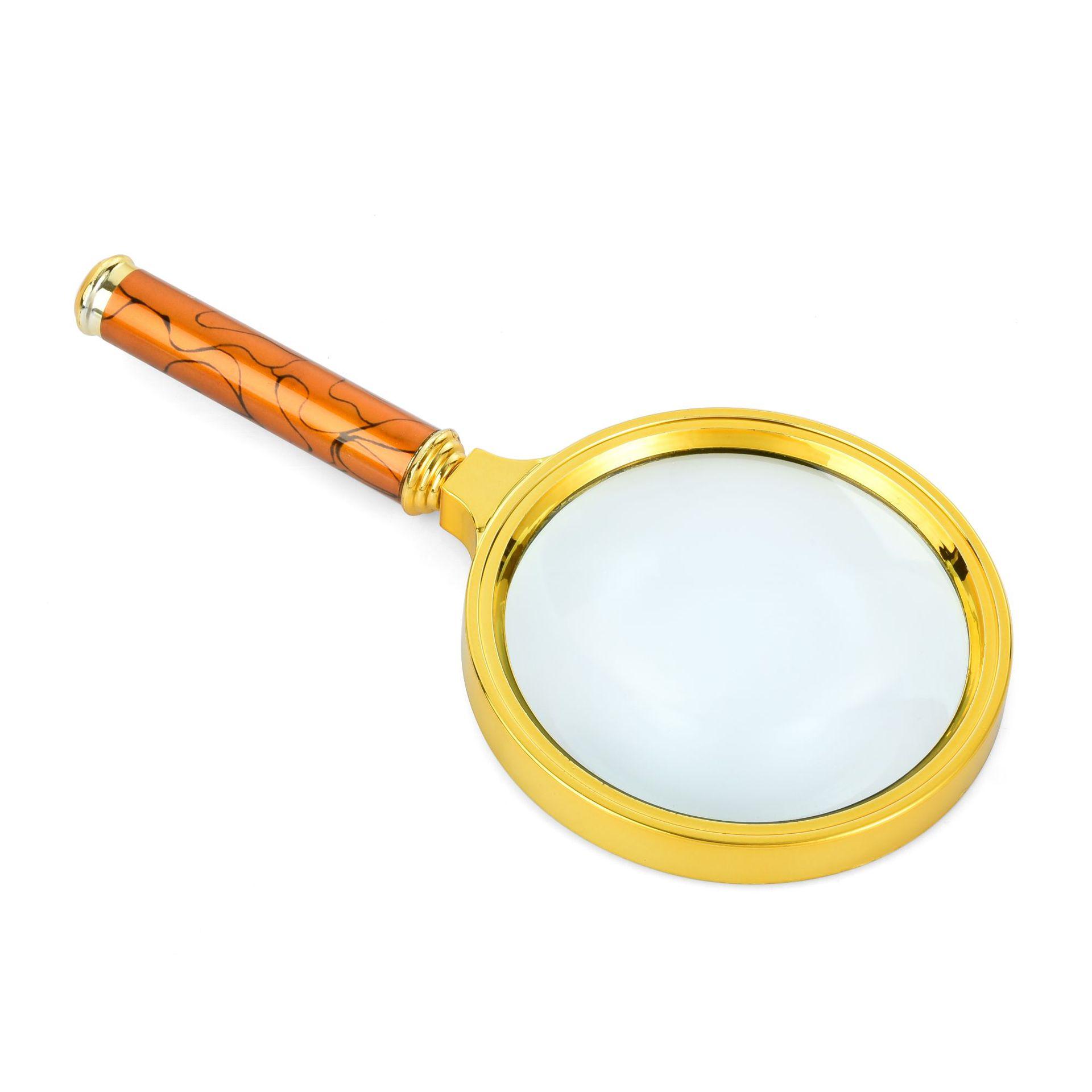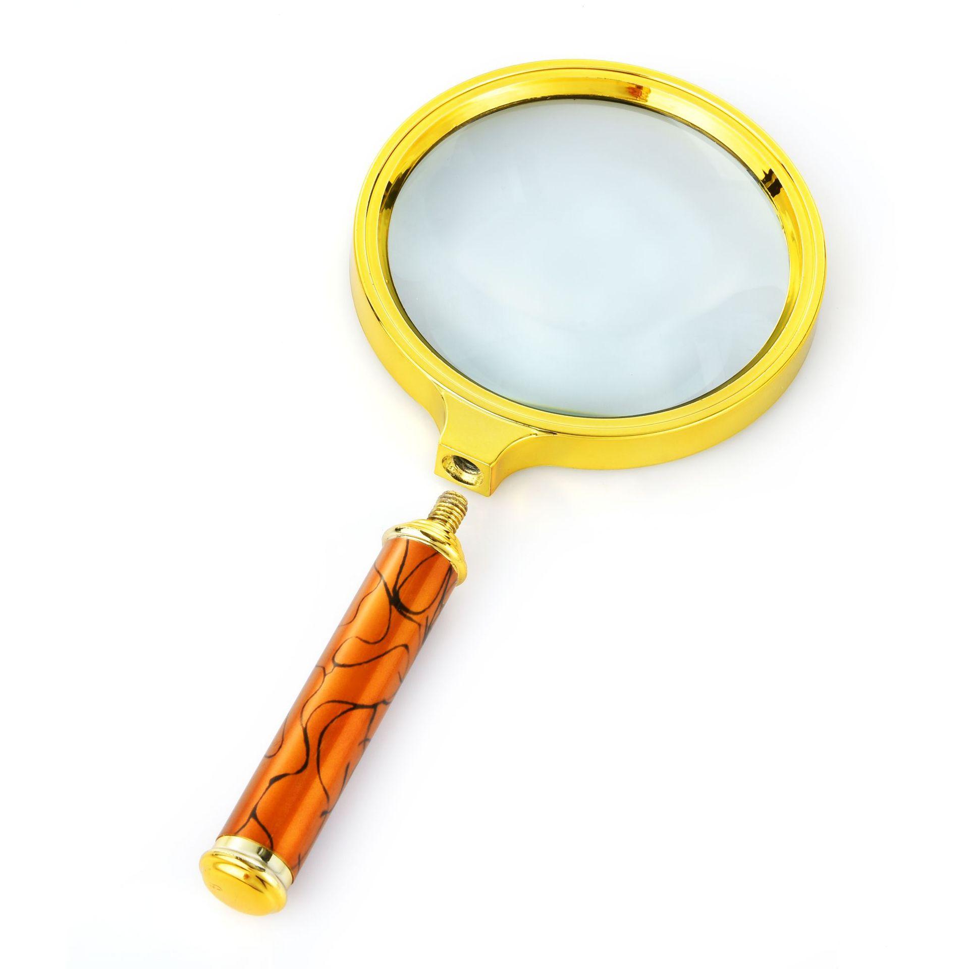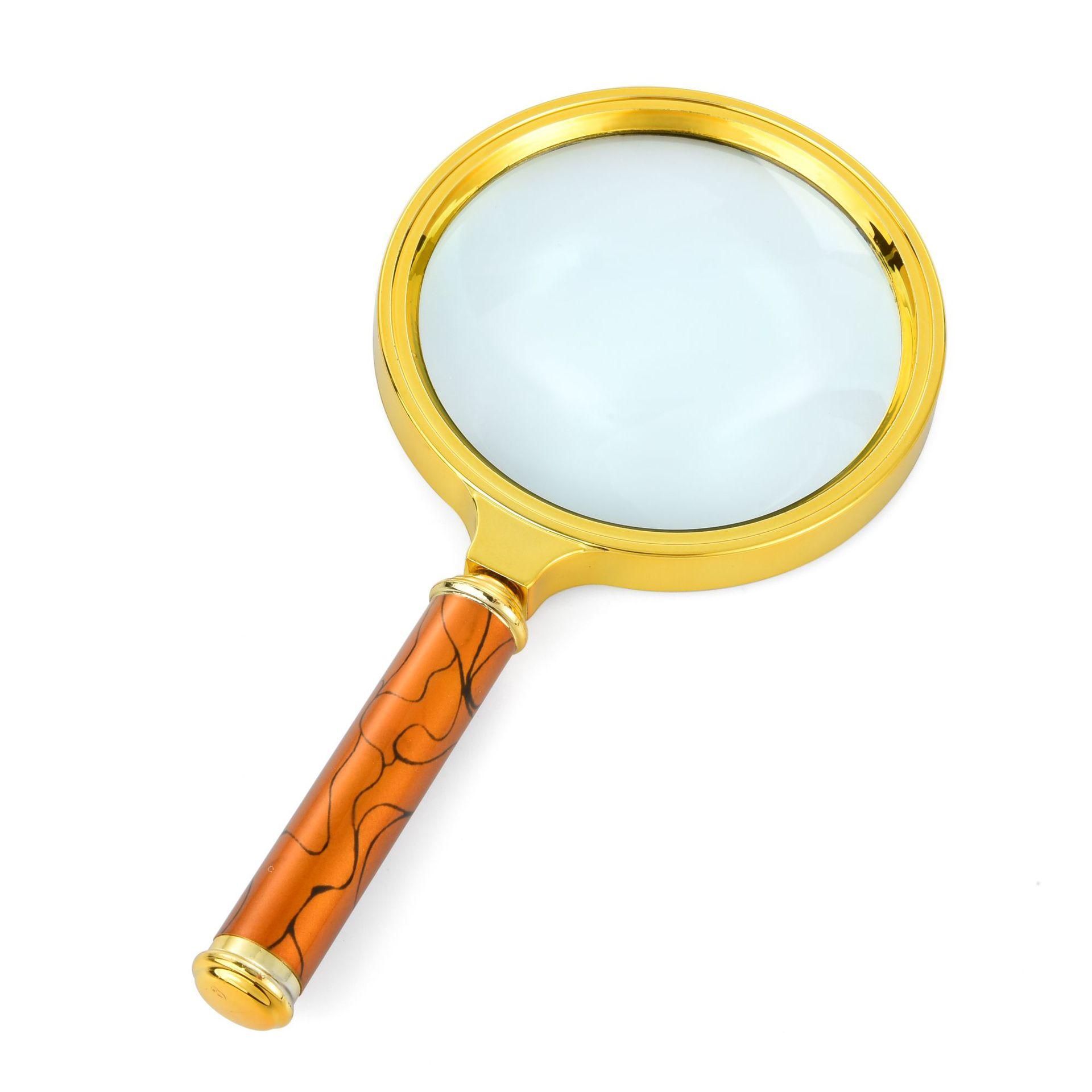 Lupa de cristal de alta definición y alta potencia con mango colorido, pintura galvanizada y mango de metal.