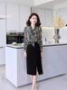 2023 Nueva Moda Elegante y Delgada Top de Leopardo con Flores con Pantalones de Pierna Ancha Falda de Dos Piezas Traje de Otoño en Otoño